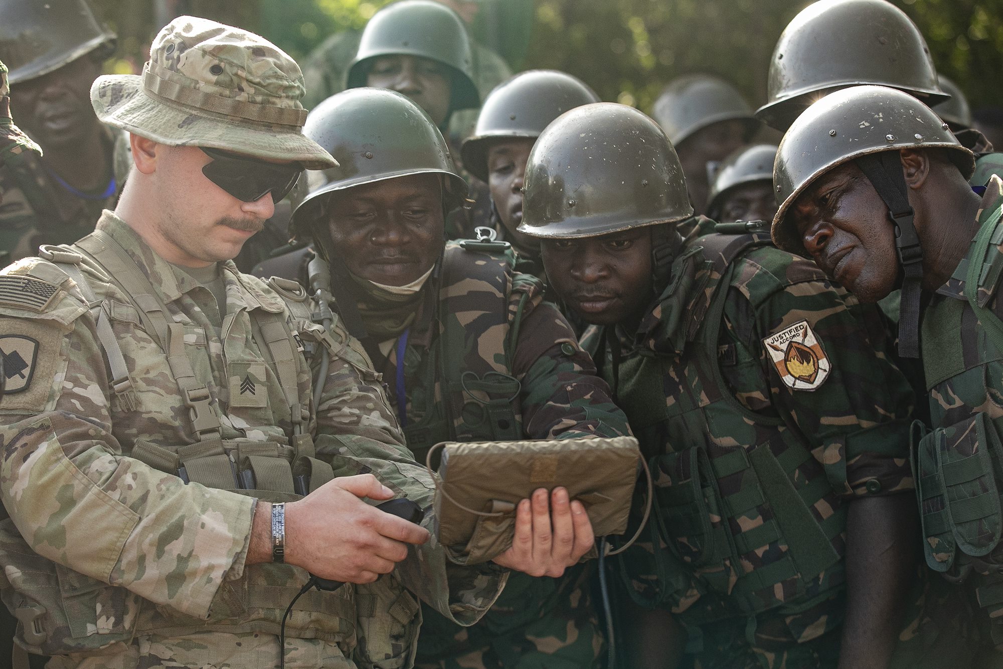 U.S. Army soldiers of the the East Africa Response Force (EARF), assigned to Combined Joint Task Force – Horn of Africa (CJTF-HOA), U.S. Army Southern European Task Force, Africa (SETAF-AF) soldiers, and the Tanzania People’s Defense Force (TPDF) discuss training objectives during day three of exercise Justified Accord 2025 (JA25) at Msata Military Training Base, Msata, Tanzania, Feb. 13, 2025. JA25 is the premier U.S. Africa Command (USAFRICOM) exercise in East Africa, designed to enhance multinational combat readiness, strengthen crisis response capabilities and empower allies and partners in the region. Led by U.S. Army Southern European Task Force, Africa (SETAF-AF) and hosted in Kenya, Djibouti and Tanzania, JA25 integrates high-intensity training scenarios that sharpen warfighting skills, increase operational reach and enhance the ability to execute complex joint and multinational operations. The exercise runs from Feb. 10–21, 2025. (U.S. Army photo by Sgt. Michael Knight)