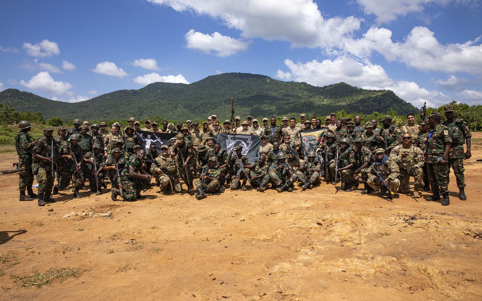 Leaders from U.S. Army Soldiers of the East Africa Response Force (EARF), assigned to Combined Joint Task Force – Horn of Africa (CJTF-HOA), U.S. Army Southern European Task Force, Africa (SETAF-AF) soldiers, and the Tanzania People’s Defense Force (TPDF) pose for a photo during the opening ceremony for the multinational exercise Justified Accord 2025 (JA25) at Msata Military Training Base, Msata, Tanzania, Feb. 11, 2025. JA25 is the premier U.S. Africa Command (USAFRICOM) exercise in East Africa, designed to enhance multinational combat readiness, strengthen crisis response capabilities and empower allies and partners in the region. Led by U.S. Army Southern European Task Force, Africa (SETAF-AF) and hosted in Kenya, Djibouti and Tanzania, JA25 integrates high-intensity training scenarios that sharpen warfighting skills, increase operational reach and enhance the ability to execute complex joint and multinational operations. The exercise runs from Feb. 10–21, 2025. (U.S. Army photo by Sgt. Michael Knight)