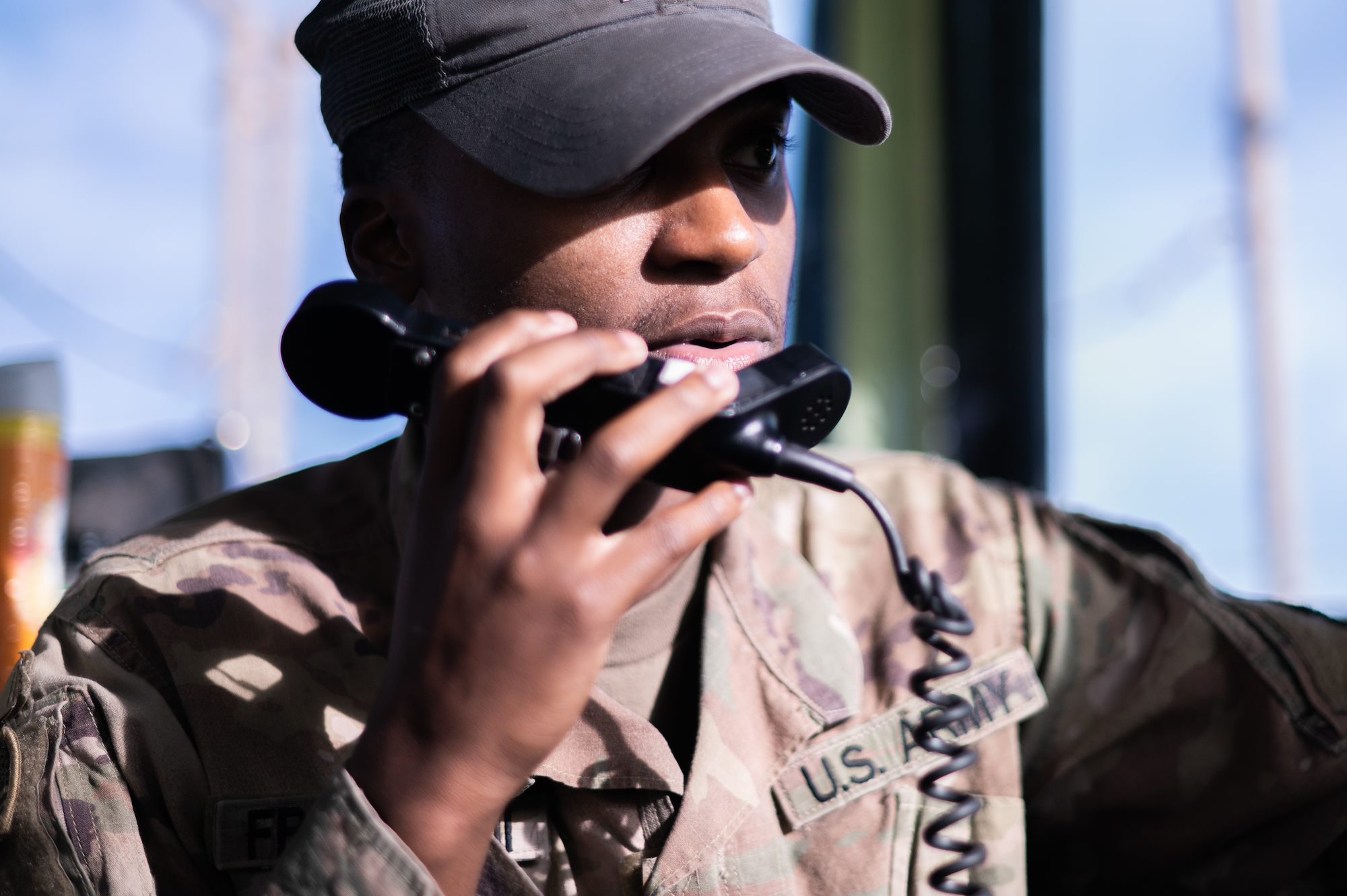 U.S. Army Spc. Gabriel Rudicel, an air traffic control operator with the 3-58th Airfield Operations Battalion, talks on the radio as he watches an aircraft arrive at Baledogle Military Airfield, April 11, 2024. The 3-58th AOB provides air traffic control and airfield management support for outstations within the Combined Joint Task Force - Horn of Africa area of responsibility. (U.S. Air National Guard photo by Senior Airman Kevin Nious)