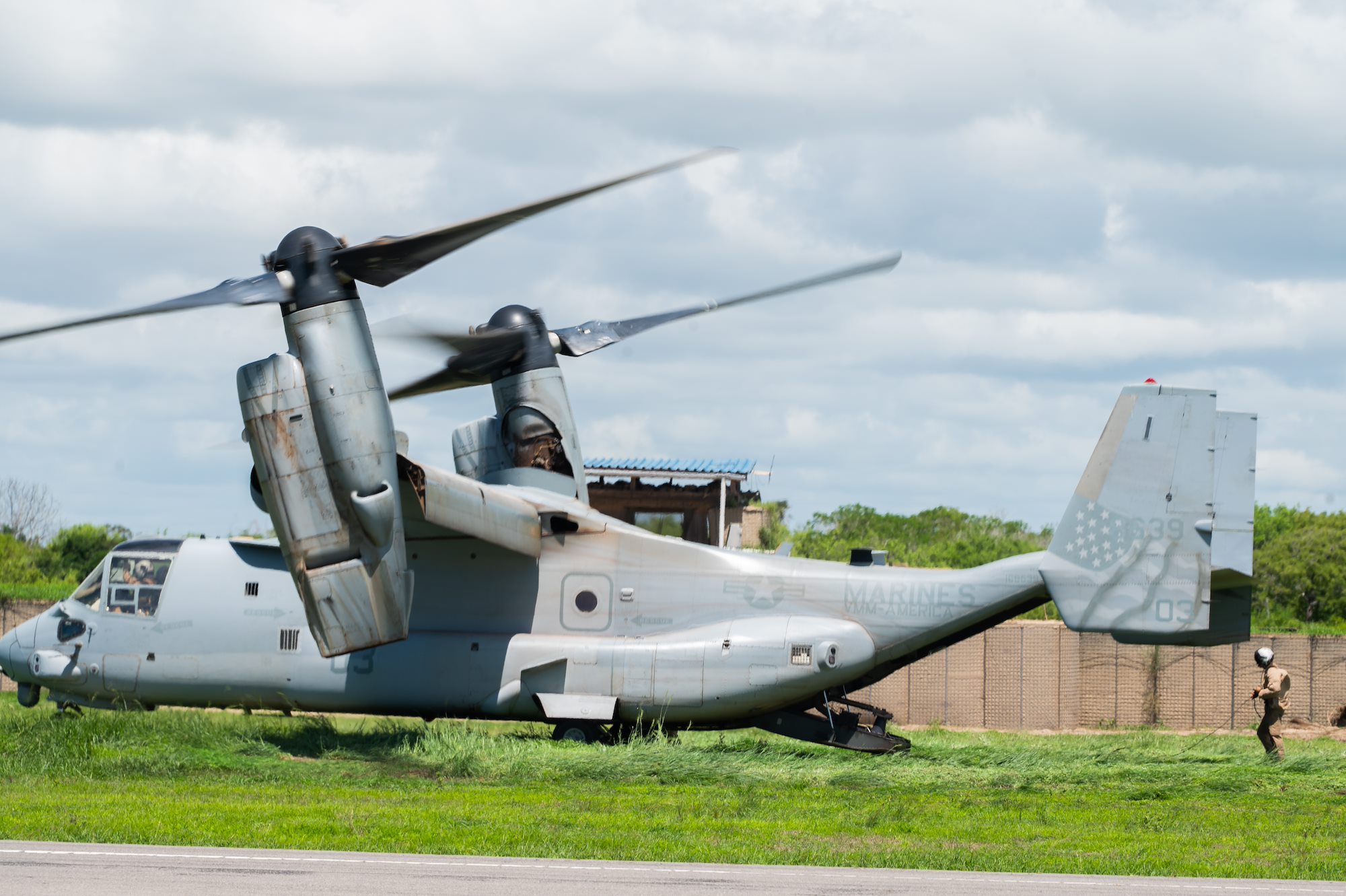 An MV-22 Osprey lands at Magagoni Airfield, Kenya on April 10, 2024. The 3-58th Airfield Operations Battalion provides air traffic control and airfield management support for outstations within the Combined Joint Task Force - Horn of Africa area of responsibility. (U.S. Air National Guard photo by Senior Airman Kevin Nious)