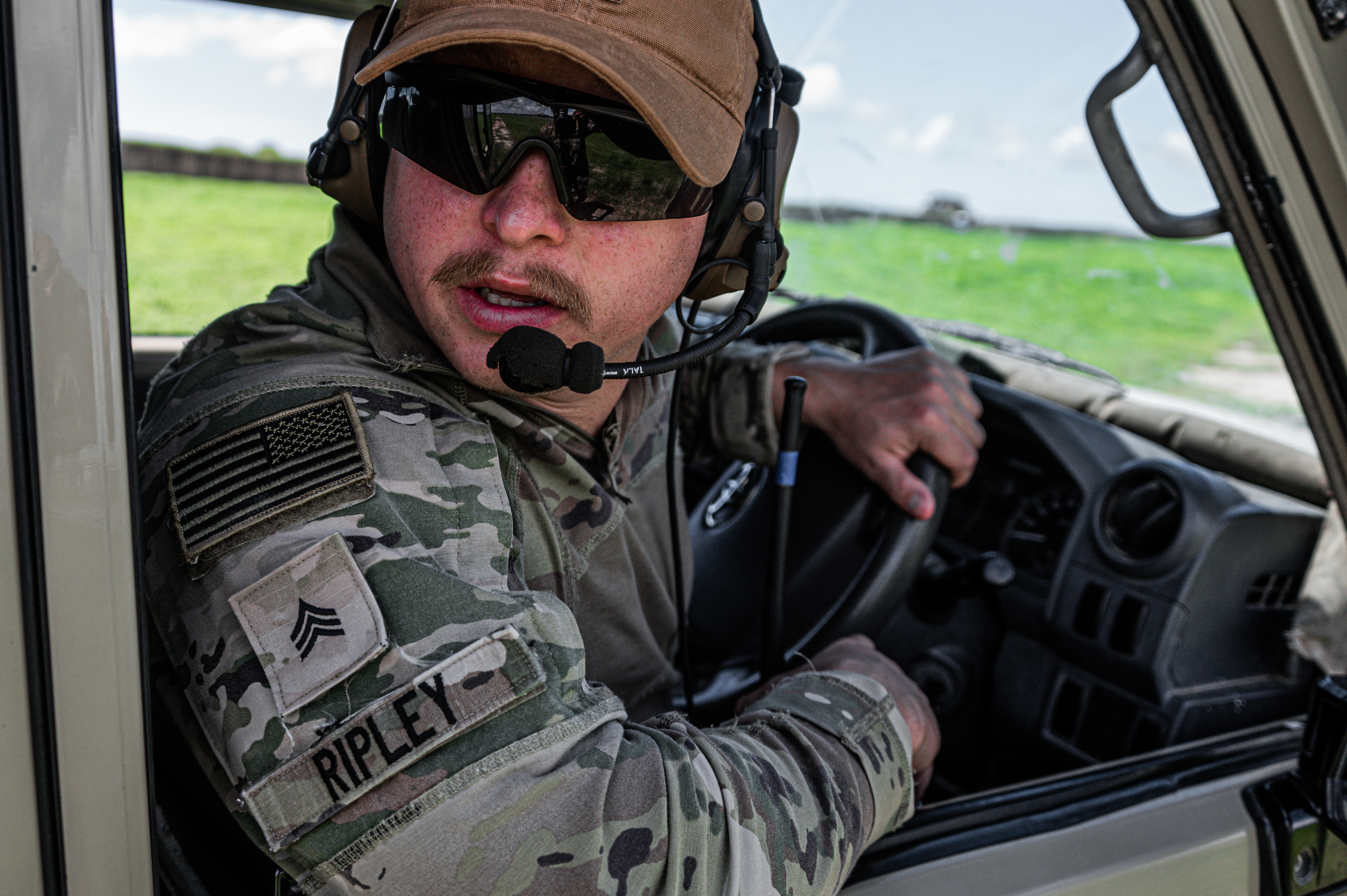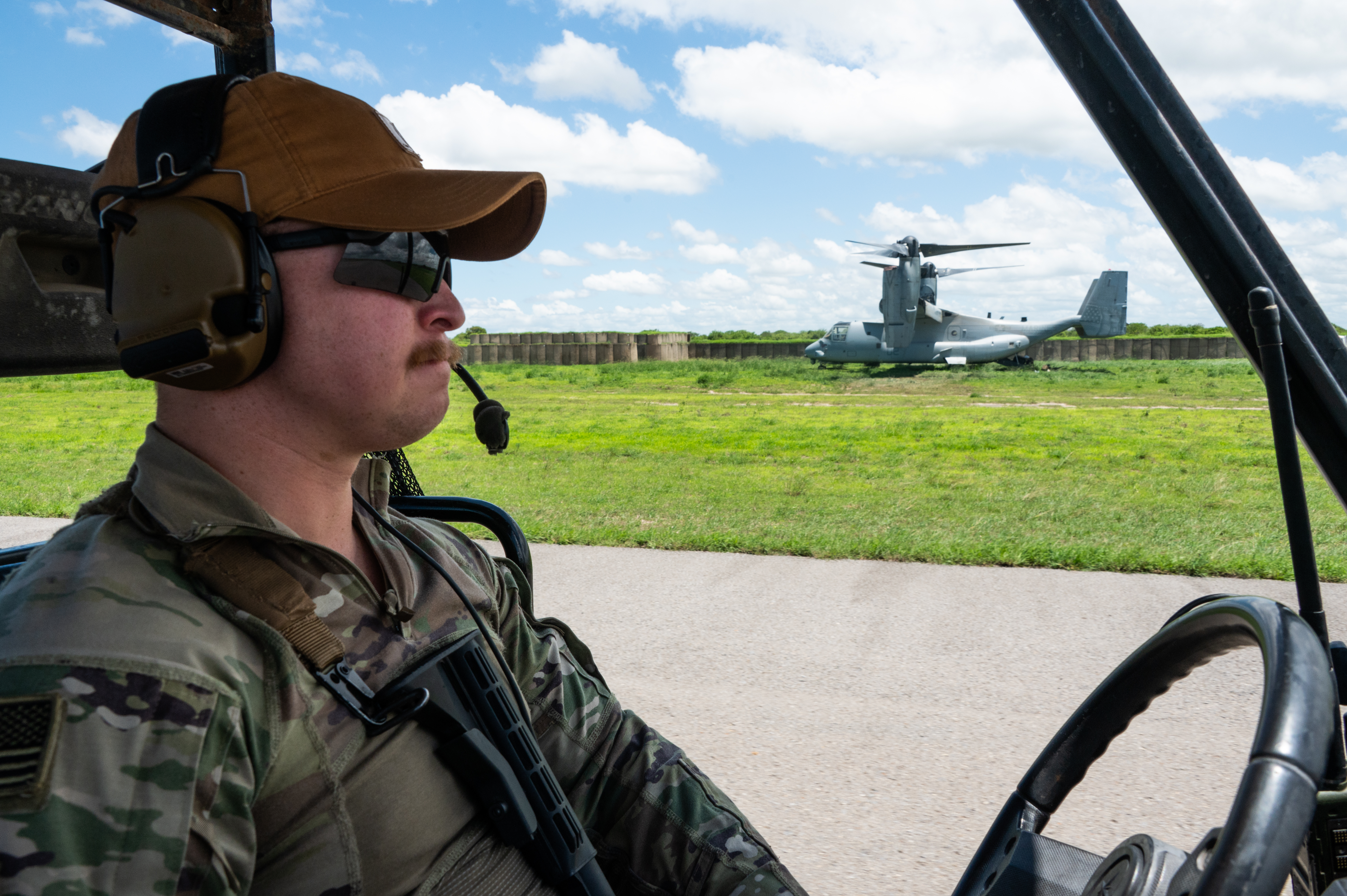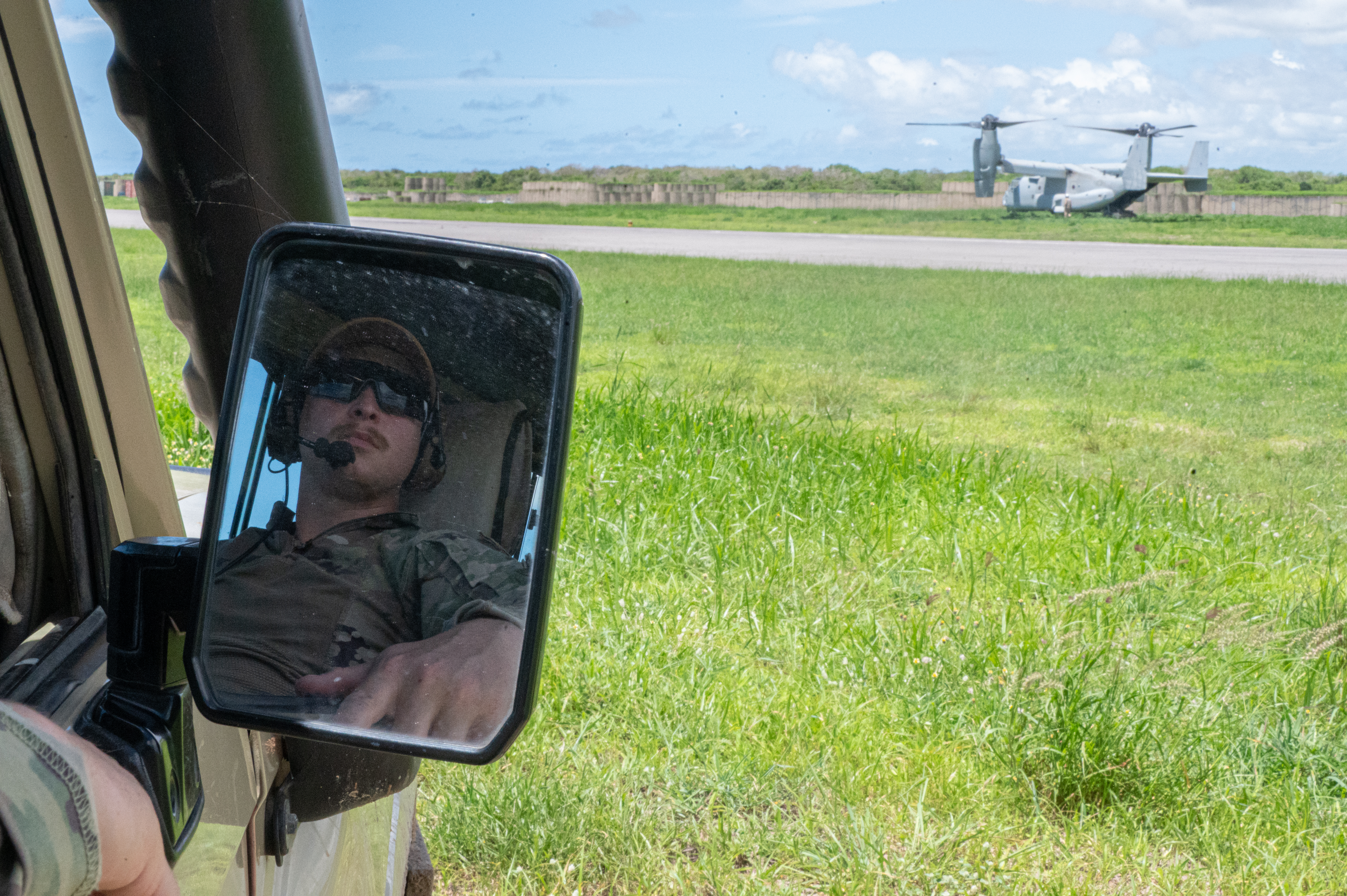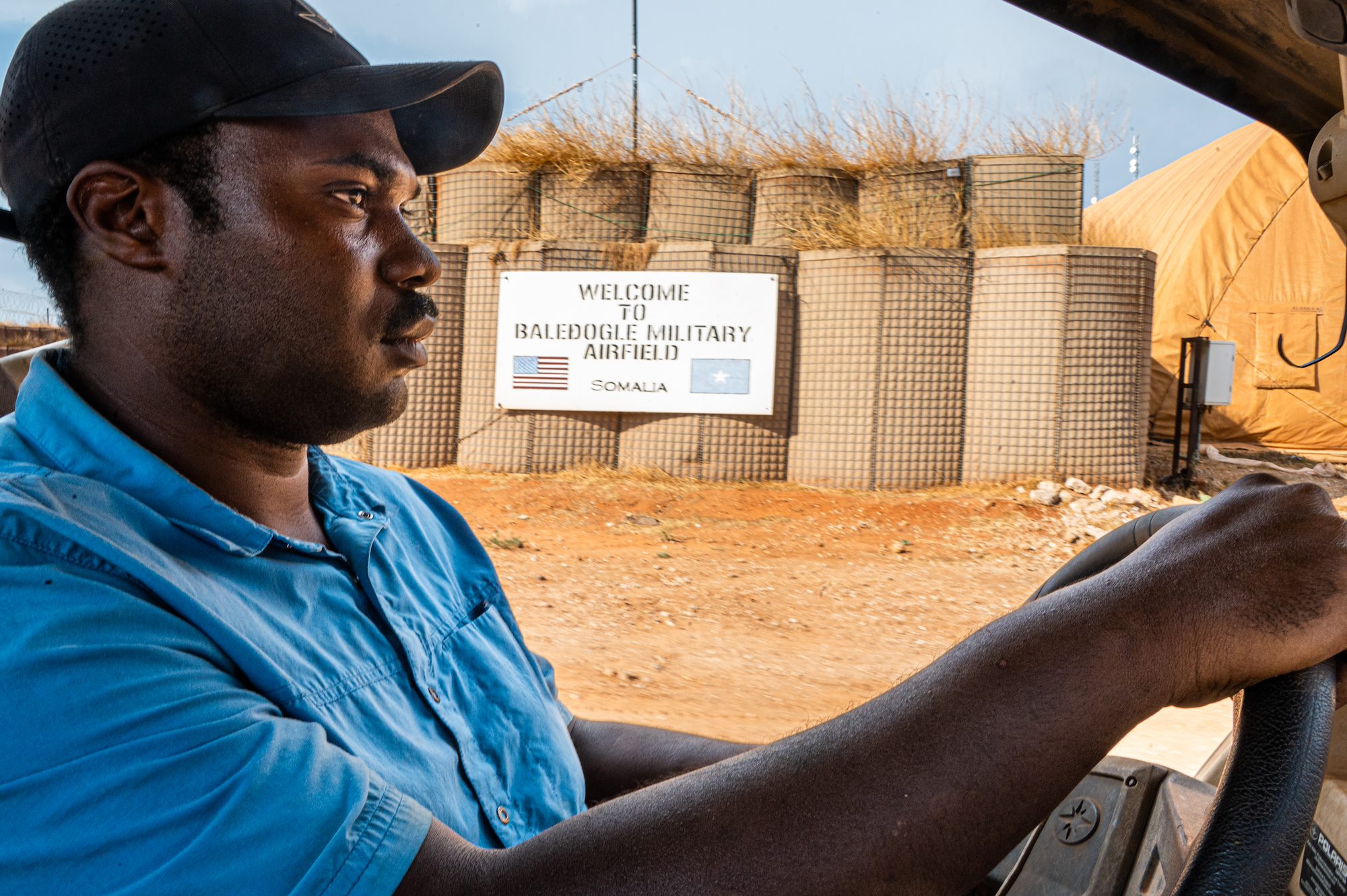 U.S. Army Staff Sgt. Deitrick Garcia, an air traffic control equipment repairer with the 3-58th Airfield Operations Battalion drives in front of the passenger terminal at Baledogle Military Airfield, April 11, 2024. The 3-58th AOB provides air traffic control and airfield management support for outstations within the Combined Joint Task Force - Horn of Africa area of responsibility. (U.S. Air National Guard photo by Senior Airman Kevin Nious)