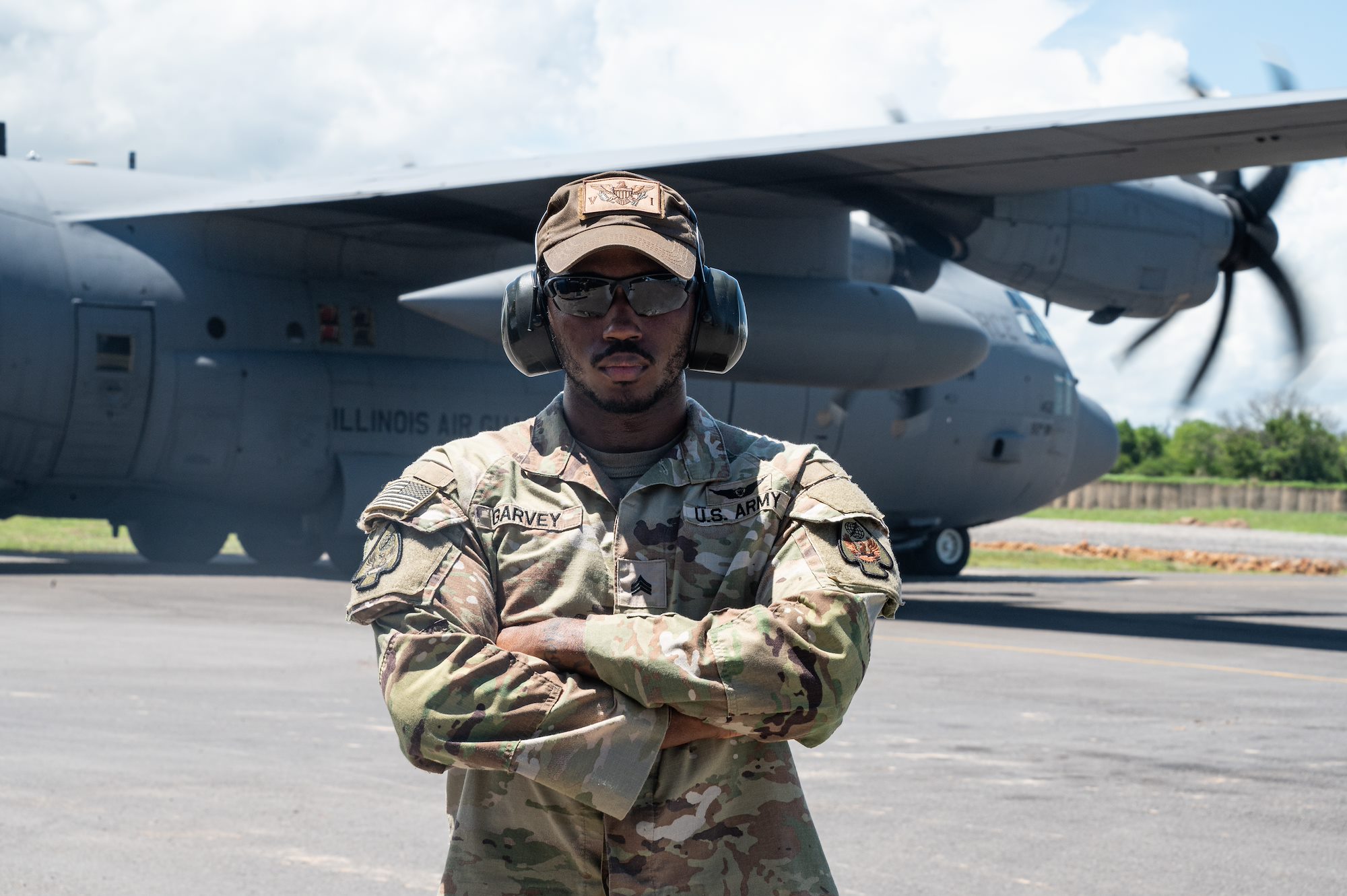 U.S. Army Sgt Deonte Garvey, an airfield management element noncommissioned officer with the 3-58th Airfield Operations Battalion, poses for a photo at Magagoni Airfield, Kenya on April 10, 2024. The 3-58th AOB provides air traffic control and airfield management support for outstations within the Combined Joint Task Force - Horn of Africa area of responsibility. (U.S. Air National Guard photo by Senior Airman Kevin Nious)