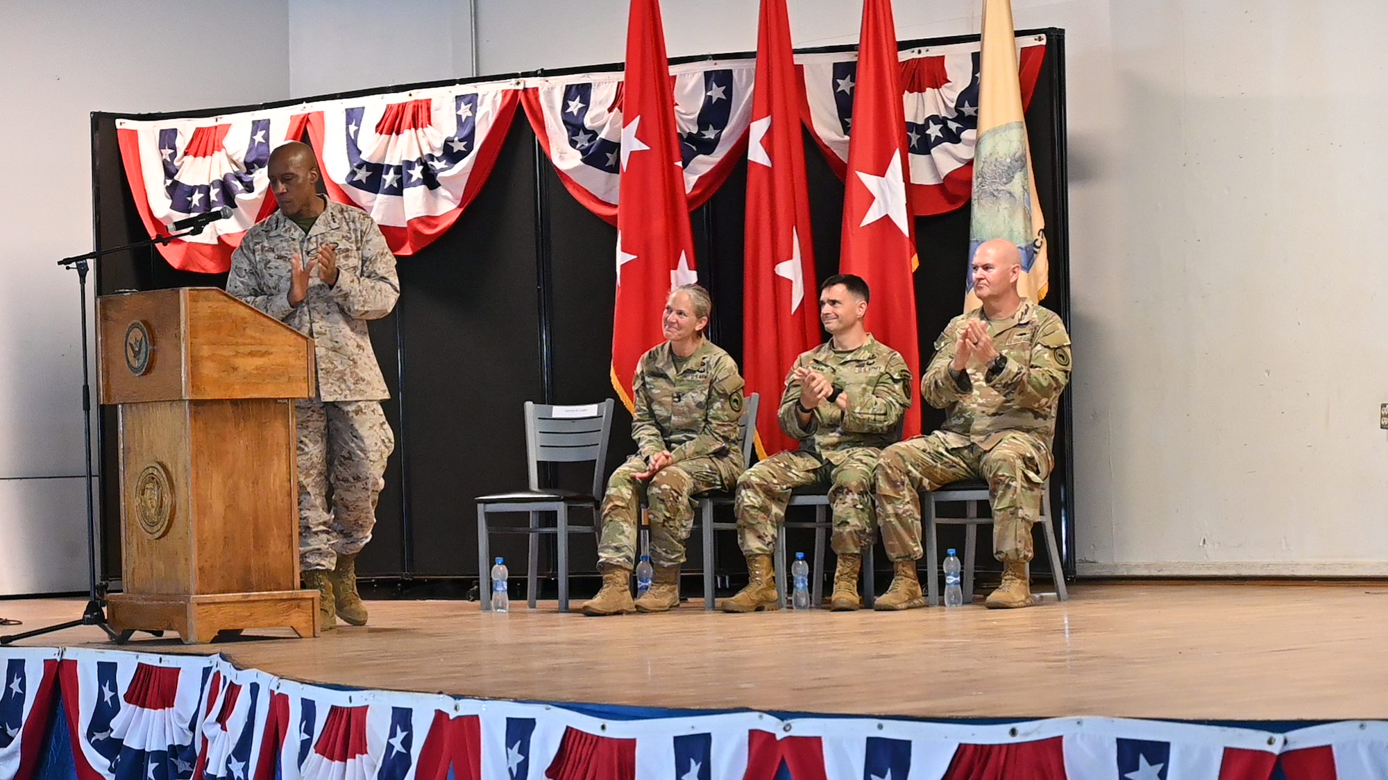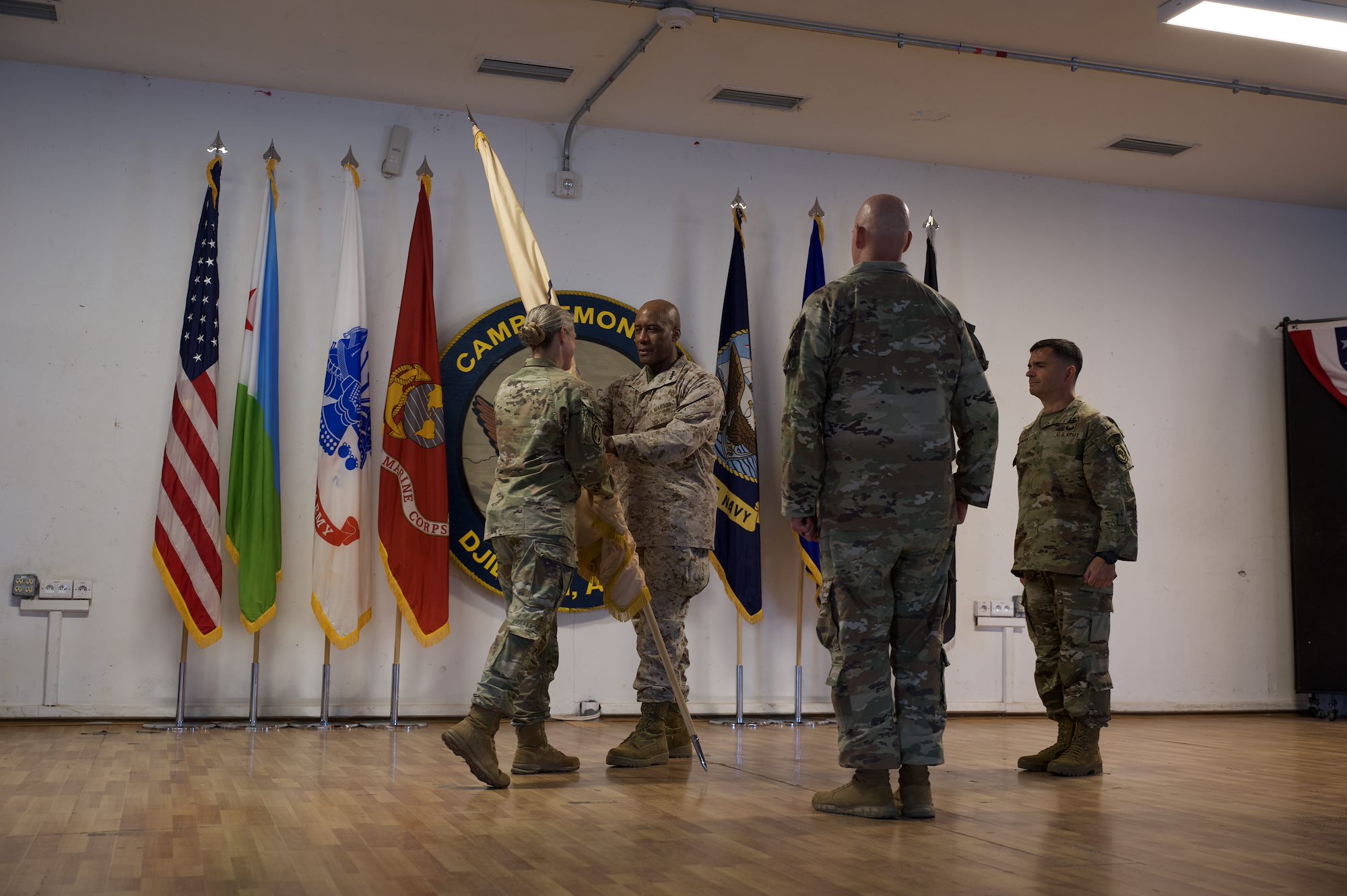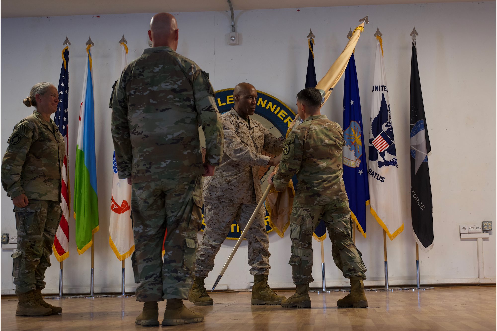 U.S. Army Maj. Gen. Jamelle Shawley passes the CJTF-HOA flag to U.S. Marine Corp. General Michael Langley at the Combined Joint Task Force - Horn of Africa change of command ceremony, Camp Lemonnier Djibouti Apr 27, 2024. CJTF-HOA is a dynamic; joint and multinational operational headquarters; ensuring a strategic partnership with Djibouti; responds to crises; and supports operations throughout East Africa in order to enhance stability and prosperity.(U.S. Air National Guard Photo by Senior Airman John Macera)
