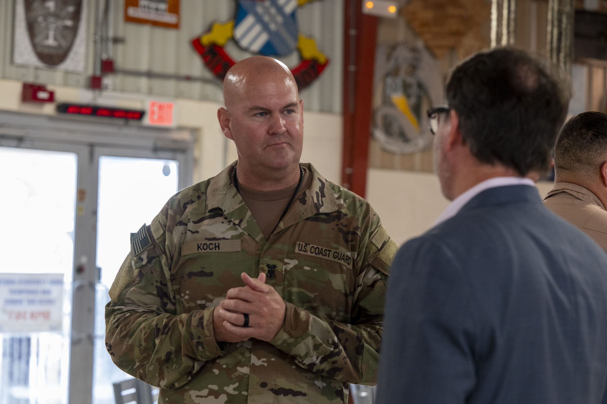 U.S. Coast Guard Master Chief Petty Officer Michael Koch, senior enlisted leader of Combined Joint Task Force Horn of Africa, greets CJTF-HOA service members and embassy members at Camp Lemonnier, Djibouti on Oct. 27, 2023. U.S. Marine Corps Command Sgt. Maj. Frank Kammer, CJTF-HOA outgoing senior enlisted leader, handed over his responsibility as SEL to Koch during the ceremony.