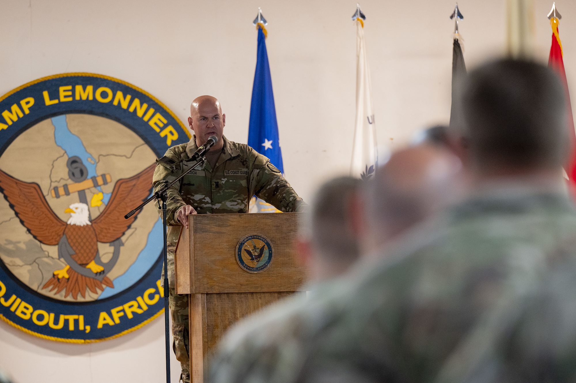 U.S. Coast Guard Master Chief Petty Officer Michael Koch, senior enlisted leader of Combined Joint Task Force Horn of Africa, gives a speech to CJTF-HOA service members at Camp Lemonnier, Djibouti on Oct. 27, 2023. CJTF-HOA personnel welcomed Koch to his new role here in Djibouti following the ceremony.