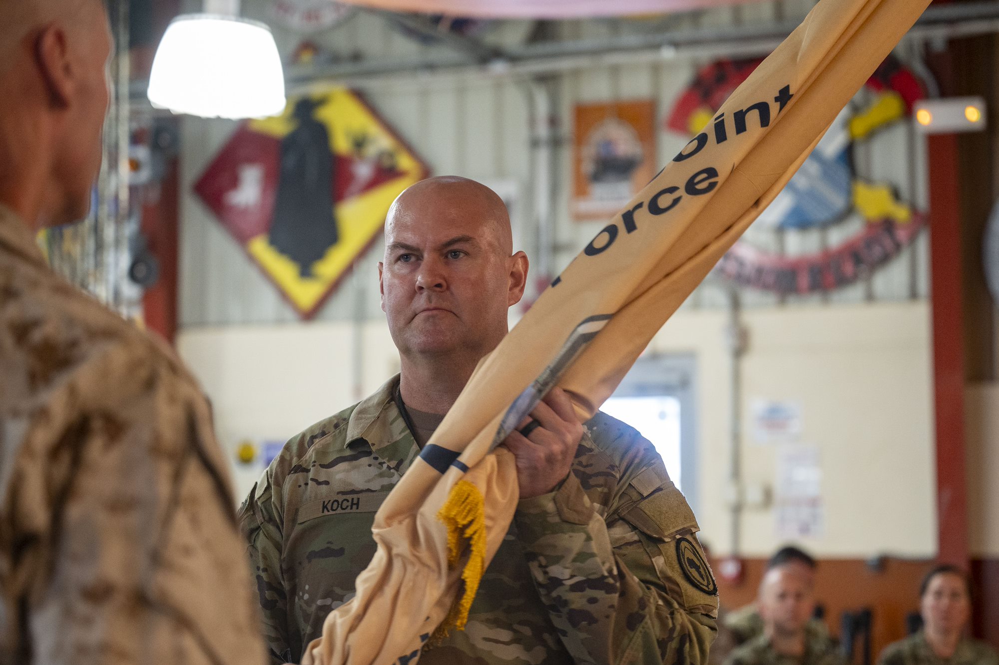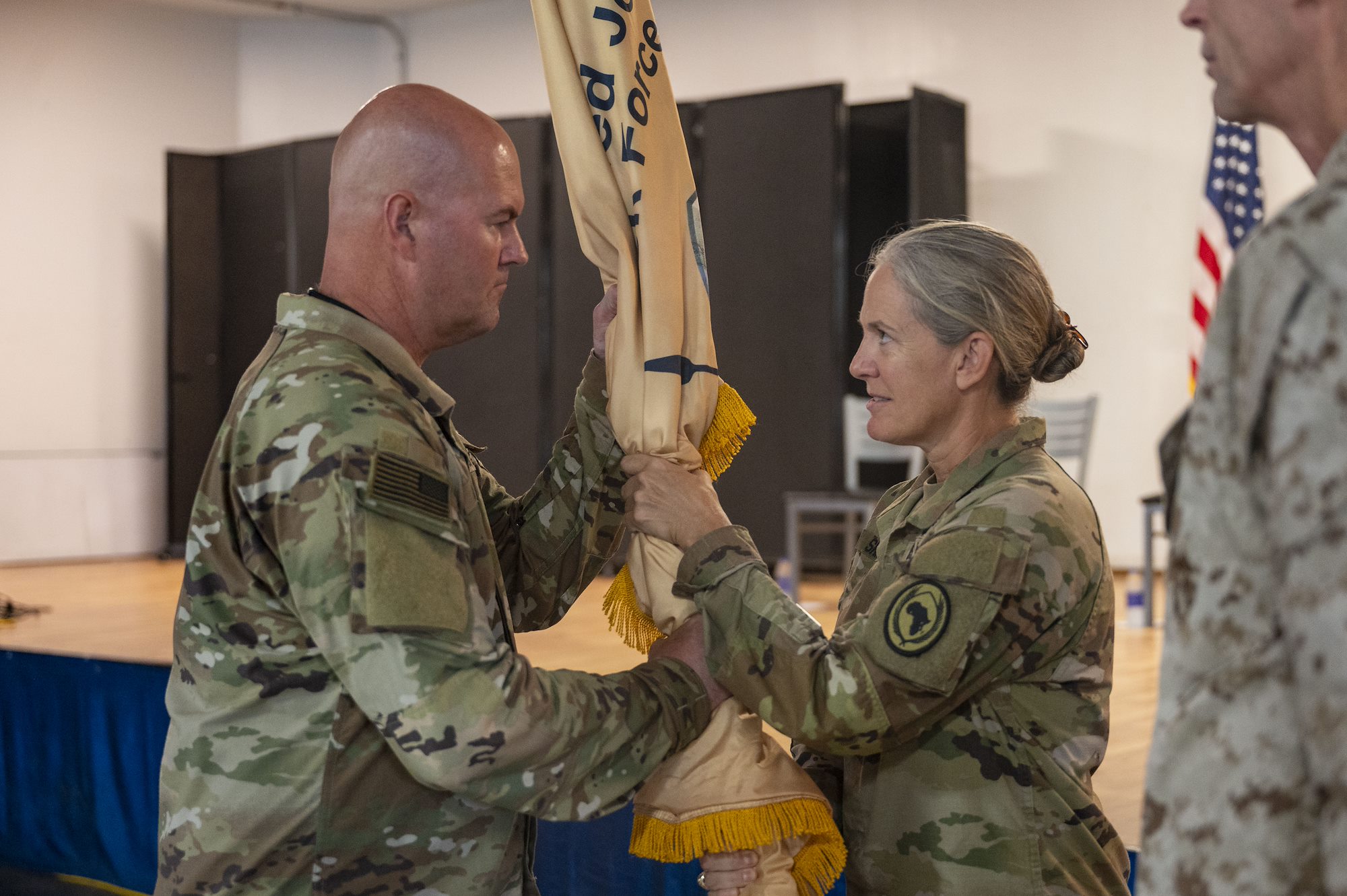 U.S. Army Maj Gen. Jami Shawley, commanding general of Combined Joint Task Force Horn of Africa, hands over the CJTF-HOA guide-on to U.S. Coast Guard Master Chief Petty Officer Michael Koch during a Change of Responsibility ceremony on Oct. 27, 2023. U.S. Marine Corps Sgt. Maj. Kammer handed over his responsibility as the senior enlisted leader to U.S Coast Guard Master Chief Petty Officer Michael Koch.