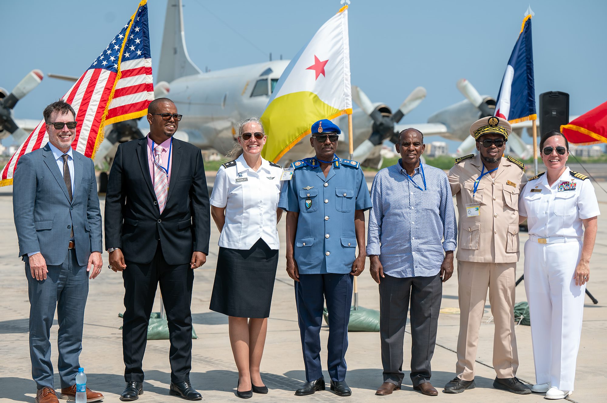 U.S. and Djiboutian leadership pose for a group photo during the 2023 Partner Appreciation Day, at Camp Lemonnier, Djibouti Nov. 8, 2023. Camp Lemonnier is the only enduring U.S. military base on the continent of Africa serving as a logistics platform providing support services, port operations, and airfield management to over 28 tenant commands and operations, including Combined Joint Task Force - Horn of Africa. (Department of Defense photo by U.S. Army Sgt. Jalen Miller)