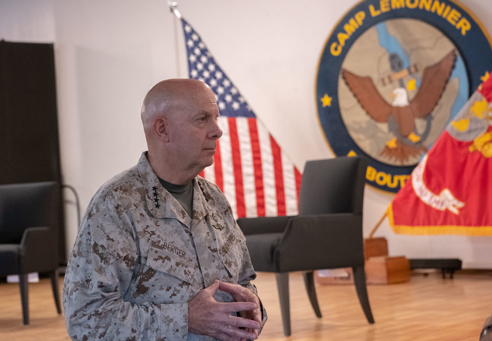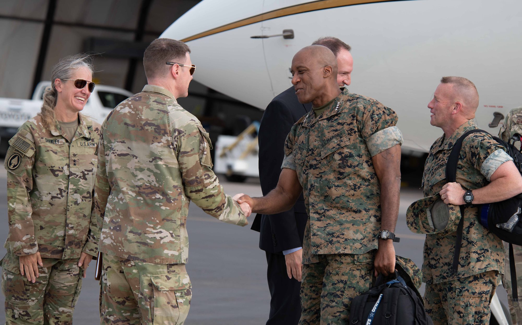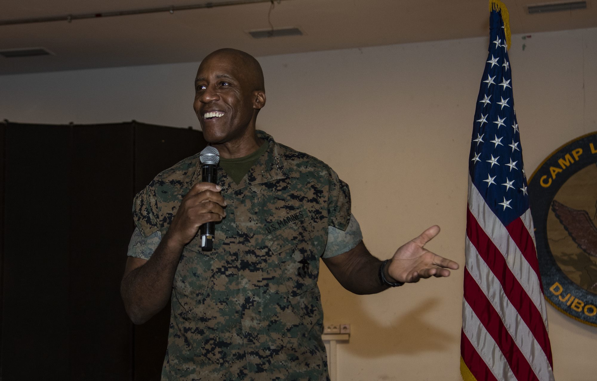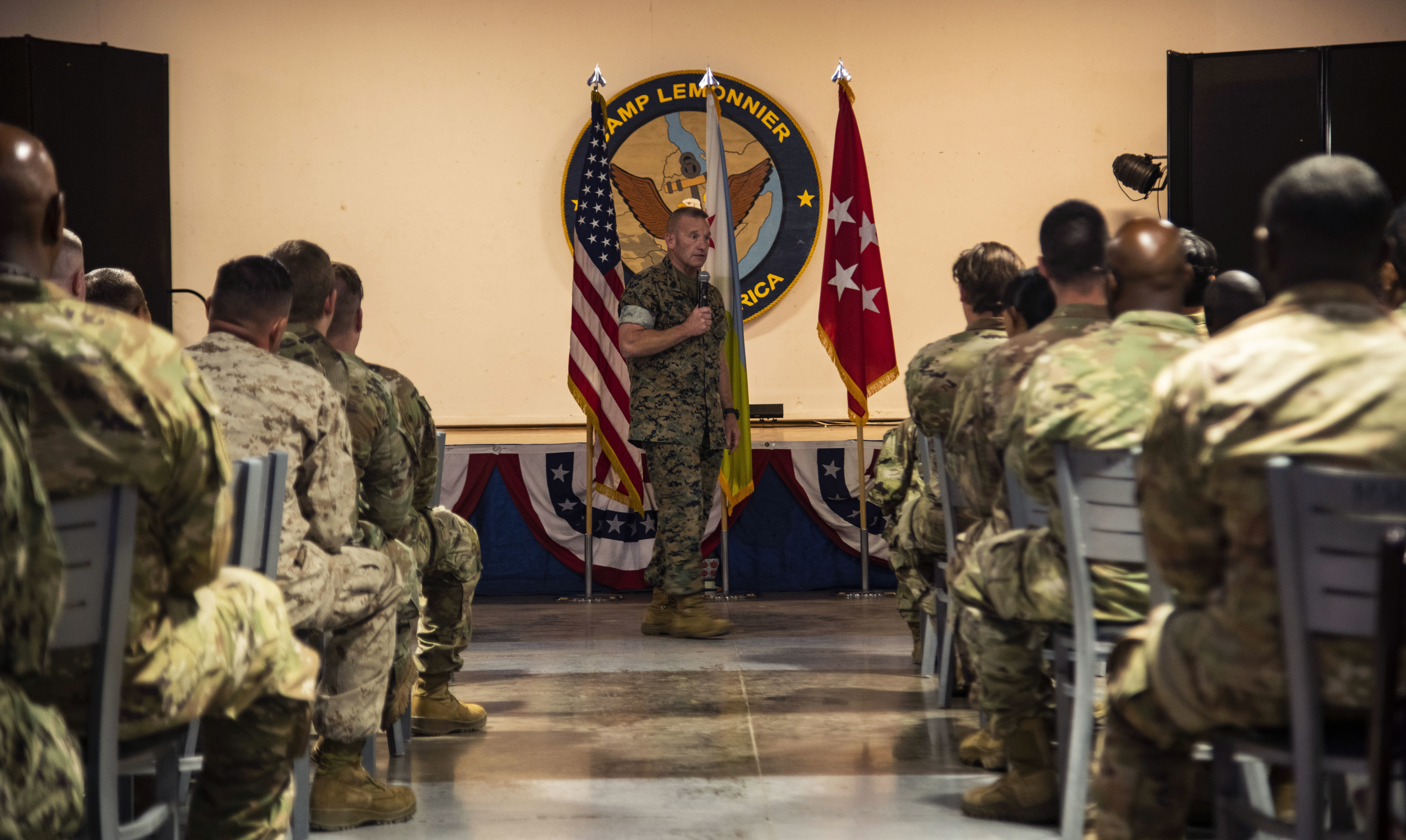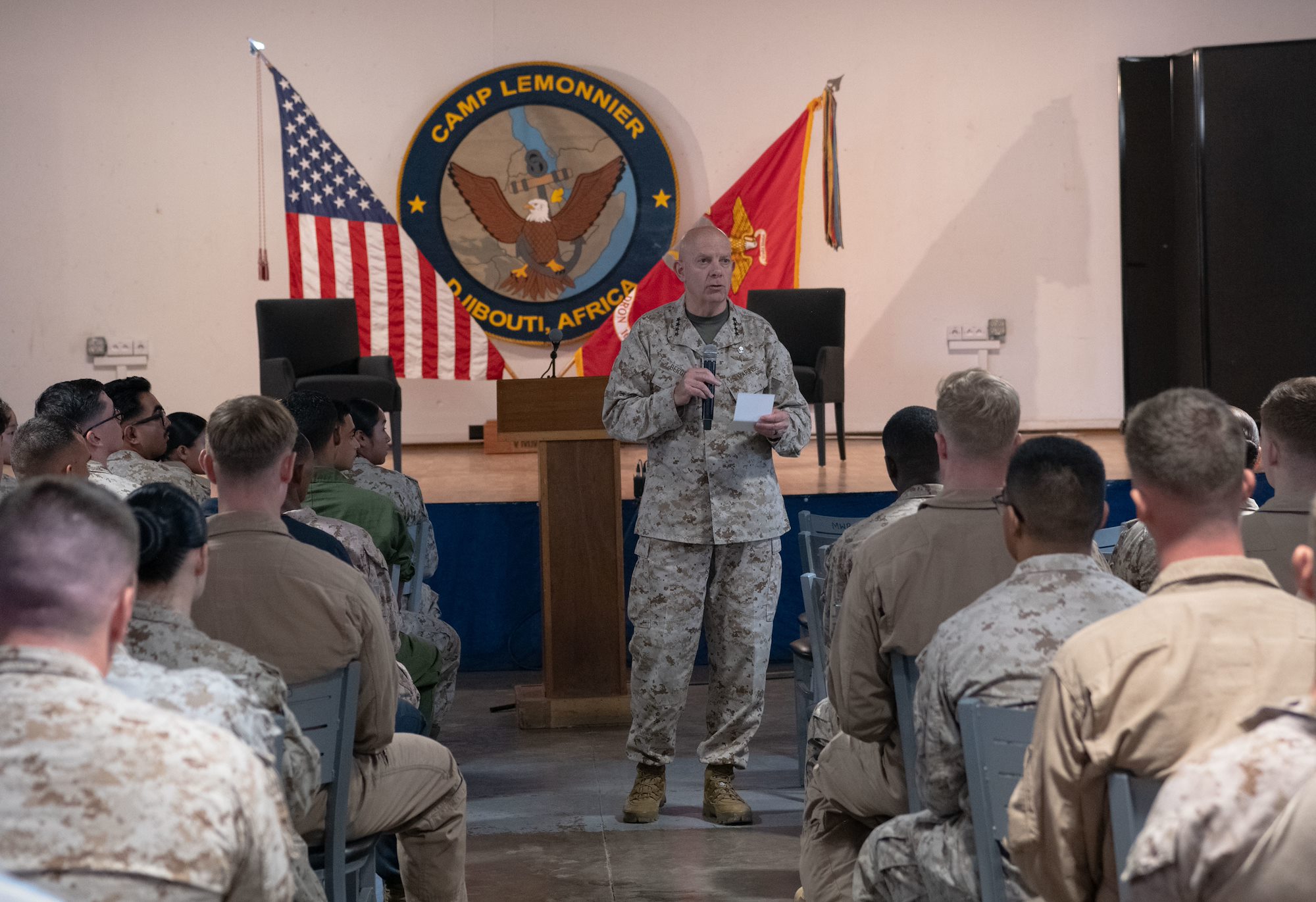 U.S. Marine Corps Gen. Michael Langley, commander, U.S. Africa Command, and Sgt. Maj. Richard Thresher, command senior enlisted leader, U.S. Africa Command, speak with Sgt. Jeffrey Powell, Marine Security Guard Detachment Djibouti, Aug. 28, 2022, as part of a troop engagement for Langley’s first visit to Africa as U.S. Africa Command’s commanding general. The visit came as part of a four-day trip to Djibouti, Somalia, and Manda Bay, Kenya, from August 28-31, 2022, to meet with host nation leaders, senior interagency officials, and deployed troops to better understand the political and military situation in East Africa, discuss shared concerns and priorities, and see ongoing operations firsthand. (Department of Defense photo by U.S. Air Force Master Sgt. Daryl Knee)