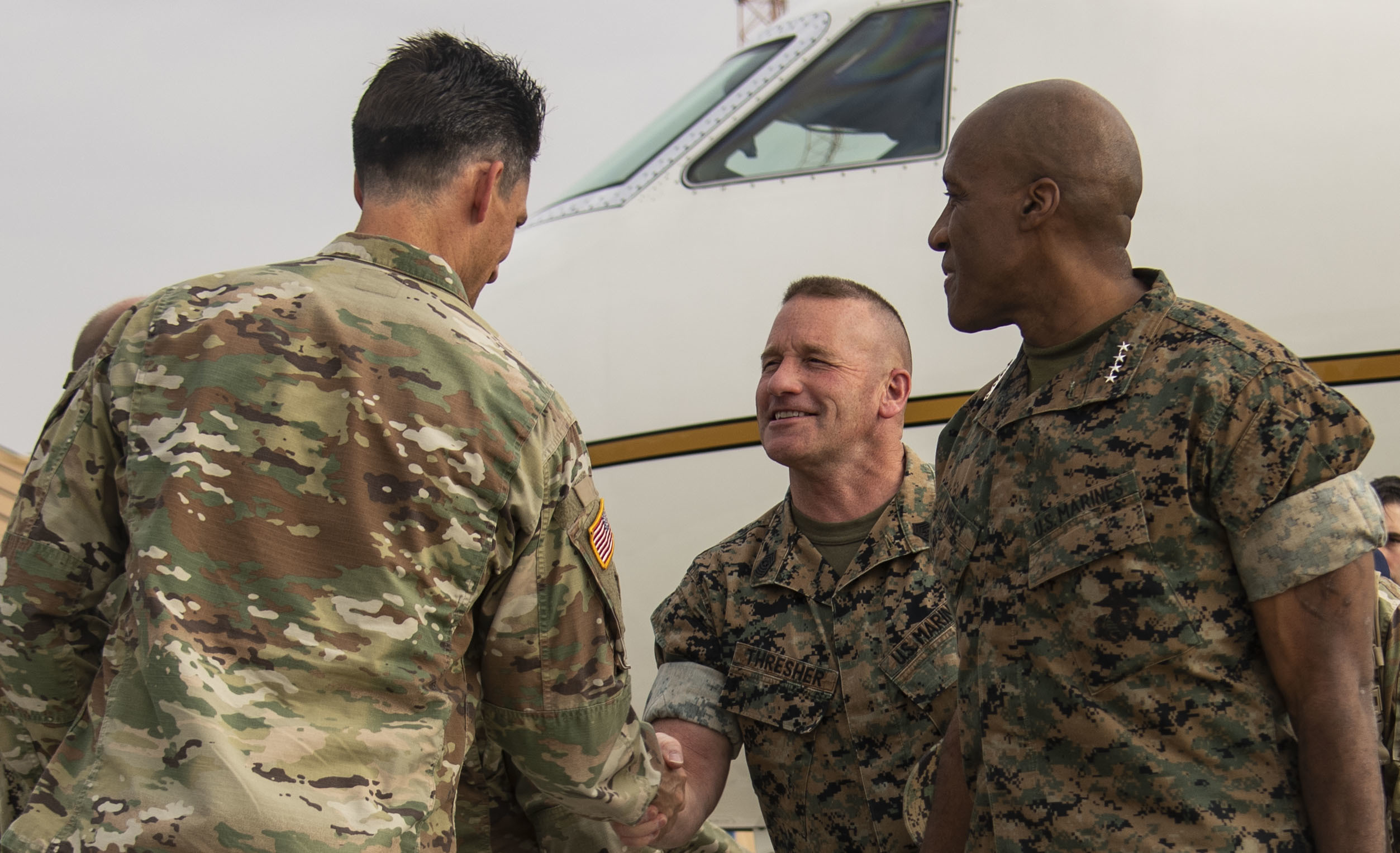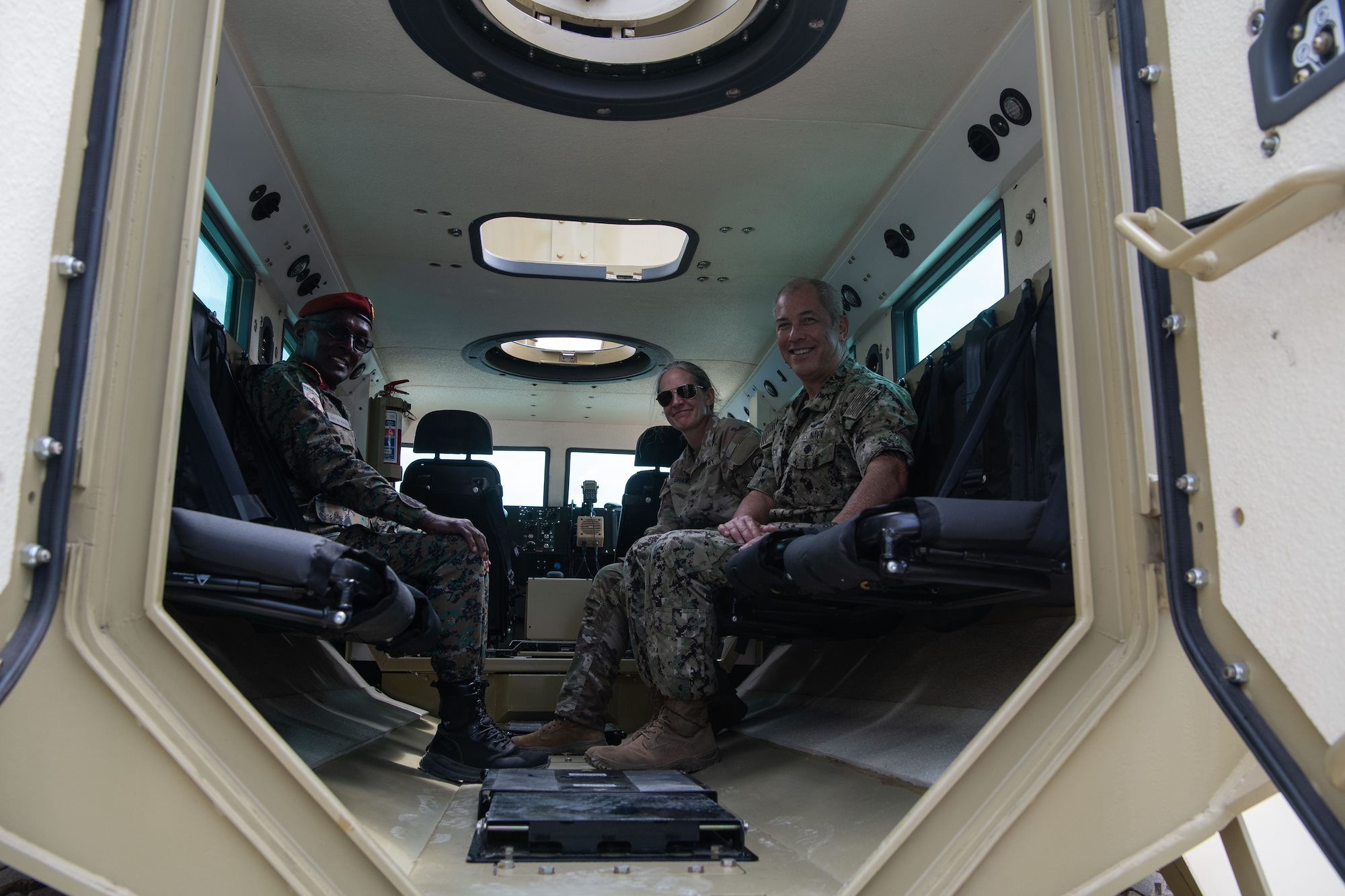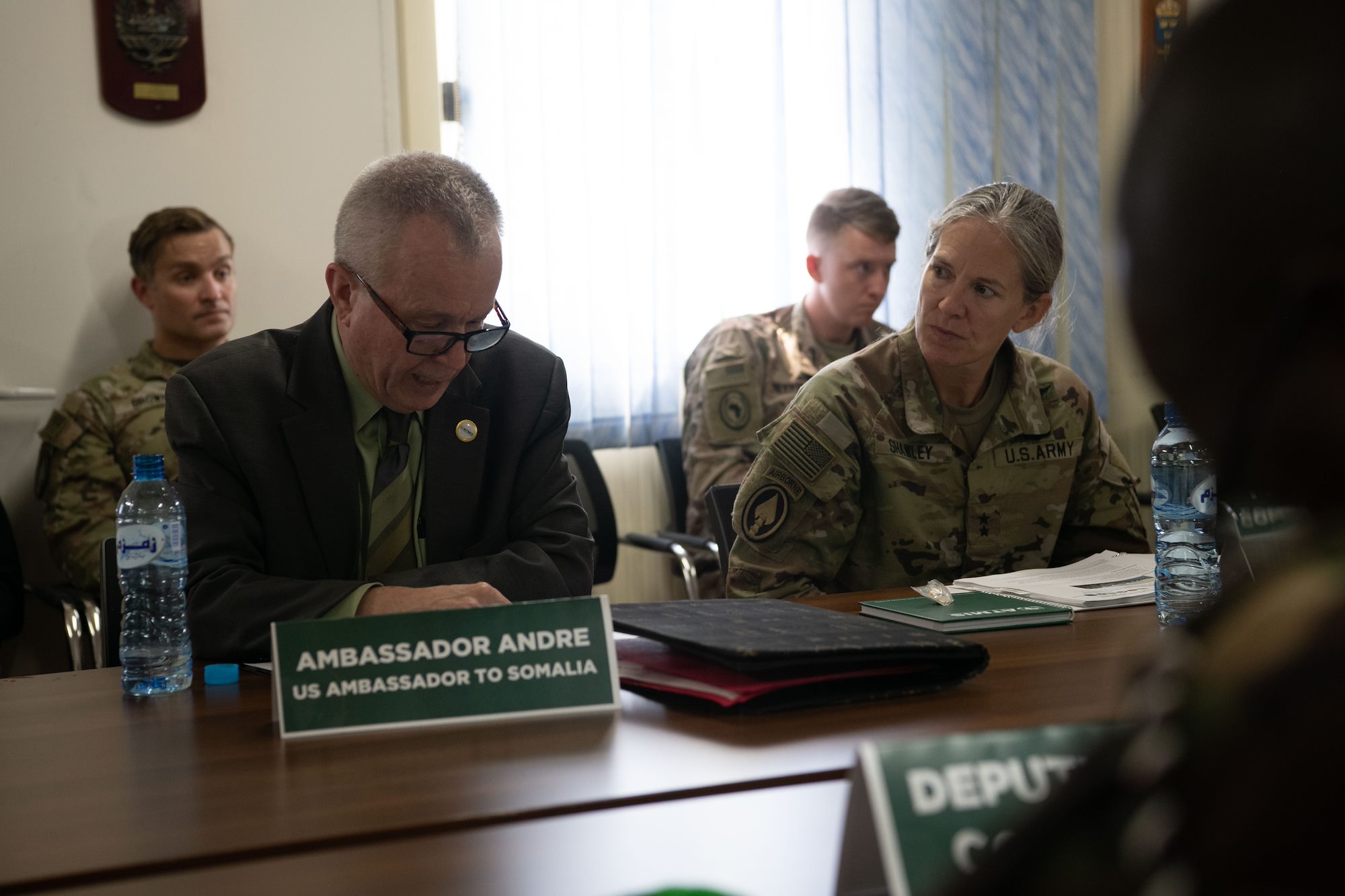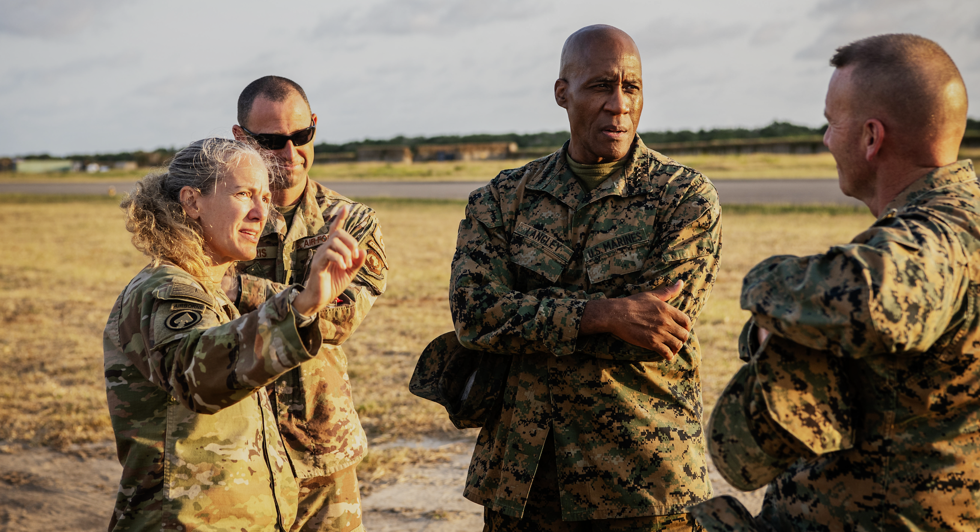 U.S. Marine Corps Gen. Michael Langley, commander, U.S. Africa Command, and Sgt. Maj. Richard Thresher, command senior enlisted leader, U.S. Africa Command, speak with Sgt. Jeffrey Powell, Marine Security Guard Detachment Djibouti, Aug. 28, 2022, as part of a troop engagement for Langley’s first visit to Africa as U.S. Africa Command’s commanding general. The visit came as part of a four-day trip to Djibouti, Somalia, and Manda Bay, Kenya, from August 28-31, 2022, to meet with host nation leaders, senior interagency officials, and deployed troops to better understand the political and military situation in East Africa, discuss shared concerns and priorities, and see ongoing operations firsthand. (Department of Defense photo by U.S. Air Force Master Sgt. Daryl Knee)