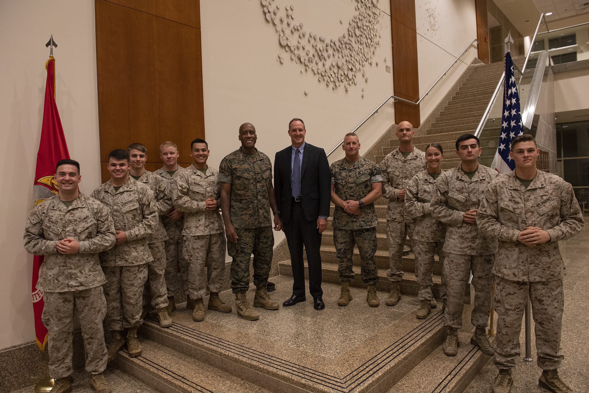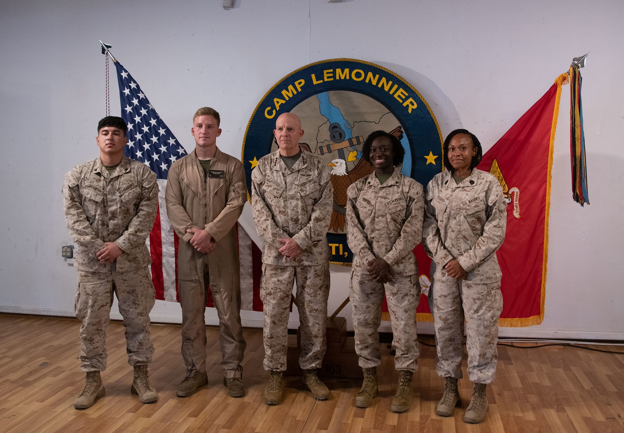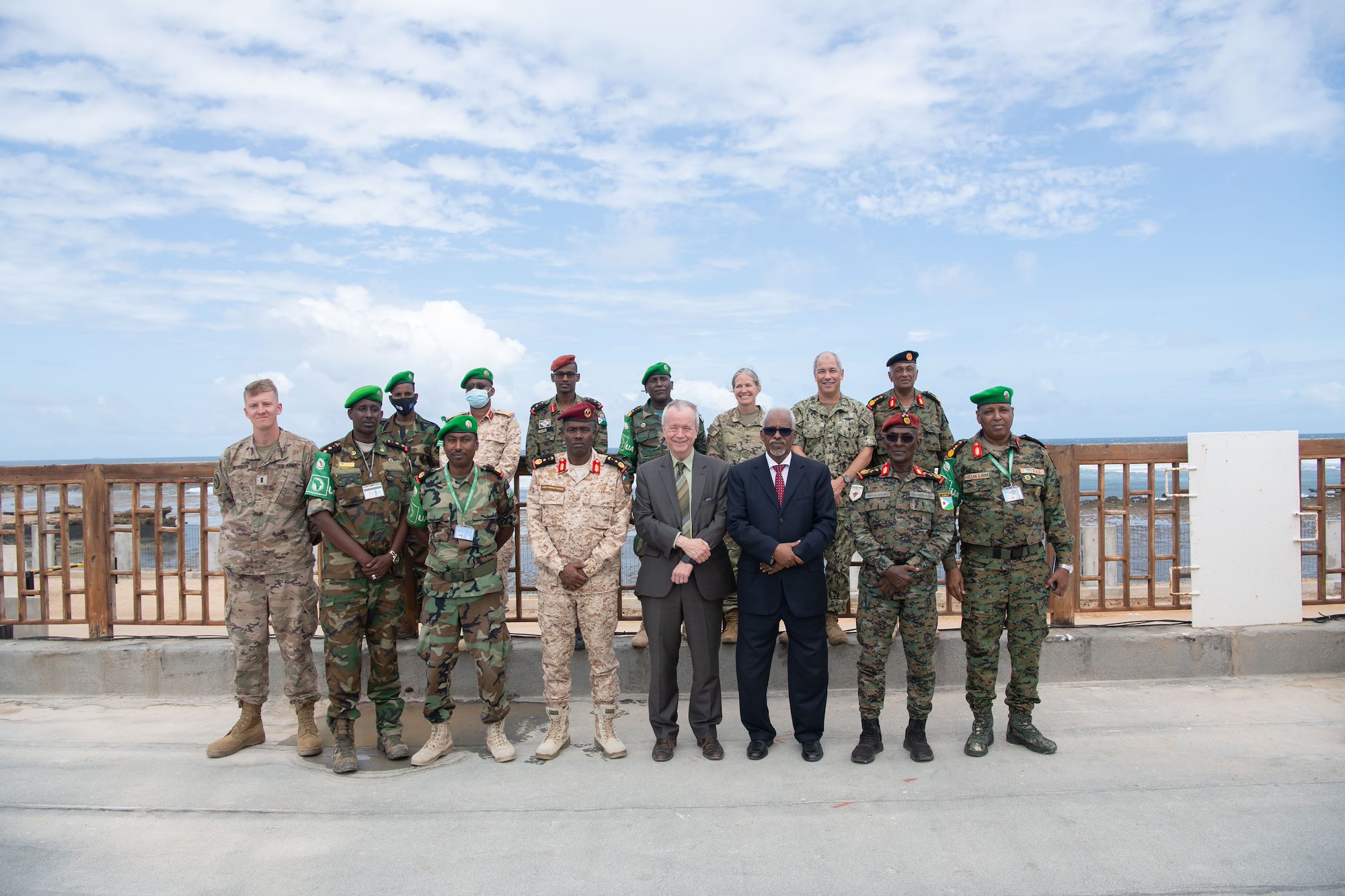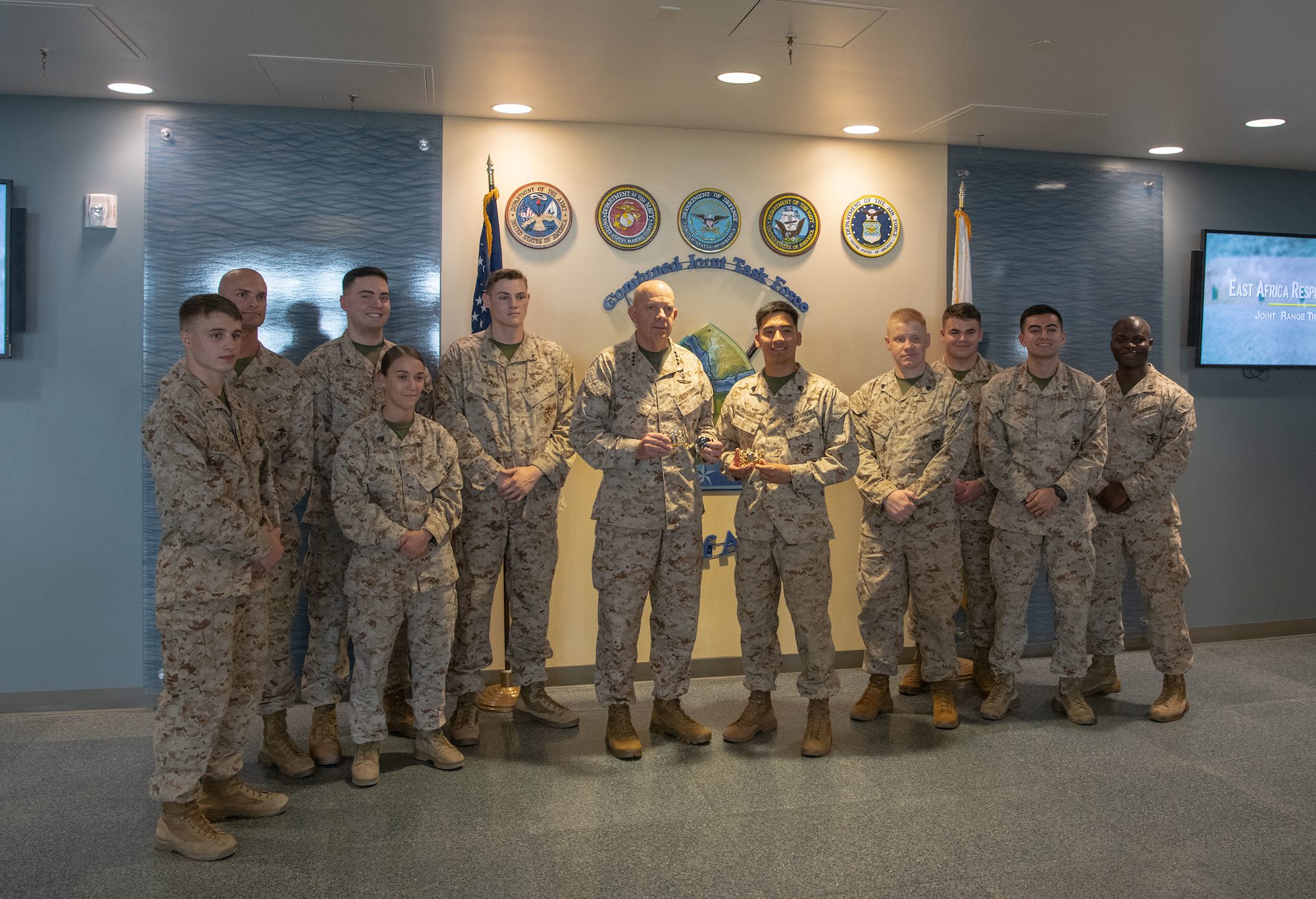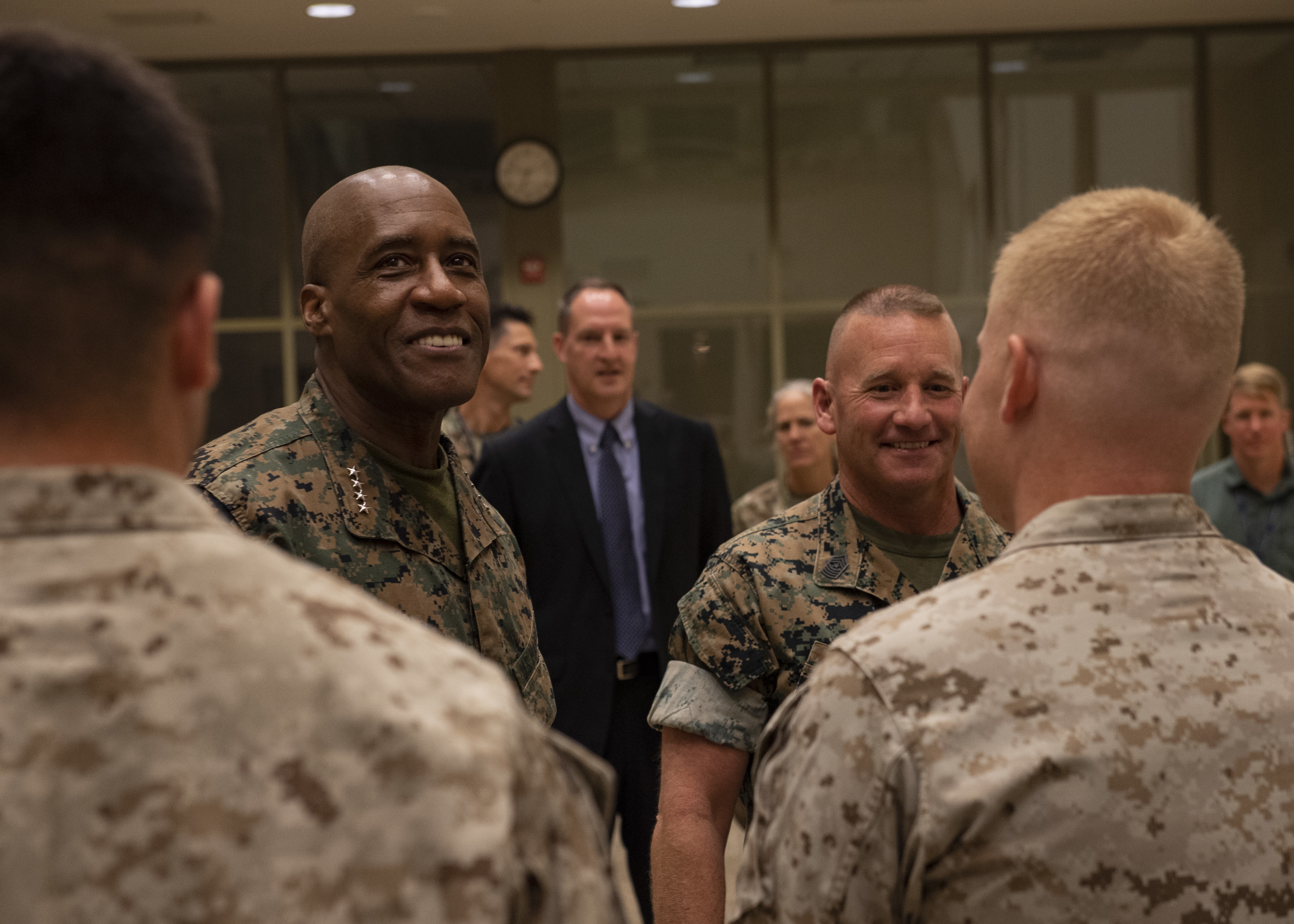 U.S. Marine Corps Gen. Michael Langley, commander, U.S. Africa Command, and Sgt. Maj. Richard Thresher, command senior enlisted leader, U.S. Africa Command, speak with Sgt. Jeffrey Powell, Marine Security Guard Detachment Djibouti, Aug. 28, 2022, as part of a troop engagement for Langley’s first visit to Africa as U.S. Africa Command’s commanding general. The visit came as part of a four-day trip to Djibouti, Somalia, and Manda Bay, Kenya, from August 28-31, 2022, to meet with host nation leaders, senior interagency officials, and deployed troops to better understand the political and military situation in East Africa, discuss shared concerns and priorities, and see ongoing operations firsthand. (Department of Defense photo by U.S. Air Force Master Sgt. Daryl Knee)