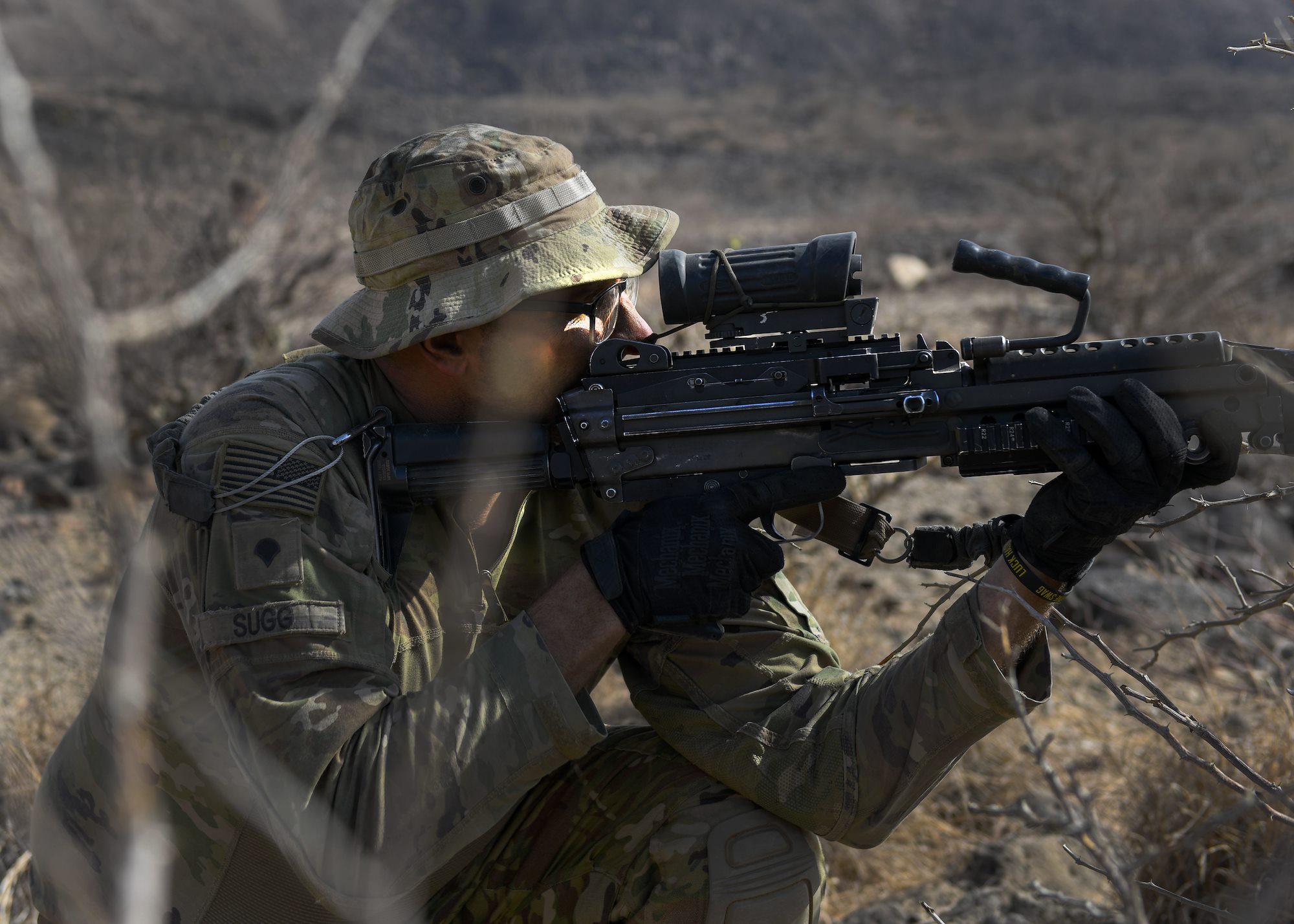 Kentucky Army National Guard Spc. Evan Sugg with Task Force Red Dragon, Combined Joint Task Force - Horn of Africa (CJTF-HOA), conducts a squad live-fire exercise in Djibouti at Arta range complex, Djibouti, June 8, 2022. CJTF-HOA, operating from Camp Lemonnier, Djibouti, is a dynamic operational headquarters, supporting missions to counter violent extremist organizations, responding to crises and enhancing stability in East Africa. (U.S. Army photo by Spc. Kiersten Breunig)