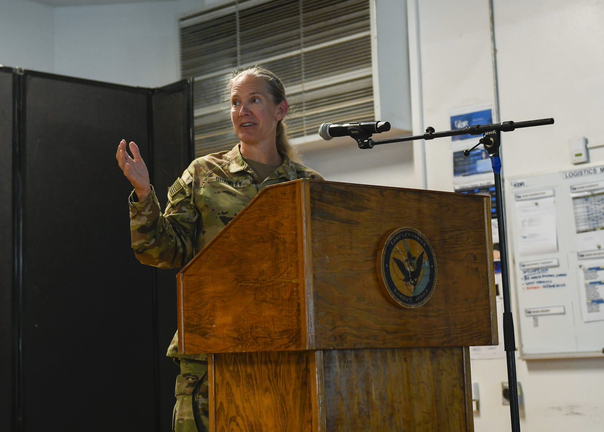 U.S. Army Maj. Gen. Jami Shawley, commanding general of the Combined Joint Task Force – Horn of Africa (CJTF-HOA), delivers comments during the Logistics in East Africa Forum (LEAF) at the Kempinski Palace, Djibouti, July 12, 2022. The LEAF is a multinational logistics meeting bringing together CJTF-HOA’s partners, exchanging knowledge about capabilities to improve interoperability, burden sharing and to enhance the combined ability to support logistical activities. (U.S. Air Force photo by Staff Sgt. Dallin Wrye)