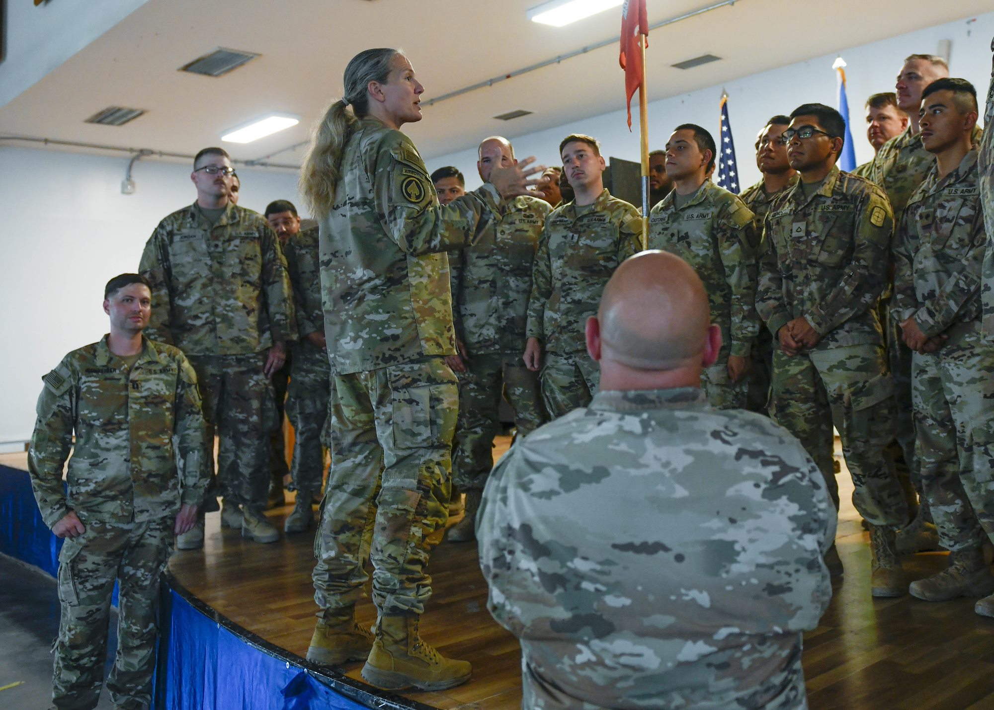 Maj. Gen. Jami C. Shawley, commanding general of Combined Joint Task Force-Horn of Africa (CJTF-HOA), provides encouraging words to the incoming 319th Engineer Support Company (ESC) after transferring authority of the CJTF-HOA’s engineering mission from the 712th ESC at Camp Lemonnier, Djibouti, June 14, 2022. The engineering company works on a variety of construction projects with partner nations throughout CJTF-HOA’s area of interest.