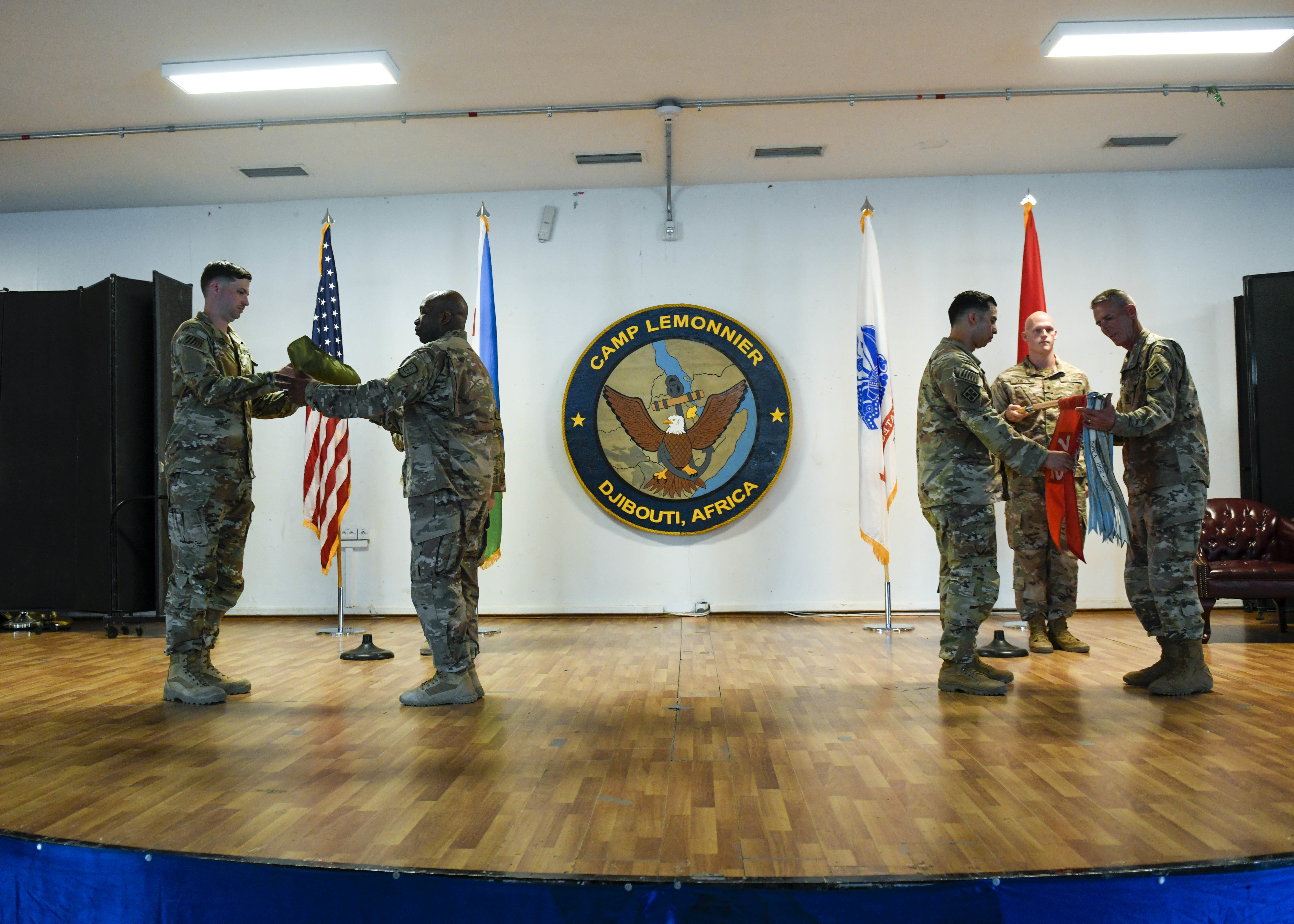 The 712th Engineer Support Company (ESC), from South Carolina, transferred responsibility of the Combined Joint Task Force – Horn of Africa (CJTF-HOA) engineering mission to the 319th Engineer Support Company, from Texas, during a ceremony at Camp Lemonnier, Djibouti, June 14, 2022. The engineering company works on a variety of construction projects with partner nations throughout CJTF-HOA’s area of interest.