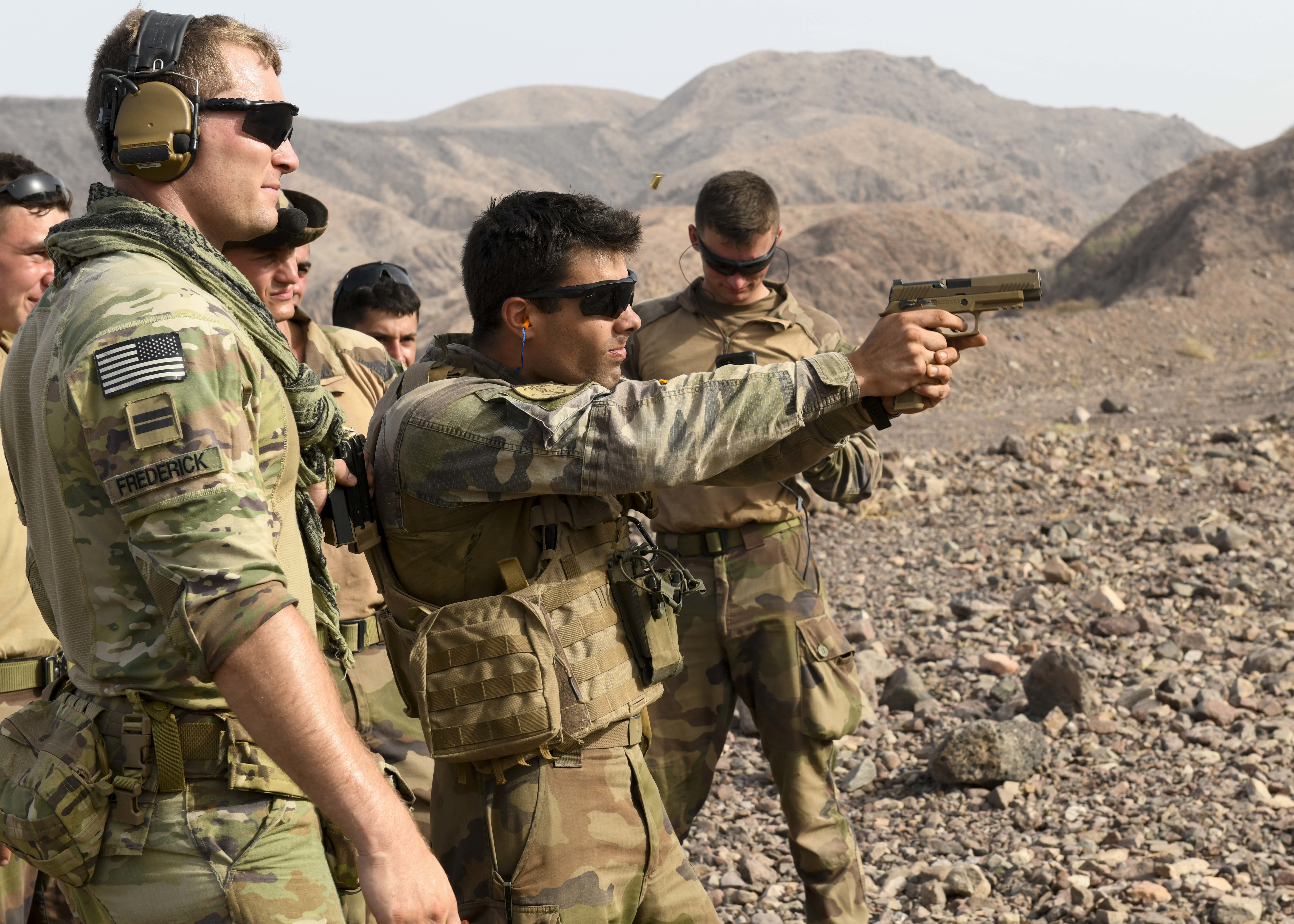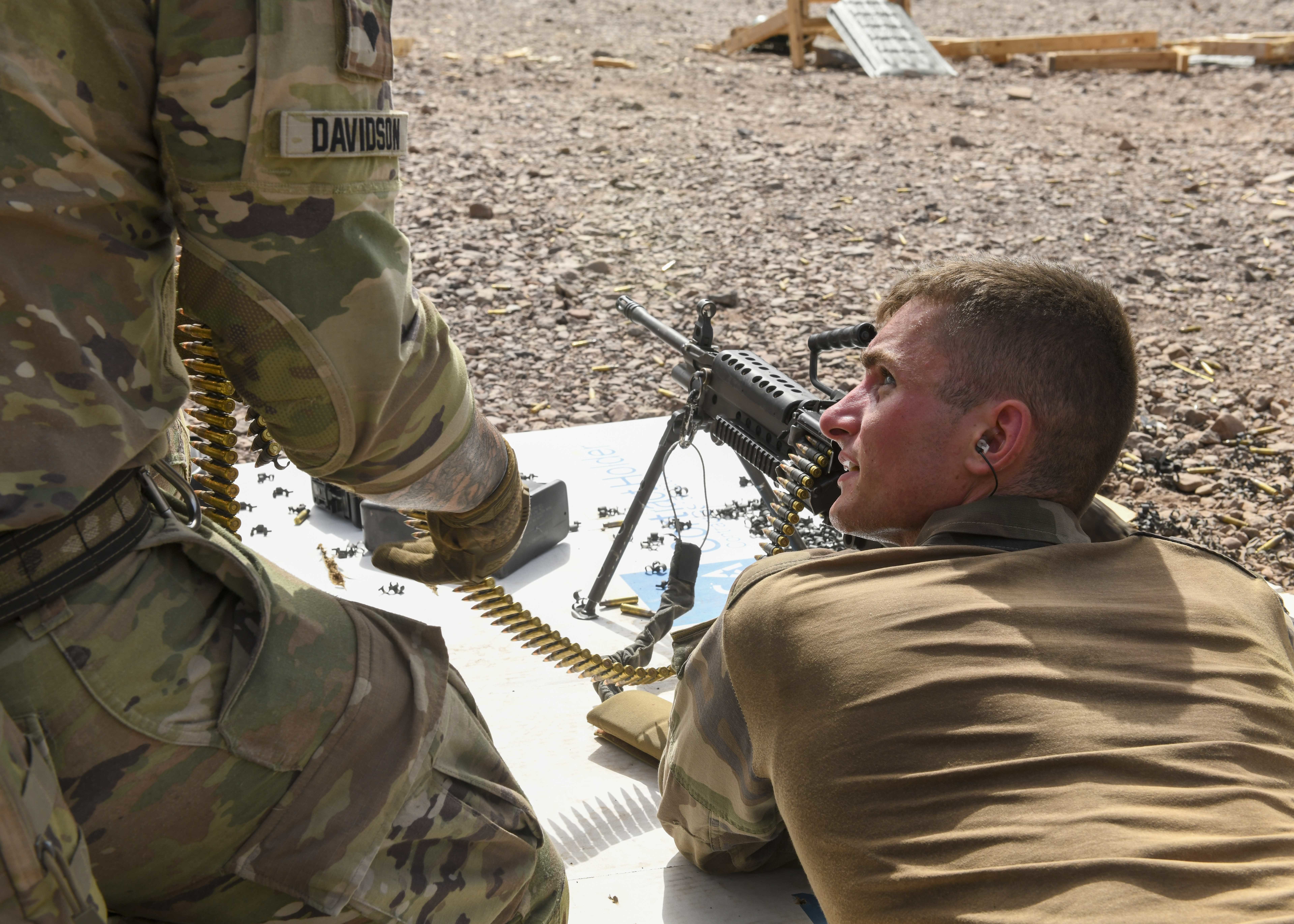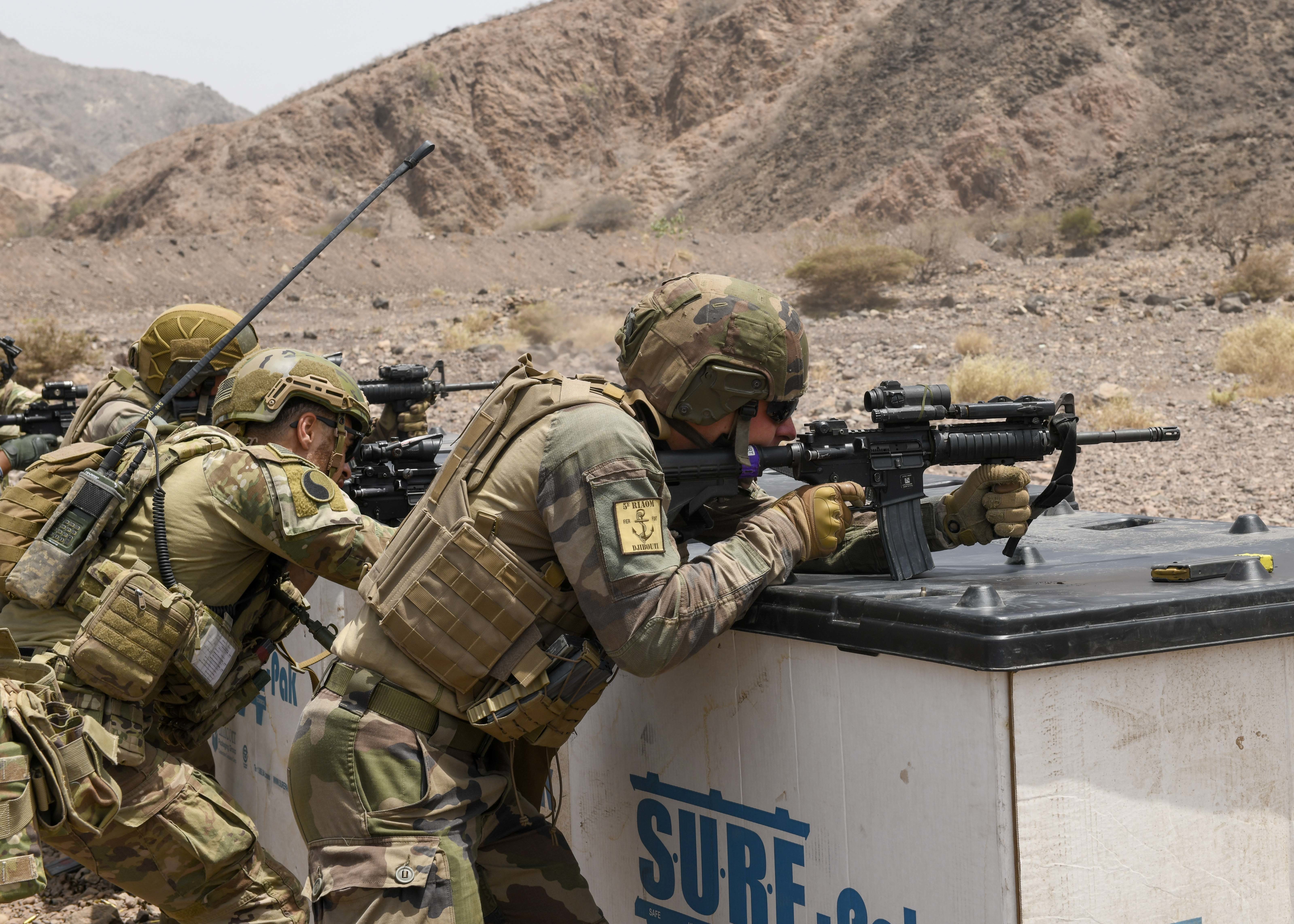 French Soldiers from the 5th Overseas Interarms Regiment and Kentucky Army National Guard Soldiers with Task Force Red Dragon, Combined Joint Task Force - Horn of Africa (CJTF-HOA), conduct weapons familiarization fire at Arta Range, Djibouti, May 15, 2022. CJTF-HOA regularly works alongside allied and partner nations and governmental organizations to achieve a unified effort in improving the peace and prosperity in East Africa. (U.S. Army photo by Spc. Kiersten Breunig)