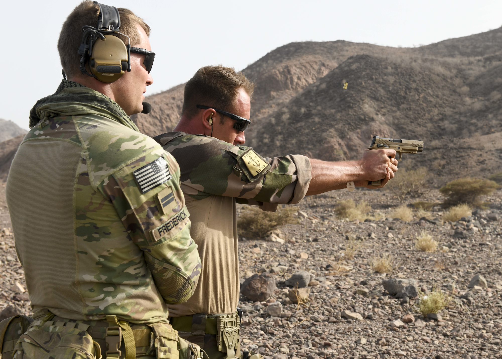 U.S. Army 2nd Lt. Aaron Frederick, platoon leader with Task Force Red Dragon, Combined Joint Task Force - Horn of Africa (CJTF-HOA), conducts weapons familiarization fire with a French Soldier at Arta range complex, Djibouti, May 15, 2022. Operating from Camp Lemonnier, Djibouti, CJTF-HOA regularly works alongside allied and partner nations and governmental organizations to achieve a unified effort in improving the peace and prosperity in East Africa. (U.S. Army photo by Spc. Kiersten Breunig)