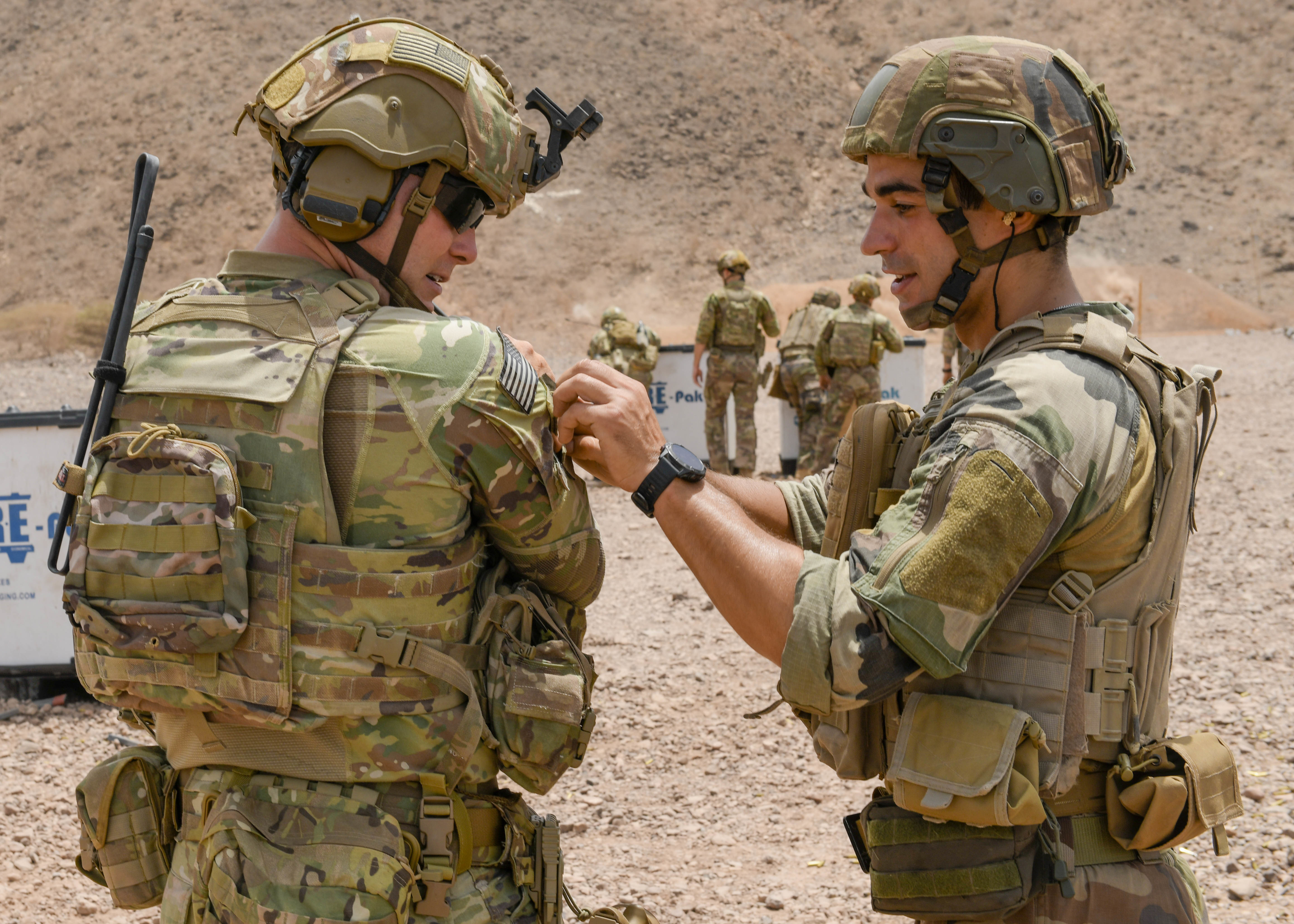 U.S. Army 2nd Lt. Aaron Frederick, platoon leader with Task Force Red Dragon, Combined Joint Task Force - Horn of Africa, trades patches with a French 2nd lieutenant at Arta range complex, Djibouti, May 15, 2022. Operating from Camp Lemonnier, Djibouti, CJTF-HOA regularly works alongside allied and partner nations and governmental organizations to achieve a unified effort in improving the peace and prosperity in East Africa. (U.S. Army photo by Spc. Kiersten Breunig)