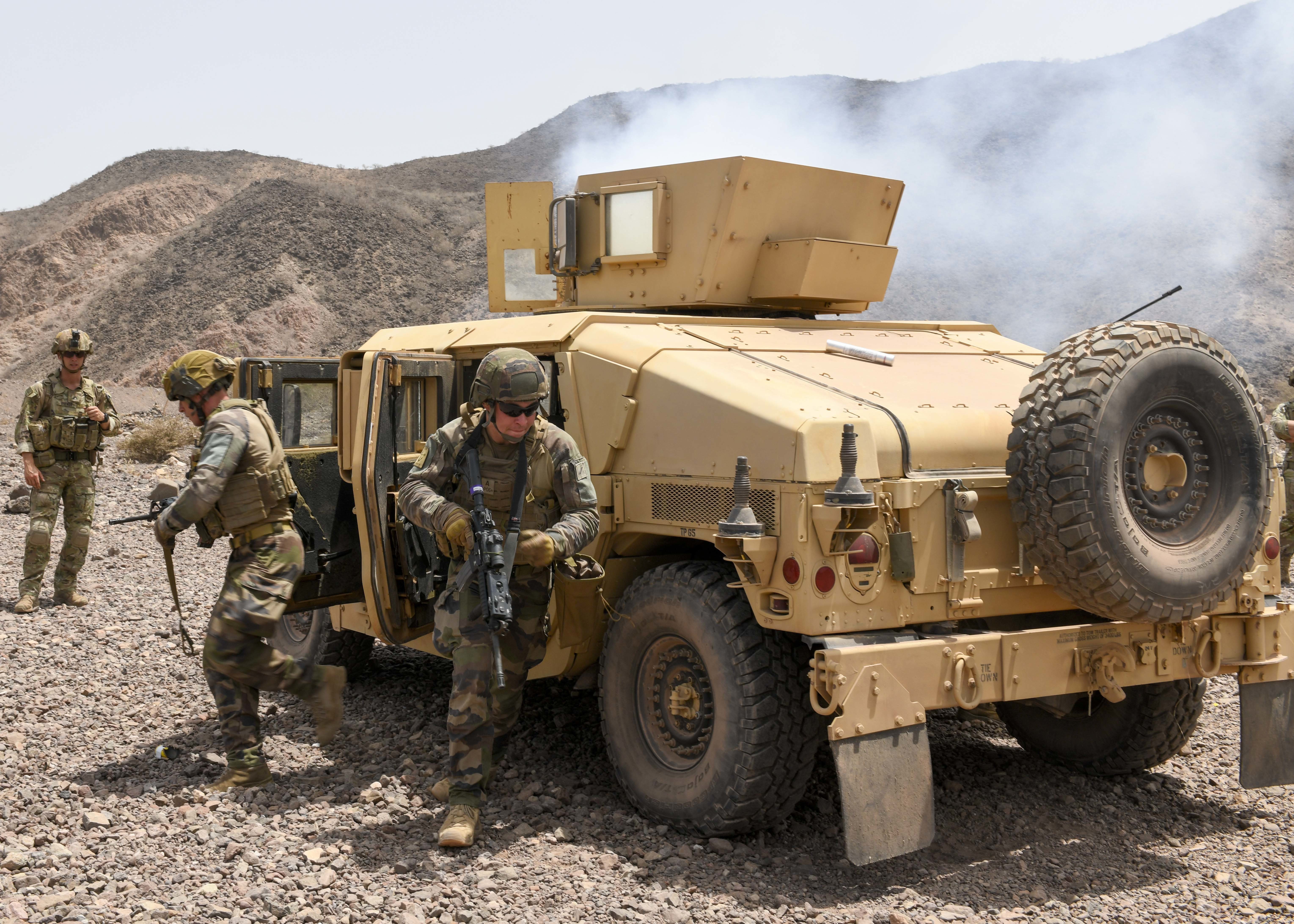 French Soldiers with the 5th Overseas Interarms Regiment and U.S. Soldiers with Task Force Red Dragon, Combined Joint Task Force - Horn of Africa (CJTF-HOA), dismount their vehicle in reaction to simulated ambush at Arta Range, Djibouti, May 15, 2022. CJTF-HOA regularly works alongside allied and partner nations and governmental organizations to achieve a unified effort in improving the peace and prosperity in East Africa. (U.S. Army photo by Spc. Kiersten Breunig)