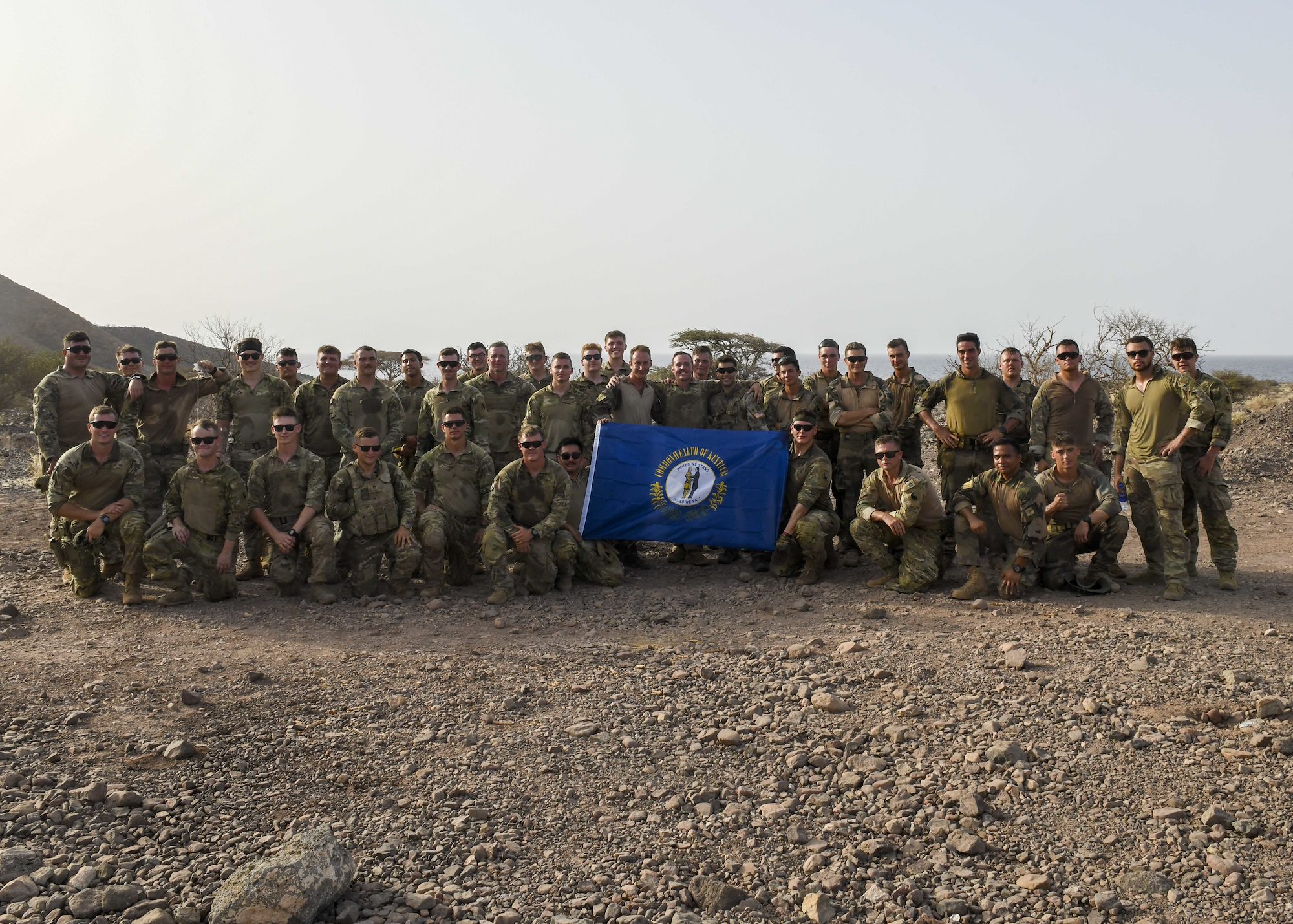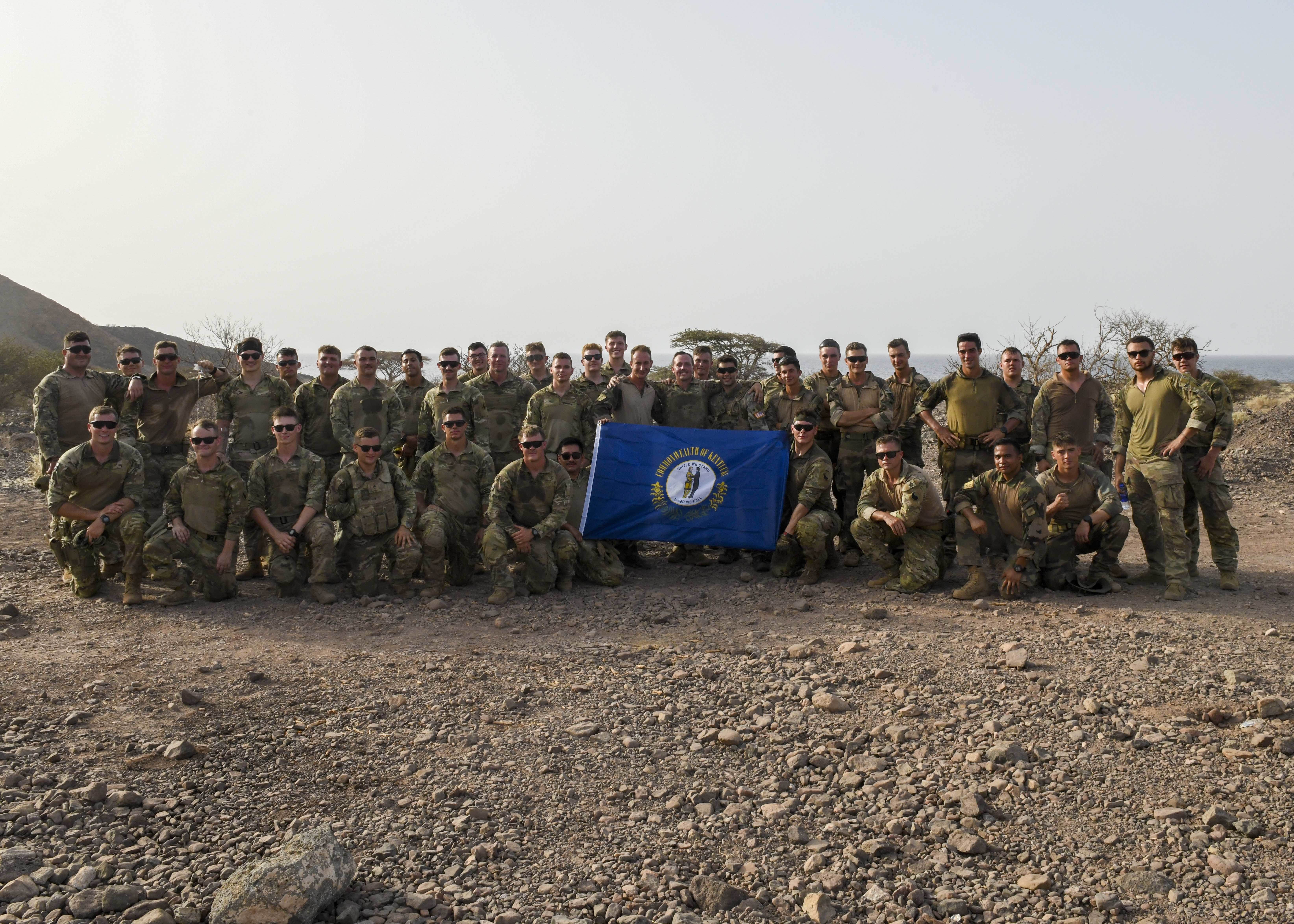 French Soldiers from the 5th Overseas Interarms Regiment and Kentucky Army National Guard Soldiers with Task Force Red Dragon, Combined Joint Task Force - Horn of Africa (CJTF-HOA), pose for a photo after conducting weapons familiarization fire at Arta Range, Djibouti, May 15, 2022. CJTF-HOA regularly works alongside allied and partner nations and governmental organizations to achieve a unified effort in improving the peace and prosperity in East Africa. (U.S. Army photo by Spc. Kiersten Breunig)