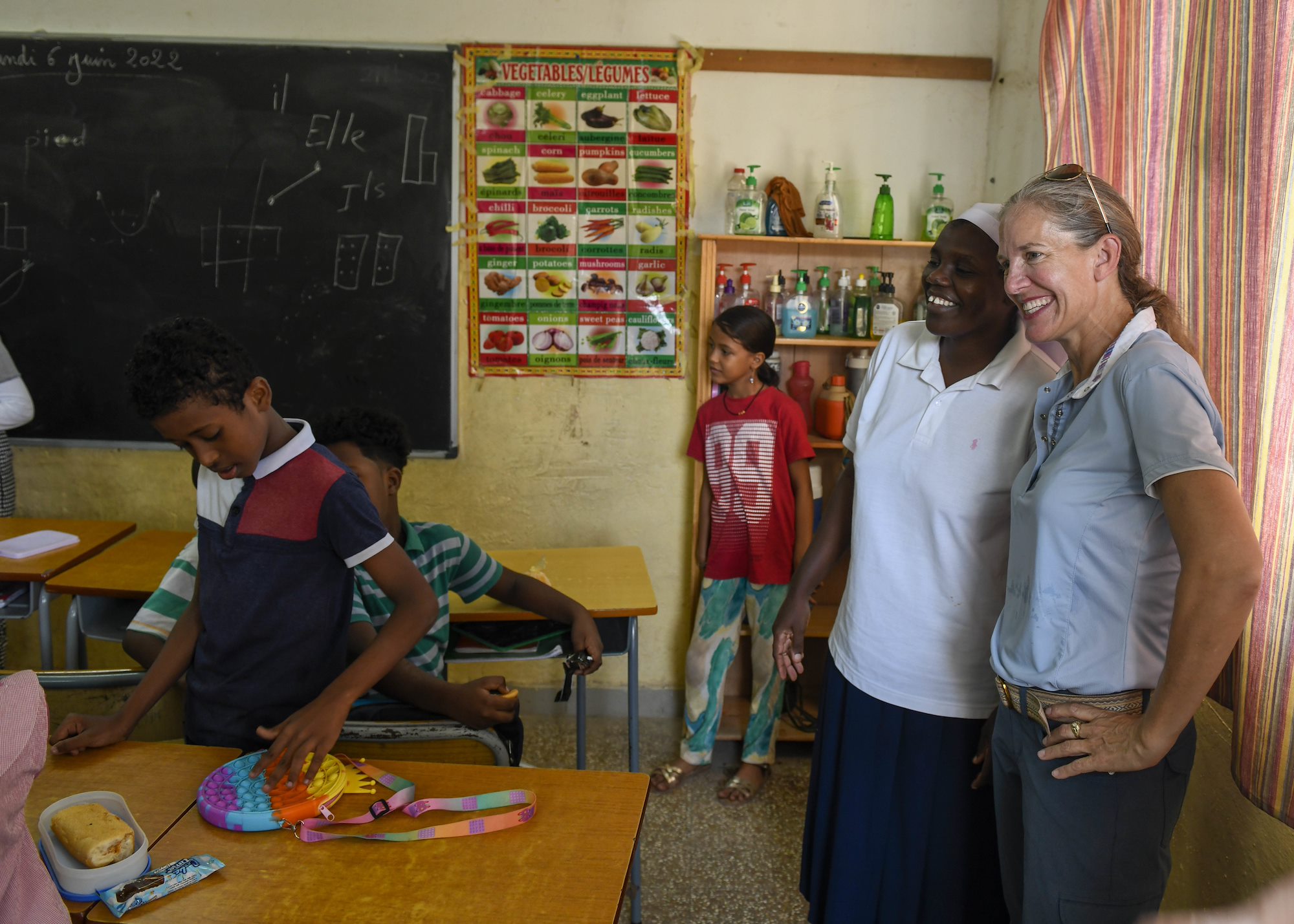 U.S. Army Maj. Gen. Jami Shawley, commanding general of Combined Joint Task Force-Horn of Africa (CJTF-HOA), tours a local school in Djibouti, June 6, 2022. Service members serving at Camp Lemonnier volunteer often, conducting knowledge exchanges and playing basketball, soccer, and other activities with the children. (U.S. Army photo by Spc. Kiersten Breunig)