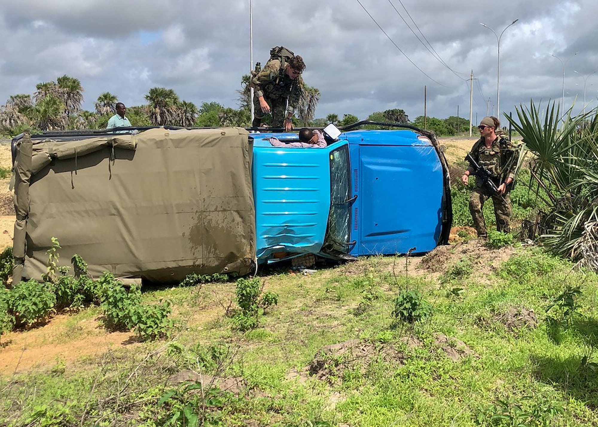 Virginia National Guard Soldiers assigned to 1st squad, 1st platoon, B Company, 1-116th Infantry Regiment, Task Force Red Dragon, Combined Joint Task Force - Horn of Africa (CJTF-HOA) respond to a vehicle accident during an area security patrol May 25, 2022, Manda Bay, Kenya. (courtesy photo)
