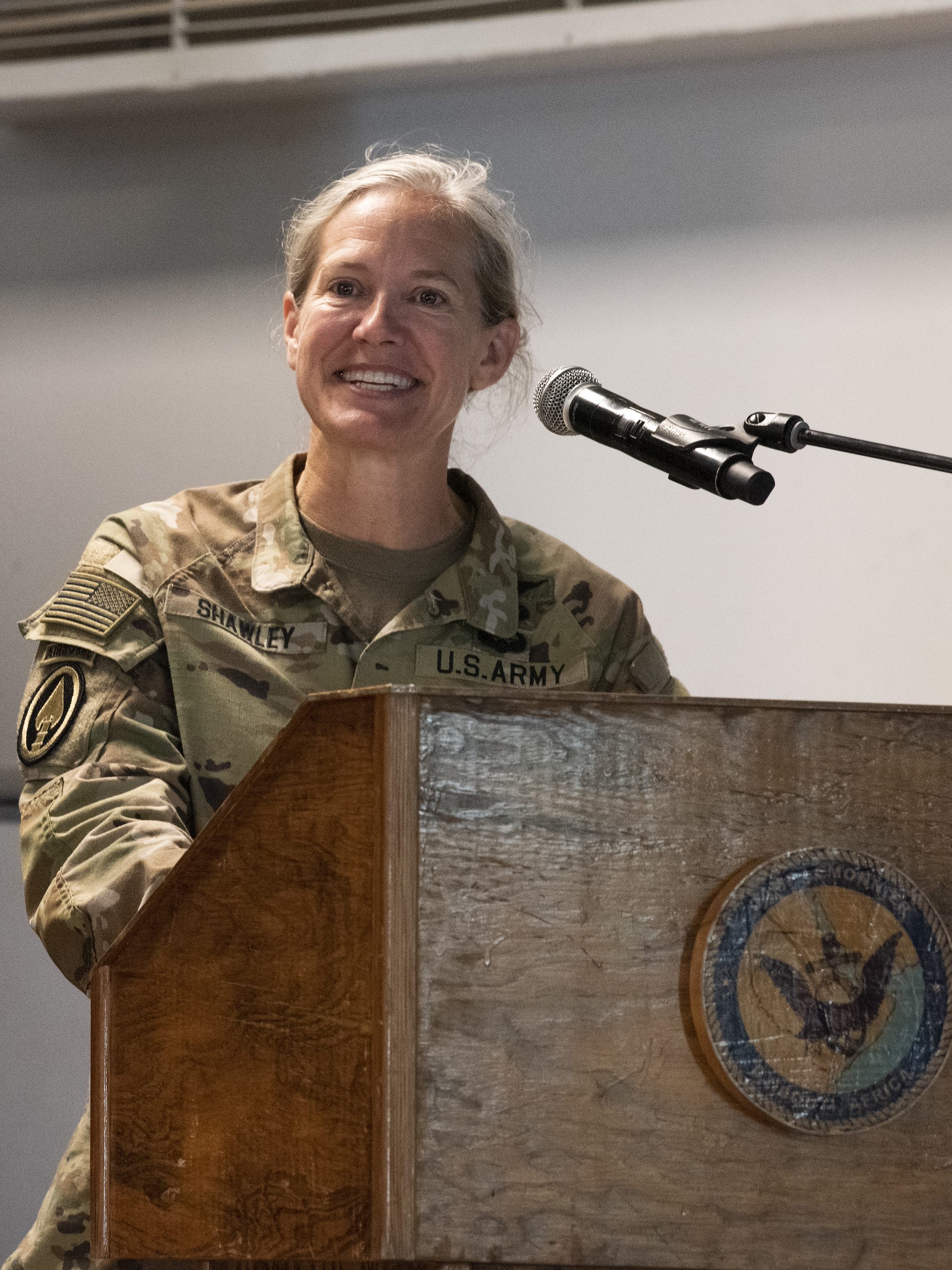 U.S. Army Maj. Gen. Jami Shawley, commanding general of the Combined Joint Task Force – Horn of Africa (CJTF-HOA), delivers comments during the Air Operations Battalion (AOB) transfer of authority ceremony from the 1st Battalion, 107th Aviation Regiment (AOB) to the 1st Battalion, 58th Aviation Regiment (AOB) at Camp Lemonnier, Djibouti, June 15, 2022. The 1-107th AOB first arrived to Djibouti in October 2021, managing three critical sites across East Africa. The 1-58th AOB assumed their mission June 15, now providing support to CJTF-HOA. (U.S. Air Force photo by Tech. Sgt. Lynette M. Rolen)