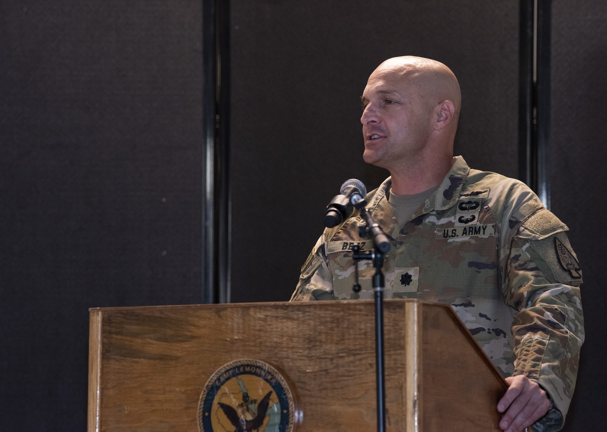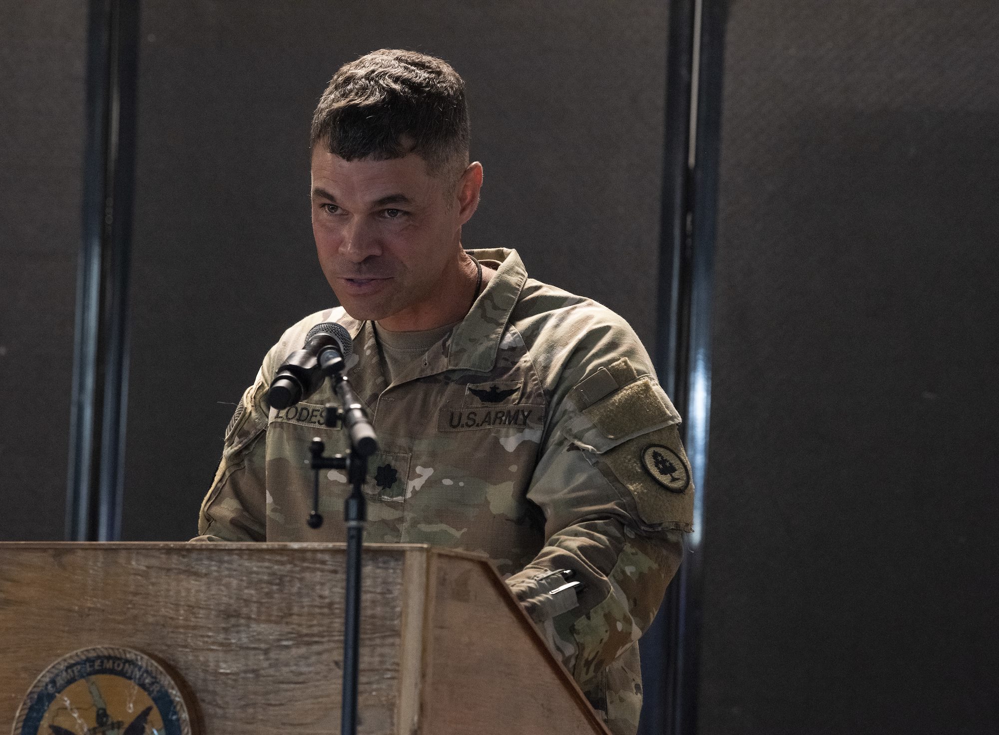 U.S. Army Lt. Col. John Lodes, battalion commander of the 1st Battalion, 107th Aviation Regiment (AOB), delivers comments during the Air Operations Battalion (AOB) transfer of authority ceremony from the 1-107th AOB to the 1st Battalion, 58th Aviation Regiment (AOB) at Camp Lemonnier, Djibouti, June 15, 2022. The 1-107th AOB conducted over 12,500 aircraft movements and throughput of over 2,400 passengers without incident during their deployment in support of CJTF-HOA. (U.S. Air Force photo by Tech. Sgt. Lynette M. Rolen)
