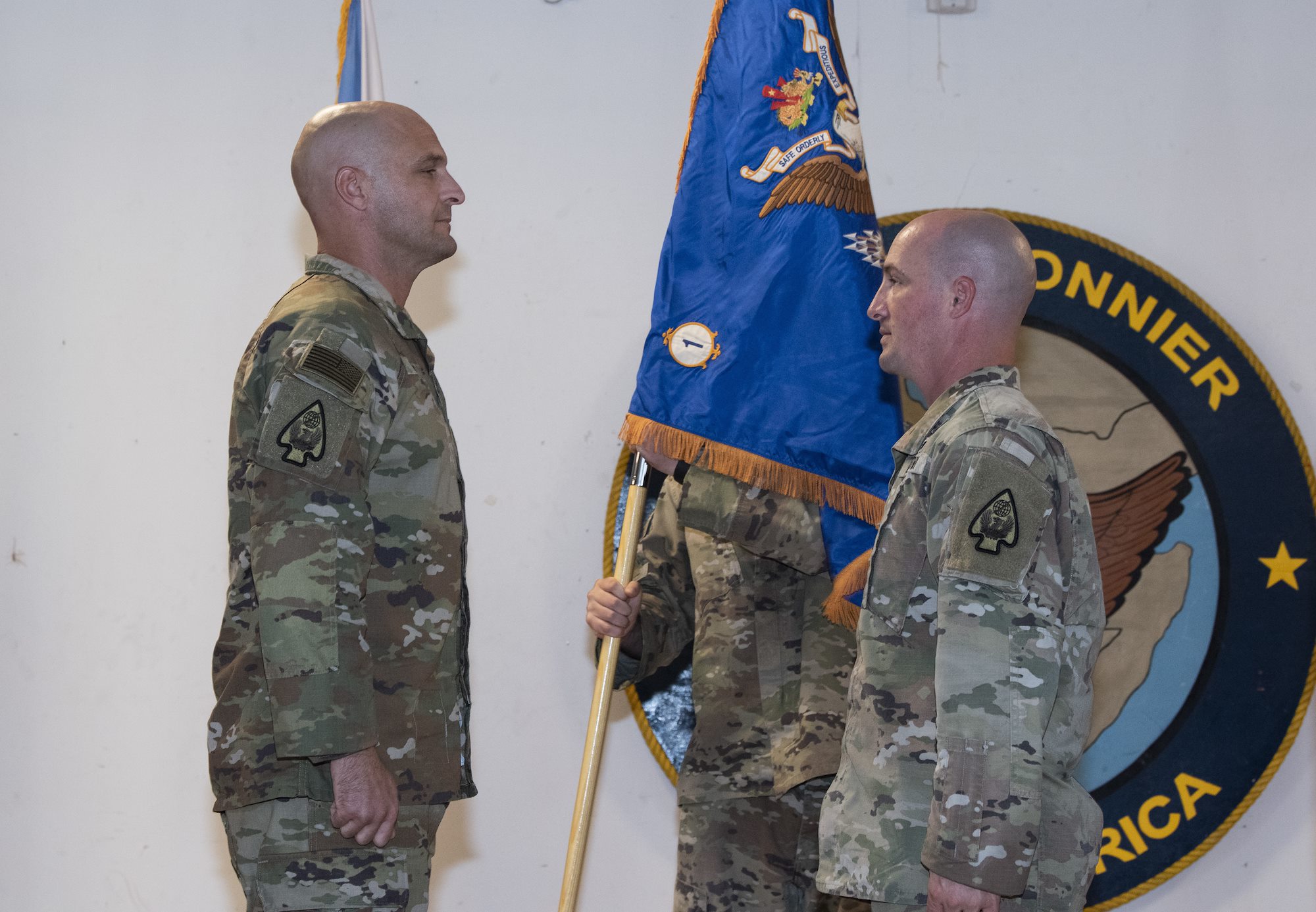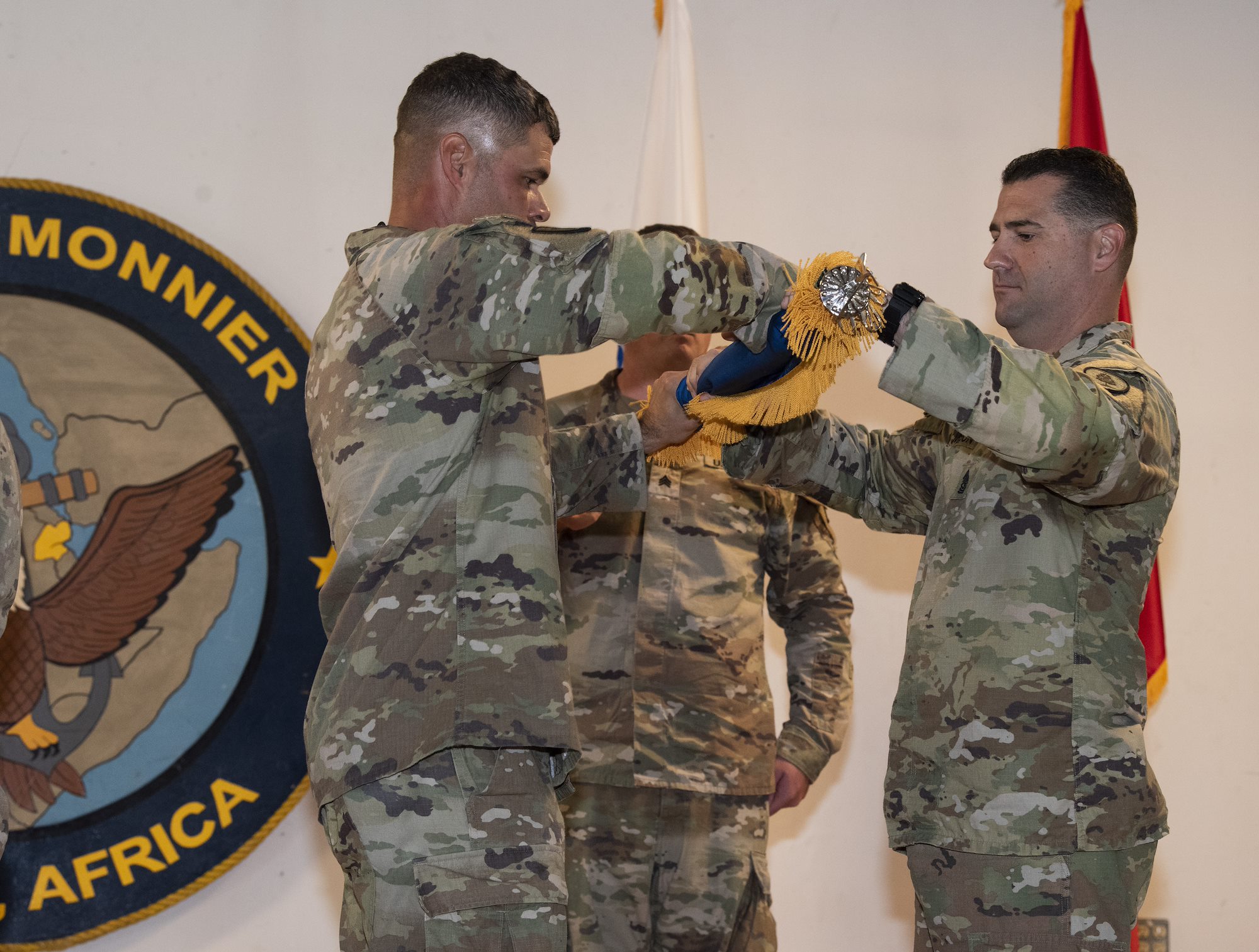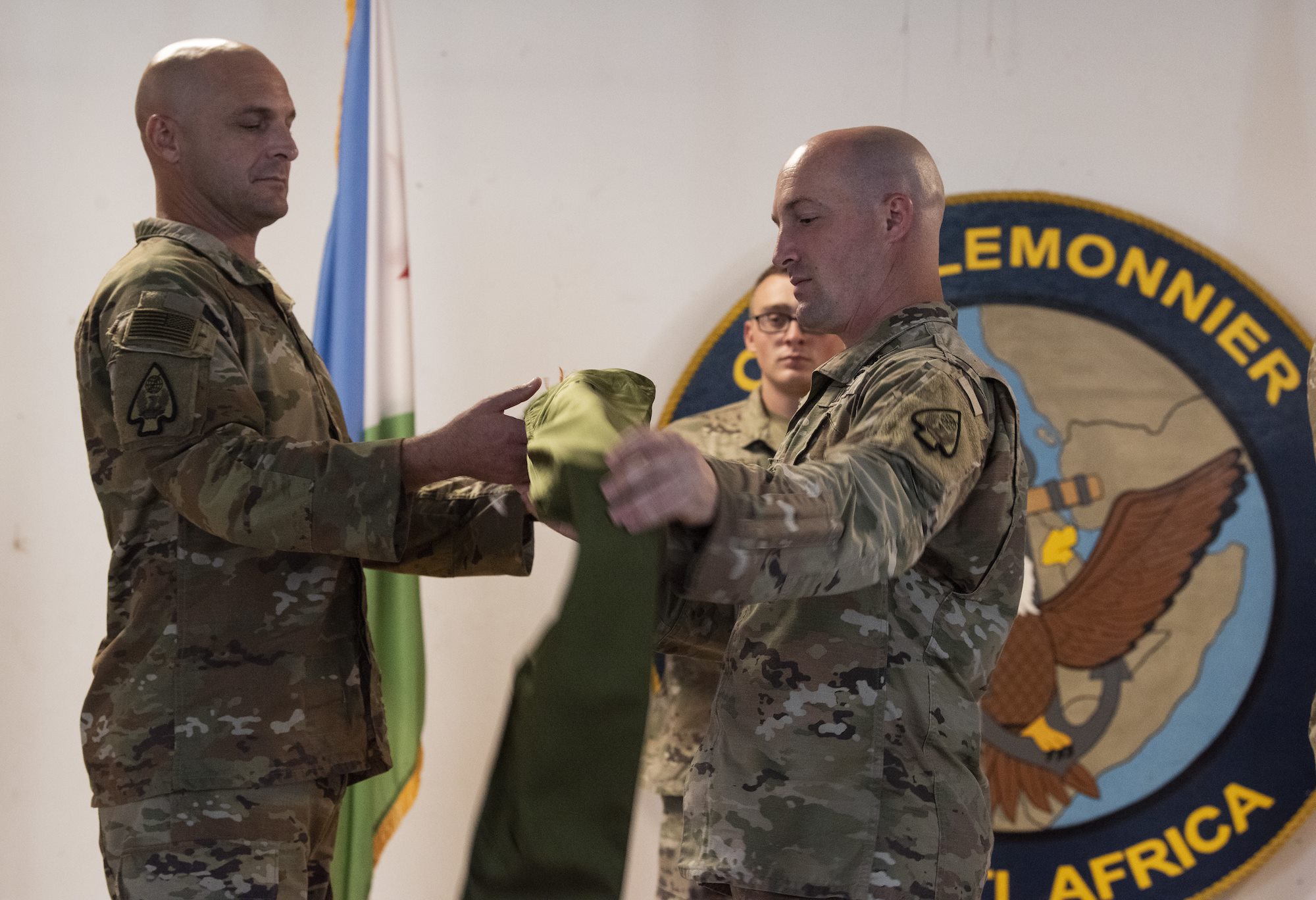 U.S. Army Lt. Col. Travis Betz (left), battalion commander of the 1st Battalion, 58th Aviation Regiment (AOB) and U.S. Army 1st Sgt. Shane Kester (right), senior enlisted leader of the 1-58th AOB, uncase the regiment colors during the Air Operations Battalion (AOB) transfer of authority ceremony from the 1st Battalion, 107th Aviation Regiment (AOB) to the 1-58th AOB at Camp Lemonnier, Djibouti, June 15, 2022. The uncasing of the colors signifies the battalion’s arrival and preparedness to assume its role within the Combined Joint Task Force – Horn of Africa. (U.S. Air Force photo by Tech. Sgt. Lynette M. Rolen)