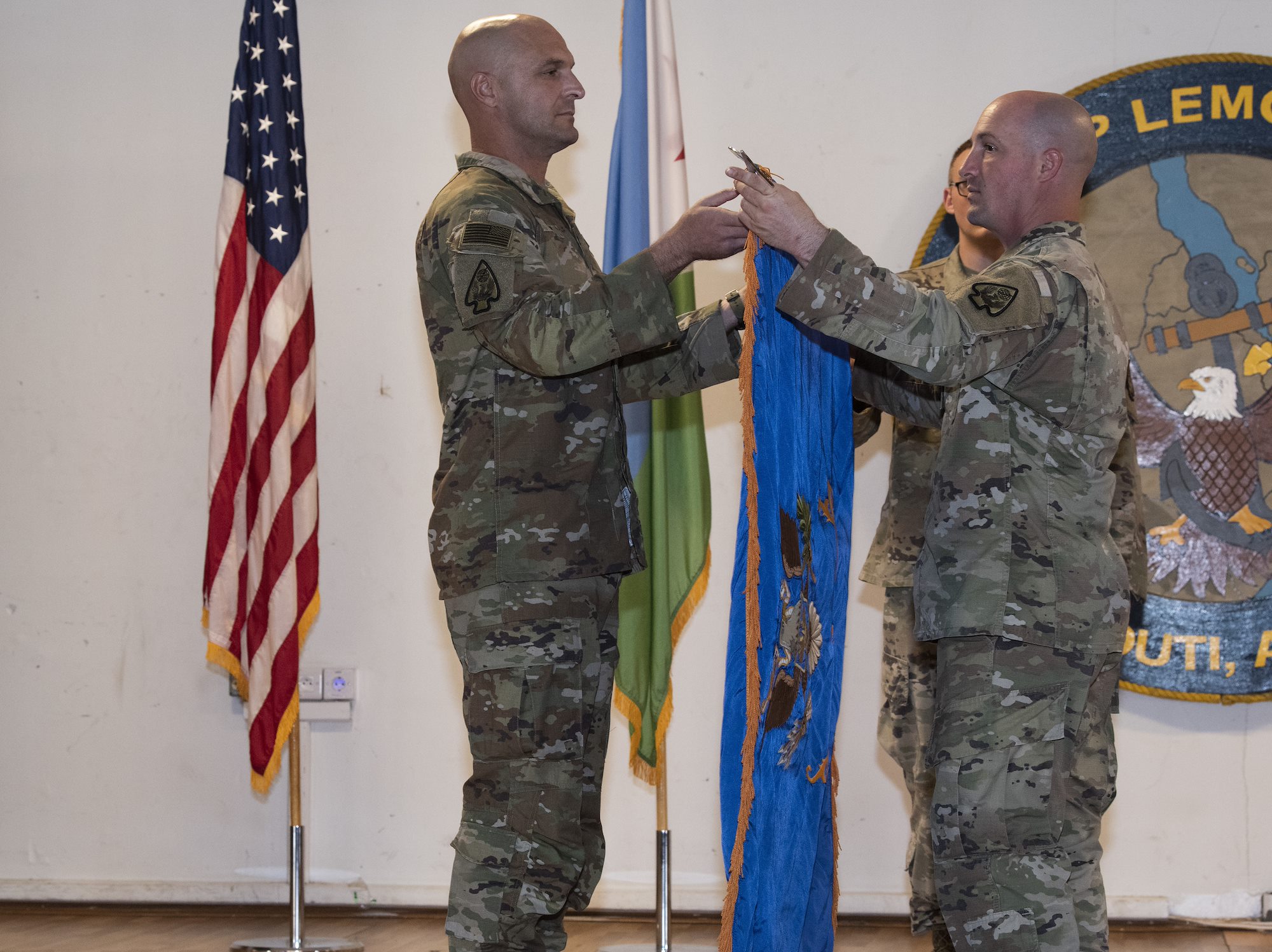 U.S. Army Lt. Col. John Lodes (left), battalion commander of the 1st Battalion, 107th Aviation Regiment (AOB), and U.S. Army Sgt. Maj. John Maison, senior enlisted leader of the 1-107th AOB, case the colors during the Air Operations Battalion (AOB) transfer of authority ceremony from the 1-107th AOB to the 1st Battalion, 58th Aviation Regiment (AOB) at Camp Lemonnier, Djibouti, June 15, 2022. The casing of the colors signifies mission completion and that the battalion is prepared to redeploy back home. (U.S. Air Force photo by Tech. Sgt. Lynette M. Rolen)