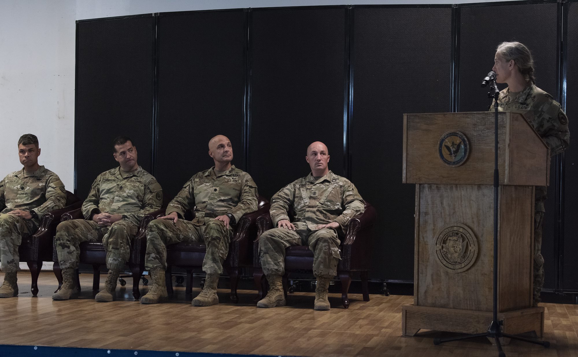 U.S. Army Maj. Gen. Jami Shawley, commanding general of the Combined Joint Task Force – Horn of Africa (CJTF-HOA), delivers comments during a transfer of authority ceremony between the 1st Battalion, 107th Aviation Regiment (Airfield Operations Battalion) to the 1st Battalion, 58th Aviation Regiment (AOB) at Camp Lemonnier, Djibouti, June 15, 2022. The 1-107th AOB arrived to Djibouti in October 2021 and managed three critical sites across East Africa during their deployment. The 1-58th AOB assumed their mission June 15, now providing support to CJTF-HOA. (U.S. Air Force photo by Tech. Sgt. Lynette M. Rolen)