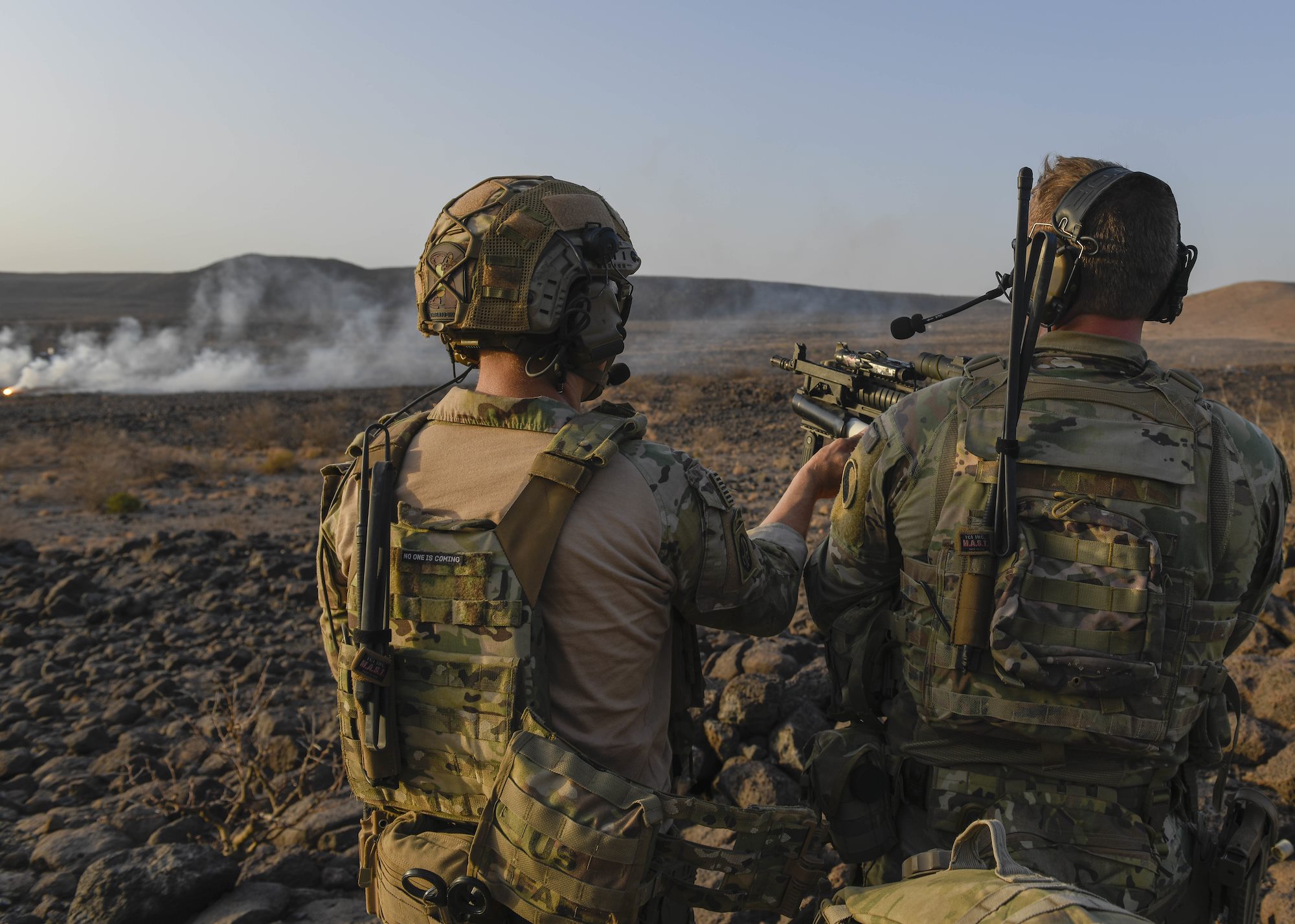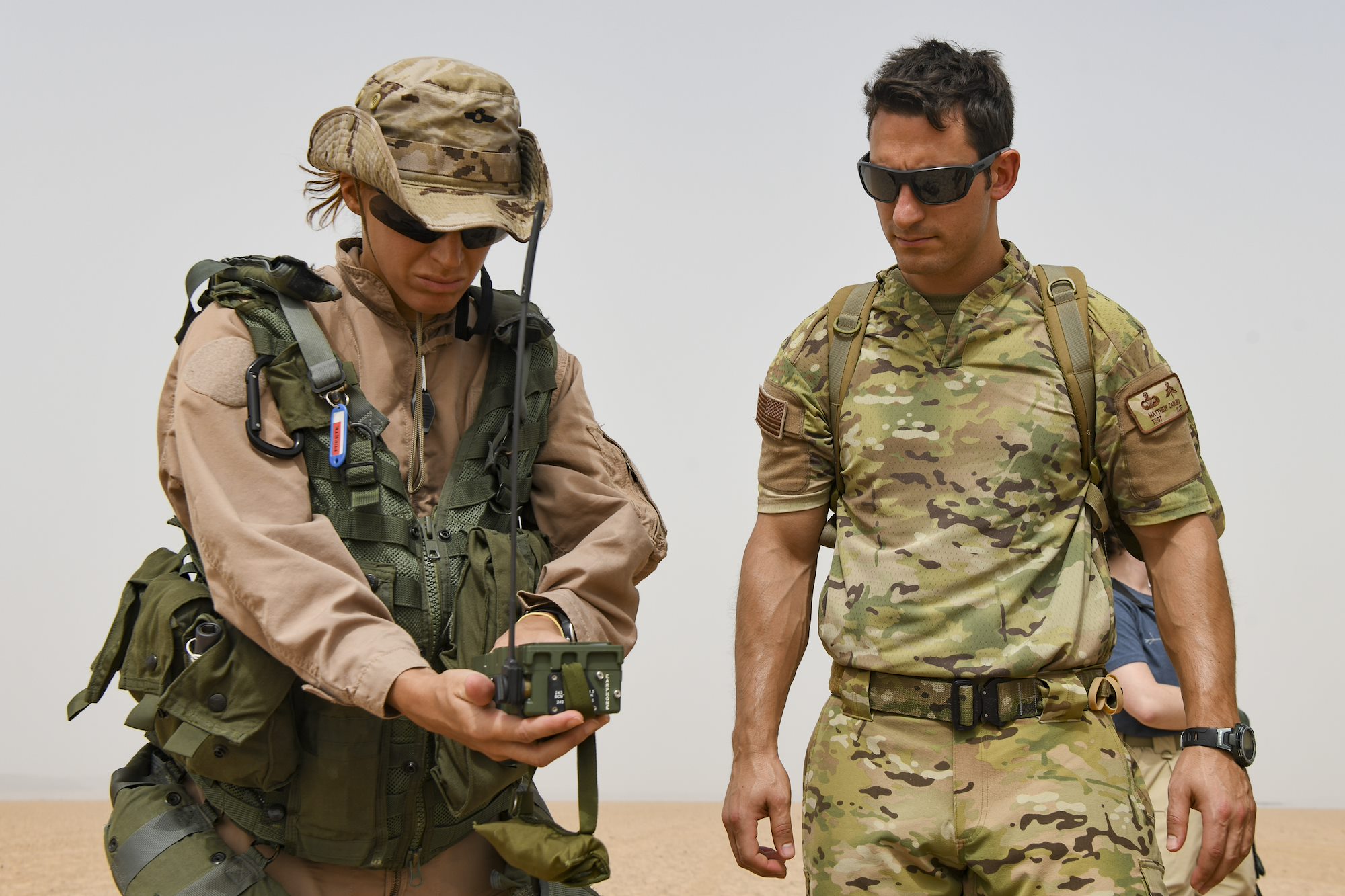 A Spanish Armed Forces soldier and U.S. Air Force Tech. Sgt Matthew Carlino, a Combined Joint Task Force – Horn of Africa (CJTF-HOA) survival, evasion, resistance and escape specialist, both communicate with simulated friendly forces during Exercise Bull Shark, Grand Bara, Djibouti, June 21, 2022. Exercise Bull Shark is a personnel recovery exercise involving members of CJTF-HOA and the European Union Naval Force aimed to strengthen interoperability between like-minded partners in the region; members of the Spanish Armed Forces and Djibouti Armed Forces also participated in the exercise this iteration. (U.S. Air Force photo by Senior Airman Blake Wiles)