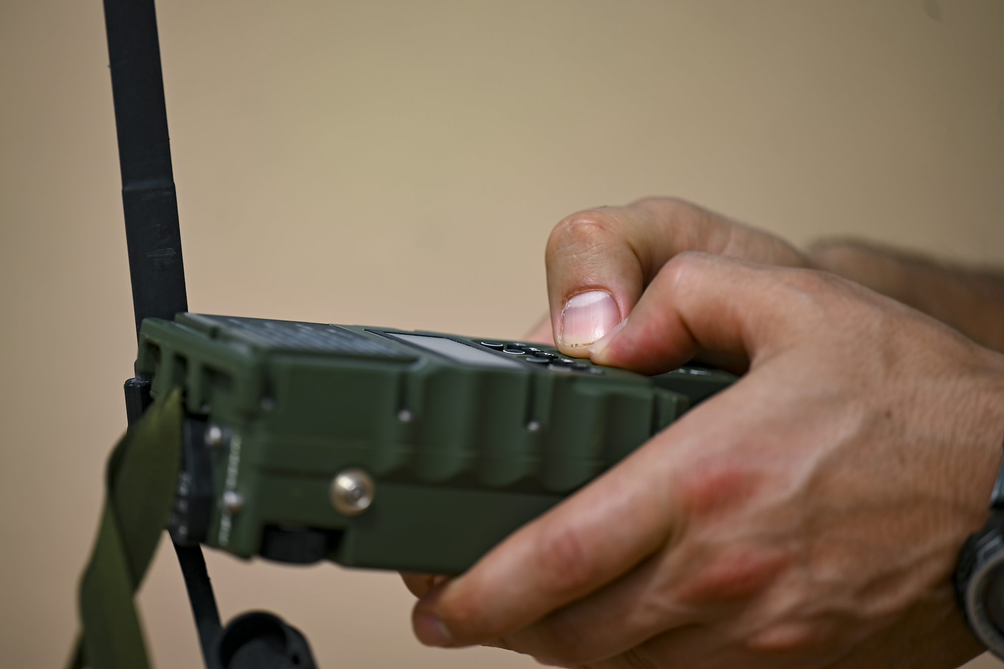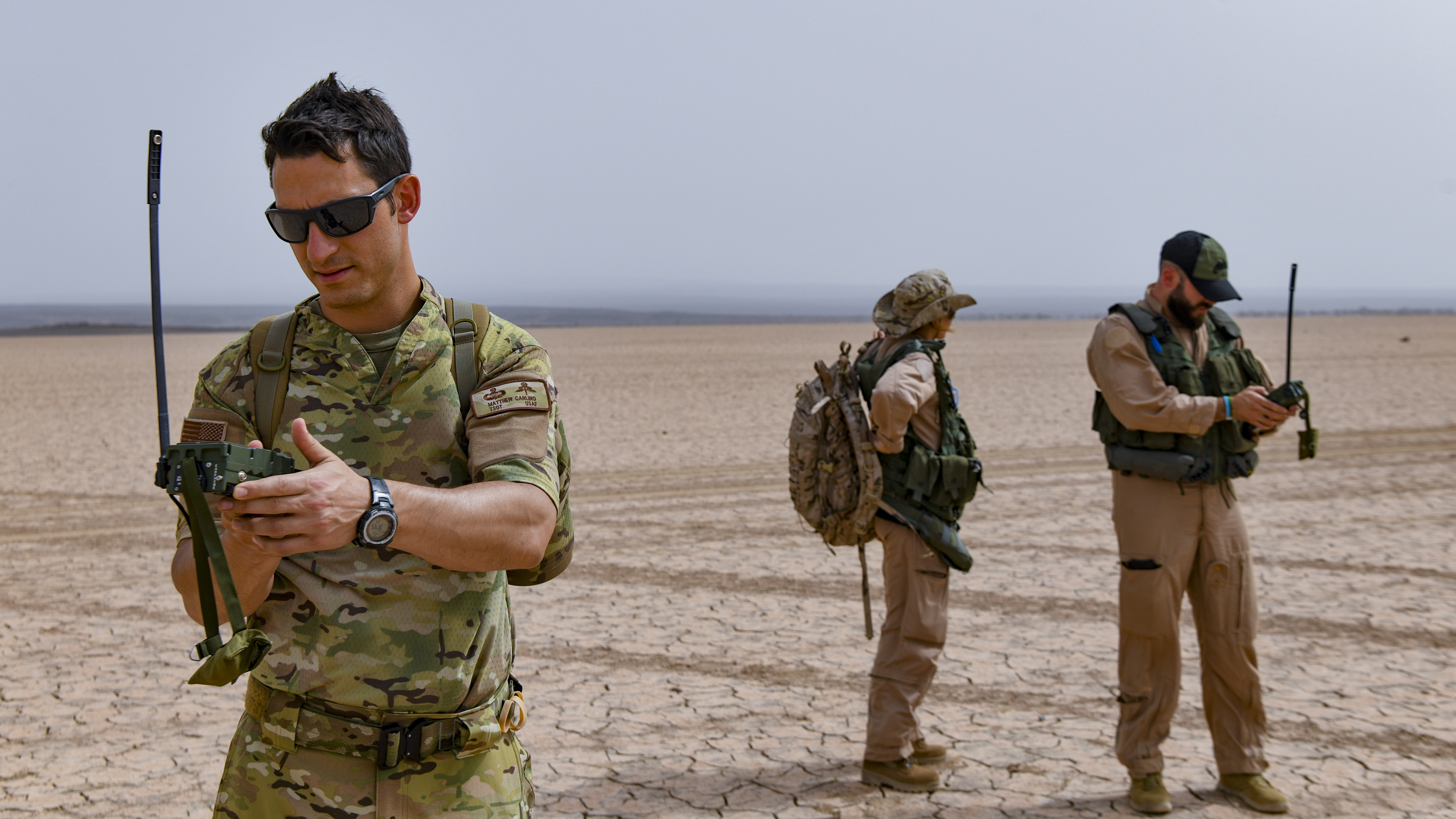 U.S. Air Force Tech. Sgt Matthew Carlino, a Combined Joint Task Force – Horn of Africa (CJTF-HOA) survival, evasion, resistance, and escape specialist, communicates with simulated friendly forces during Exercise Bull Shark, Grand Bara, Djibouti, June 21, 2022. Exercise Bull Shark is a personnel recovery exercise involving members of CJTF-HOA and the European Union Naval Force aimed to strengthen interoperability between like-minded partners in the region; members of the Spanish Armed Forces and Djibouti Armed Forces also participated in the exercise this iteration. (U.S. Air Force photo by Senior Airman Blake Wiles)