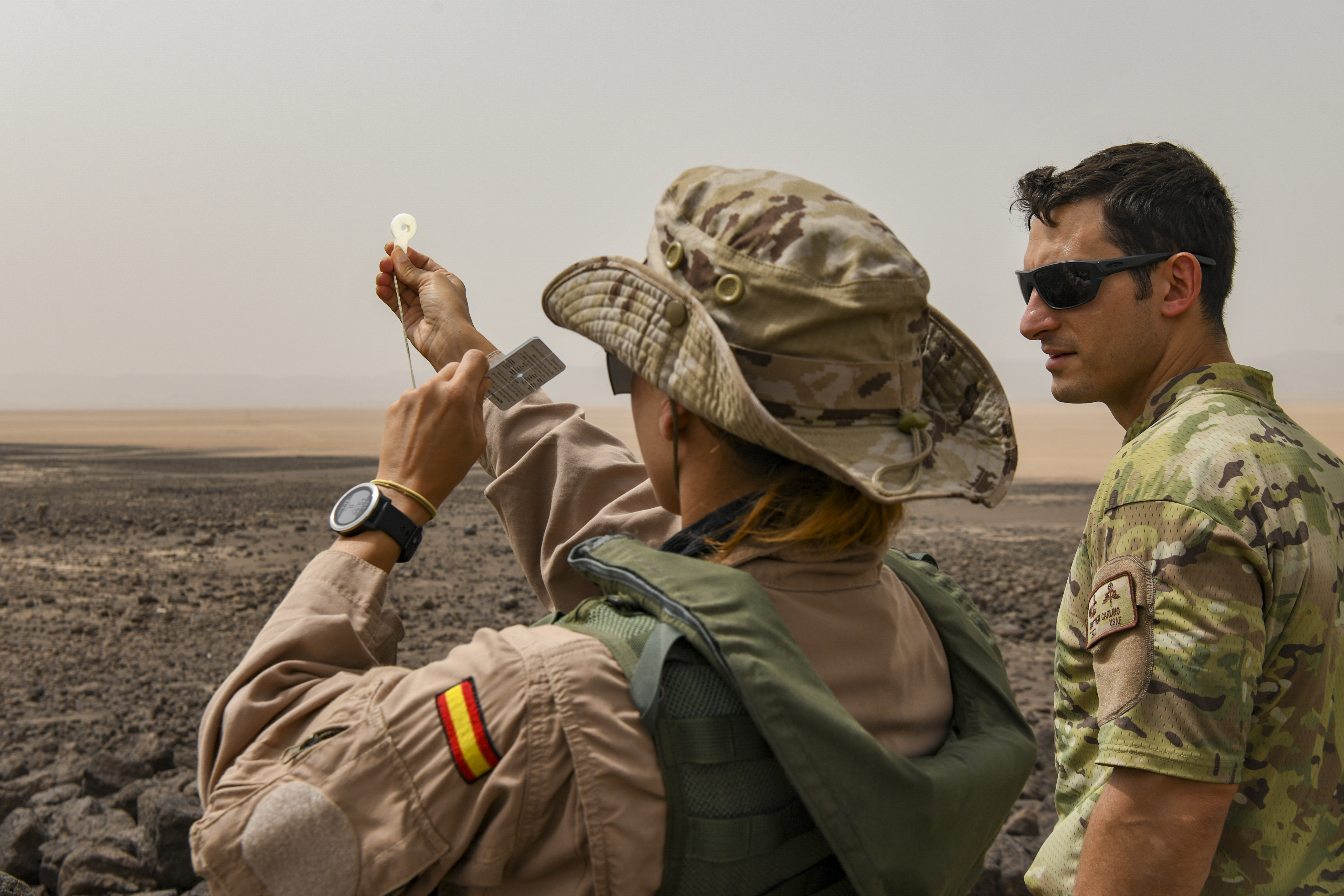 A Spanish Armed Forces soldier and U.S. Air Force Tech. Sgt Matthew Carlino, a Combined Joint Task Force – Horn of Africa (CJTF-HOA) survival, evasion, resistance, and escape specialist, use a signal mirror during Exercise Bull Shark, Grand Bara, Djibouti, June 21, 2022. Exercise Bull Shark is a personnel recovery exercise involving members of CJTF-HOA and the European Union Naval Force aimed to strengthen interoperability between like-minded partners in the region; members of the Spanish Armed Forces and Djibouti Armed Forces also participated in the exercise this iteration. (U.S. Air Force photo by Senior Airman Blake Wiles)