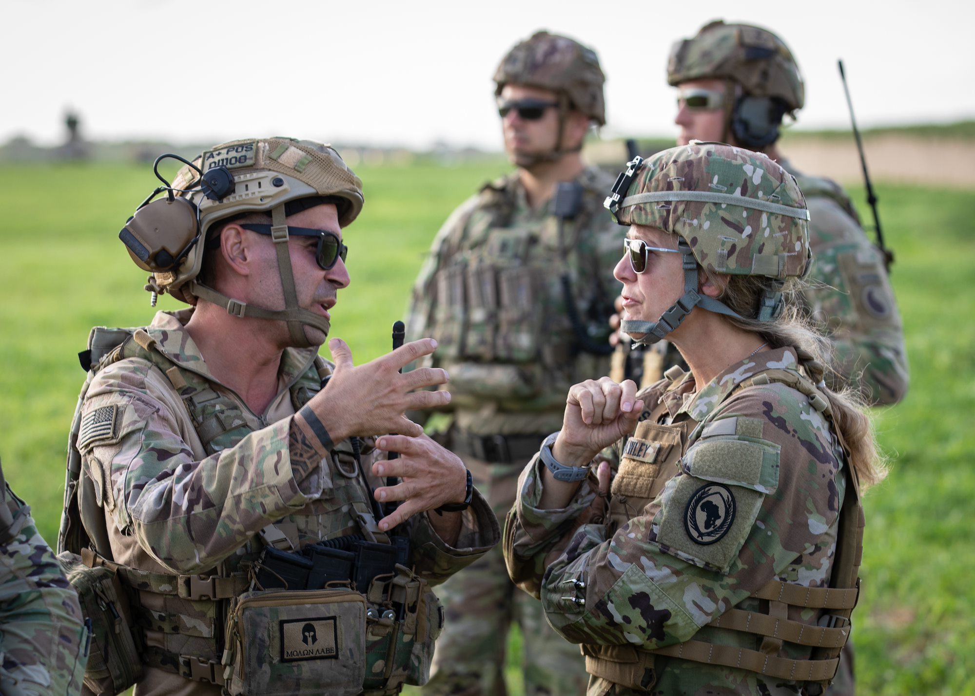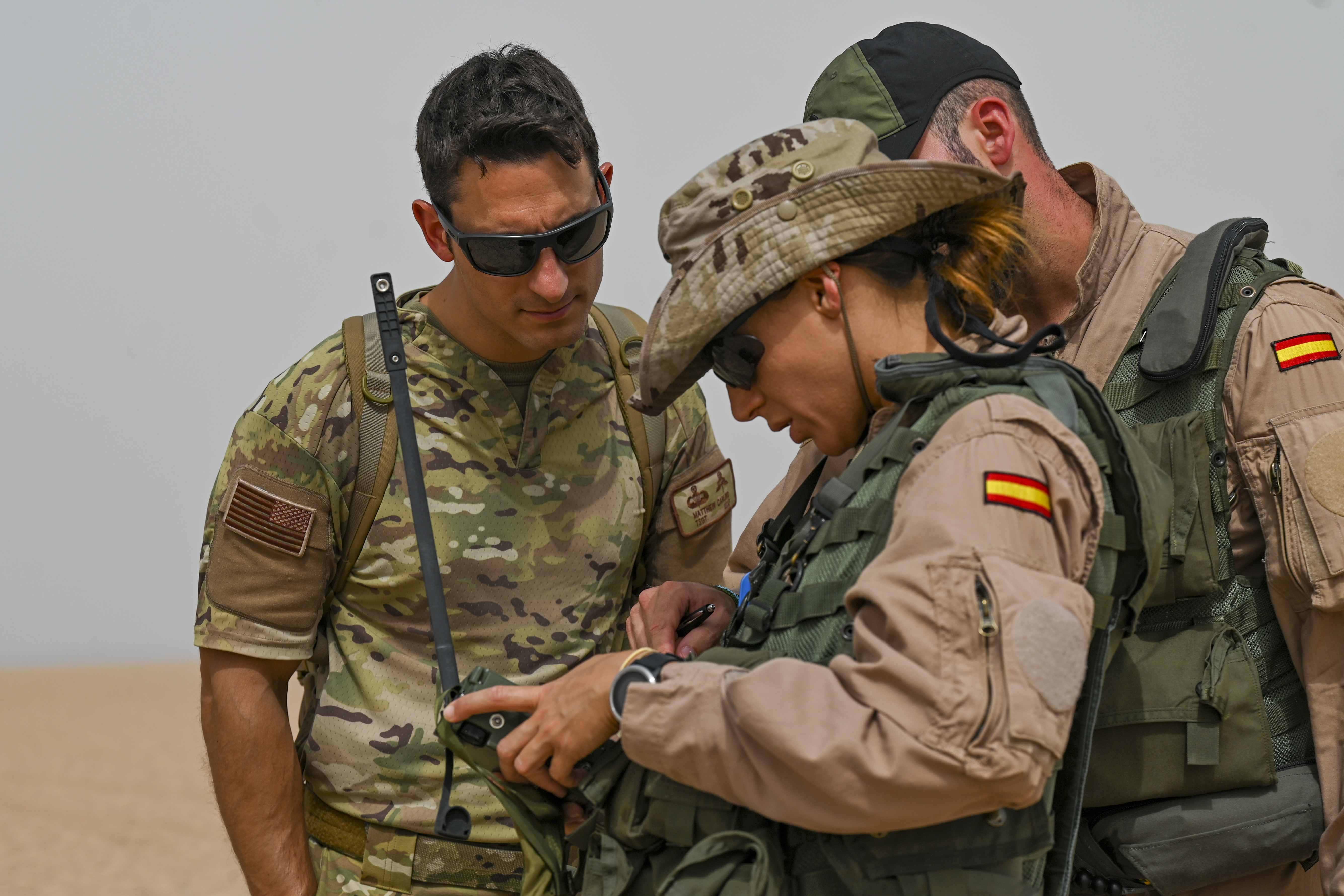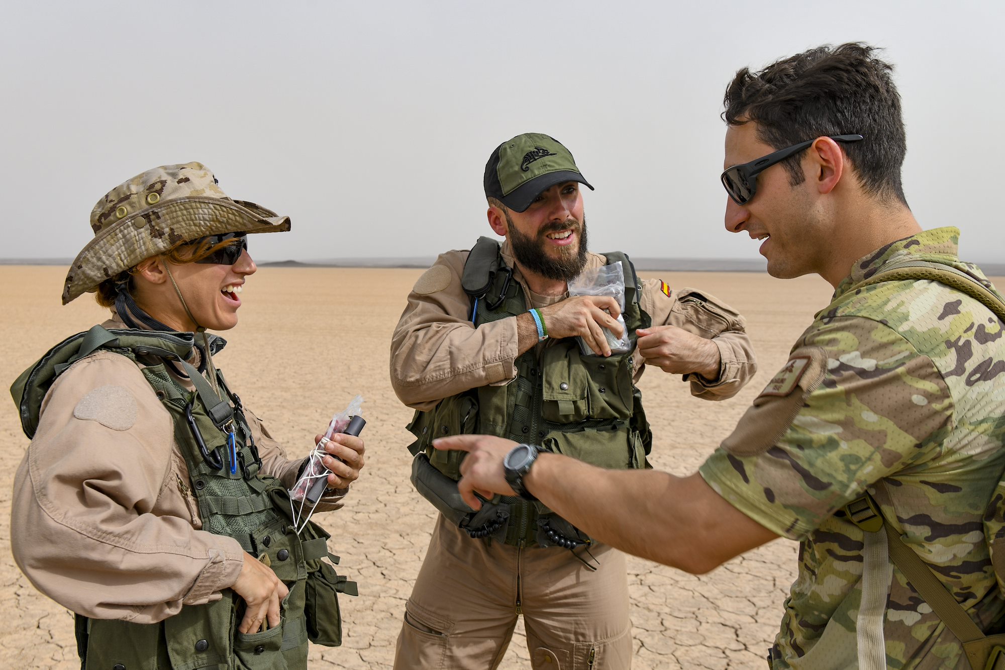 Spanish Armed Forces soldiers meet with U.S. Air Force Tech. Sgt Matthew Carlino (right), a Combined Joint Task Force – Horn of Africa (CJTF-HOA) survival, evasion, resistance and escape specialist, during Exercise Bull Shark, Grand Bara, Djibouti, June 21, 2022. Exercise Bull Shark is a personnel recovery exercise involving members of CJTF-HOA and the European Union Naval Force aimed to strengthen interoperability between like-minded partners in the region; members of the Spanish Armed Forces and Djibouti Armed Forces also participated in the exercise this iteration. (U.S. Air Force photo by Senior Airman Blake Wiles)