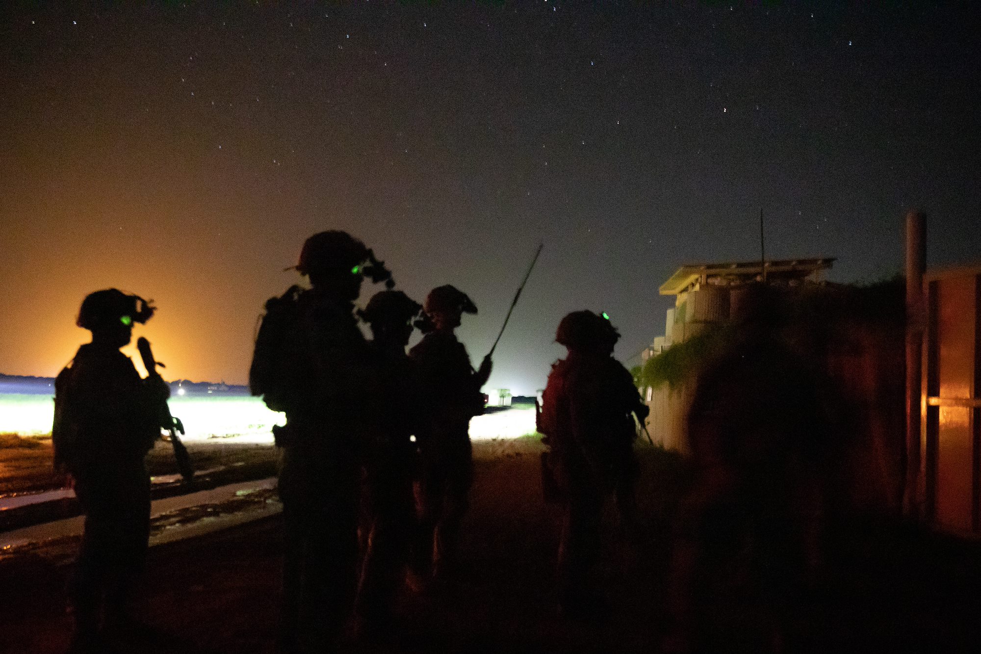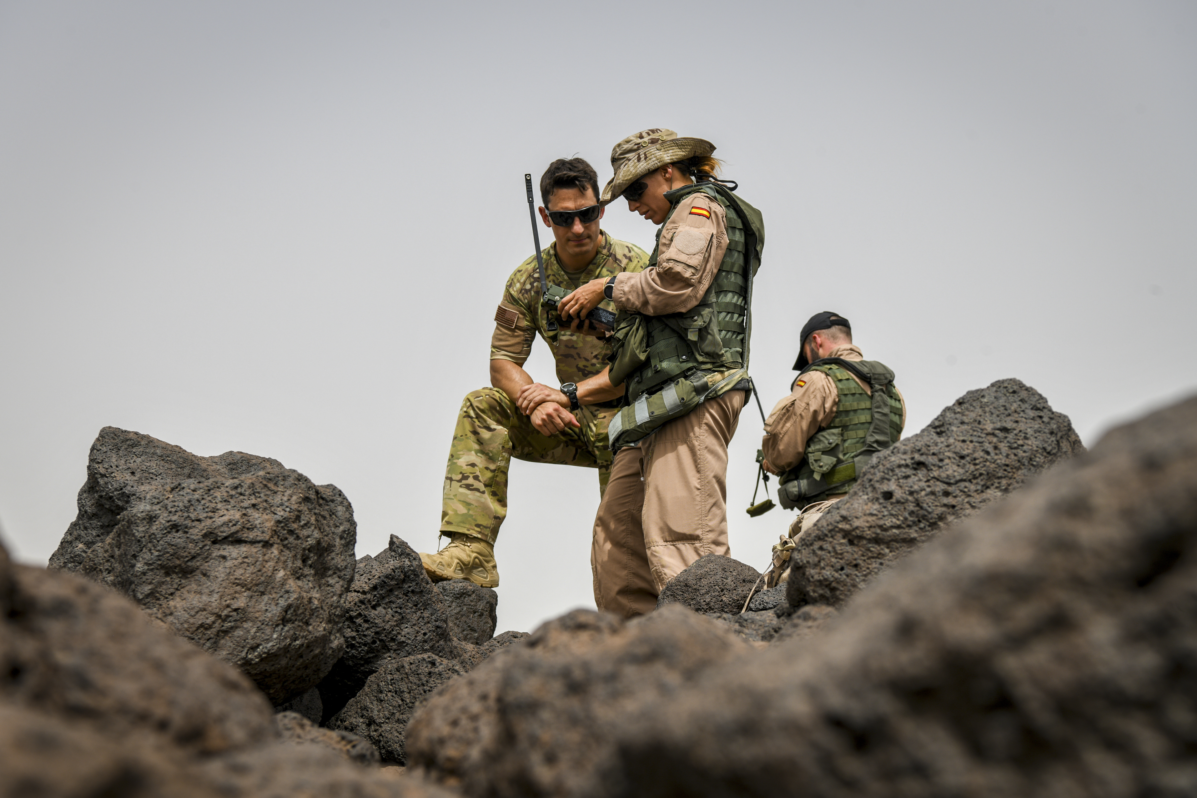 Spanish Armed Forces soldiers and U.S. Air Force Tech. Sgt Matthew Carlino, a Combined Joint Task Force – Horn of Africa (CJTF-HOA) survival, evasion, resistance and escape specialist, communicate with simulated friendly forces during Exercise Bull Shark, Grand Bara, Djibouti, June 21, 2022. Exercise Bull Shark is a personnel recovery exercise involving members of CJTF-HOA and the European Union Naval Force aimed to strengthen interoperability between like-minded partners in the region; members of the Spanish Armed Forces and Djibouti Armed Forces also participated in the exercise this iteration. (U.S. Air Force photo by Senior Airman Blake Wiles)