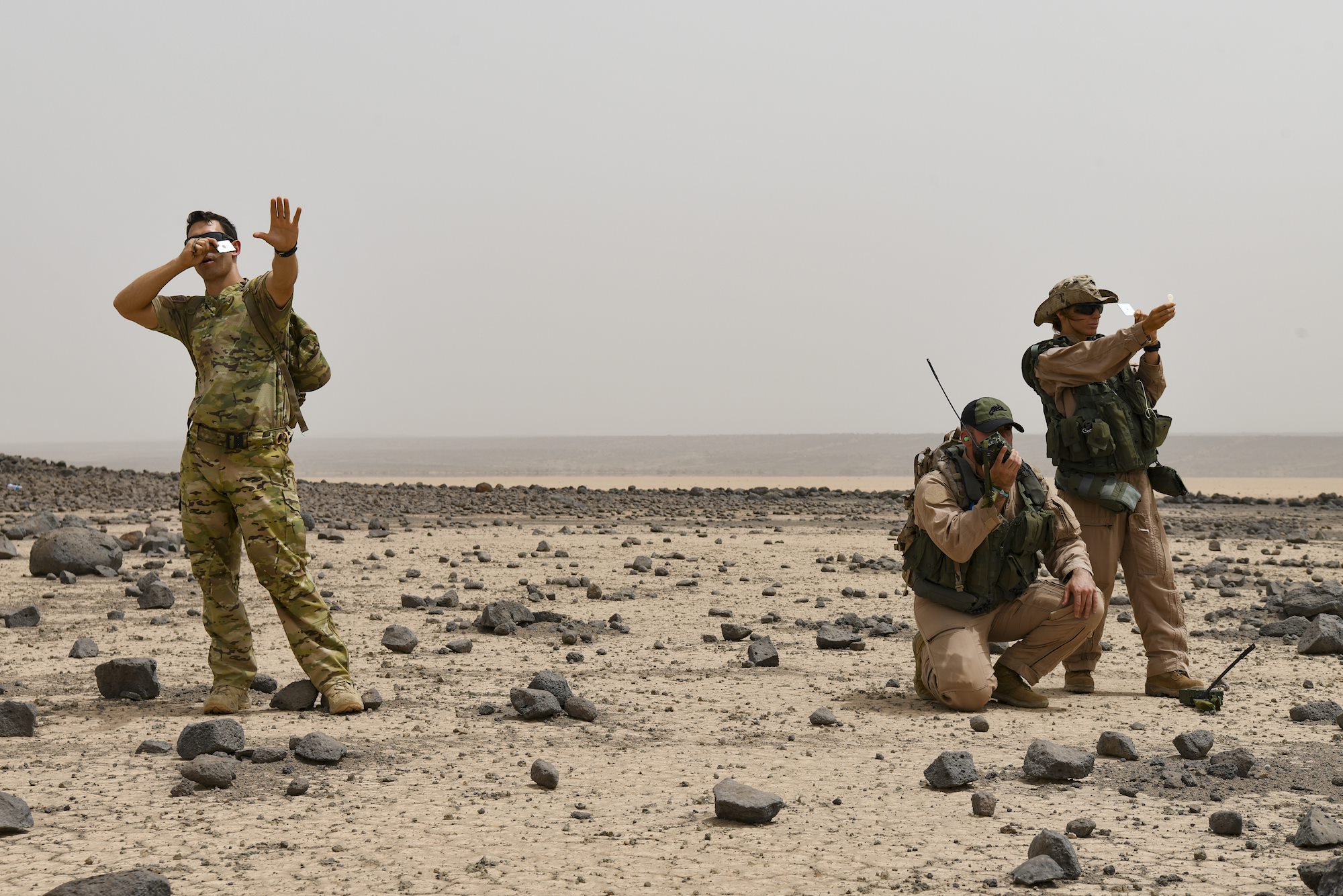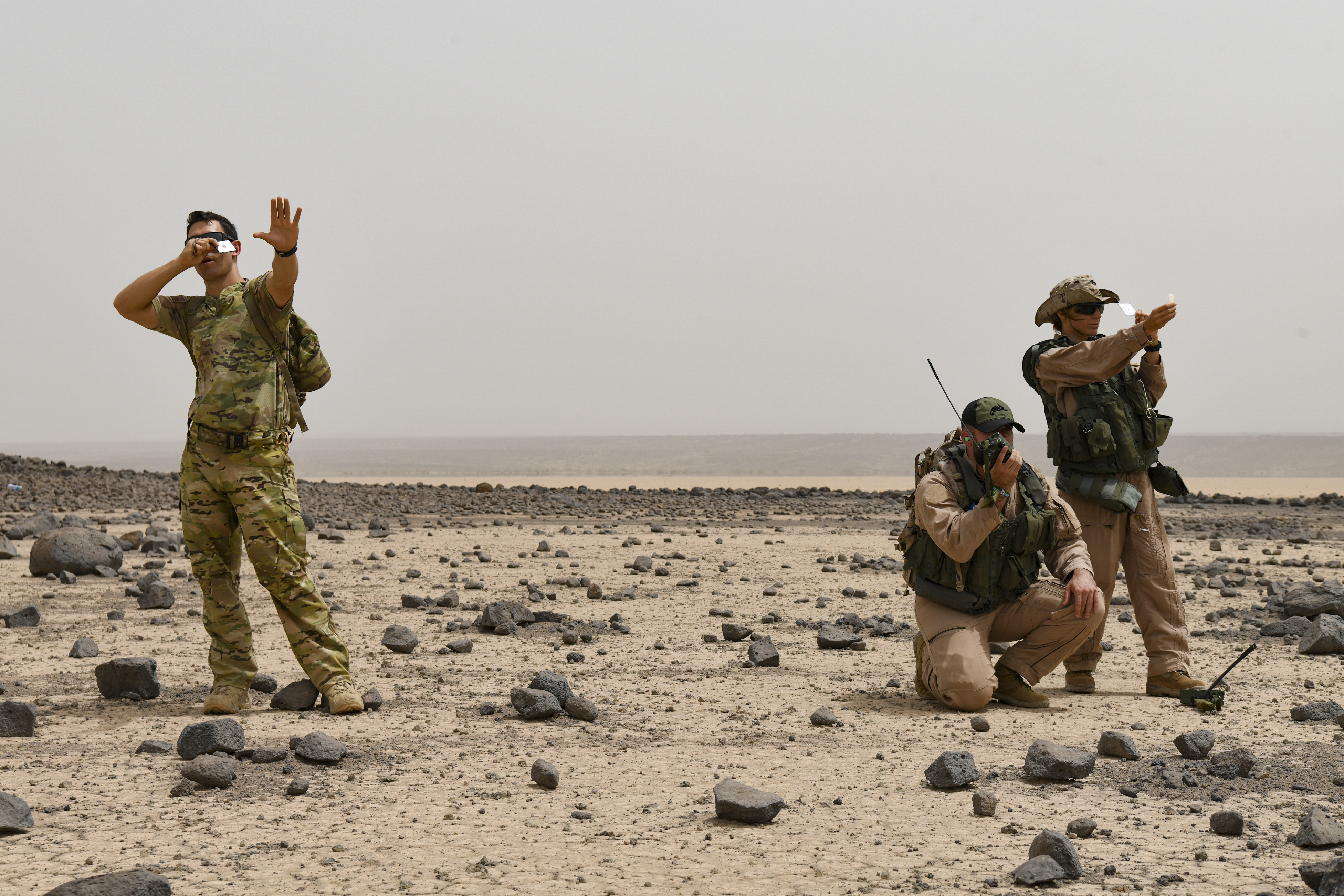 U.S. Air Force Tech. Sgt Matthew Carlino, a Combined Joint Task Force – Horn of Africa (CJTF-HOA) survival, evasion, resistance and escape specialist, uses a signal mirror during Exercise Bull Shark, Grand Bara, Djibouti, June 21, 2022. Exercise Bull Shark is a personnel recovery exercise involving members of CJTF-HOA and the European Union Naval Force aimed to strengthen interoperability between like-minded partners in the region; members of the Spanish Armed Forces and Djibouti Armed Forces also participated in the exercise this iteration. (U.S. Air Force photo by Senior Airman Blake Wiles)