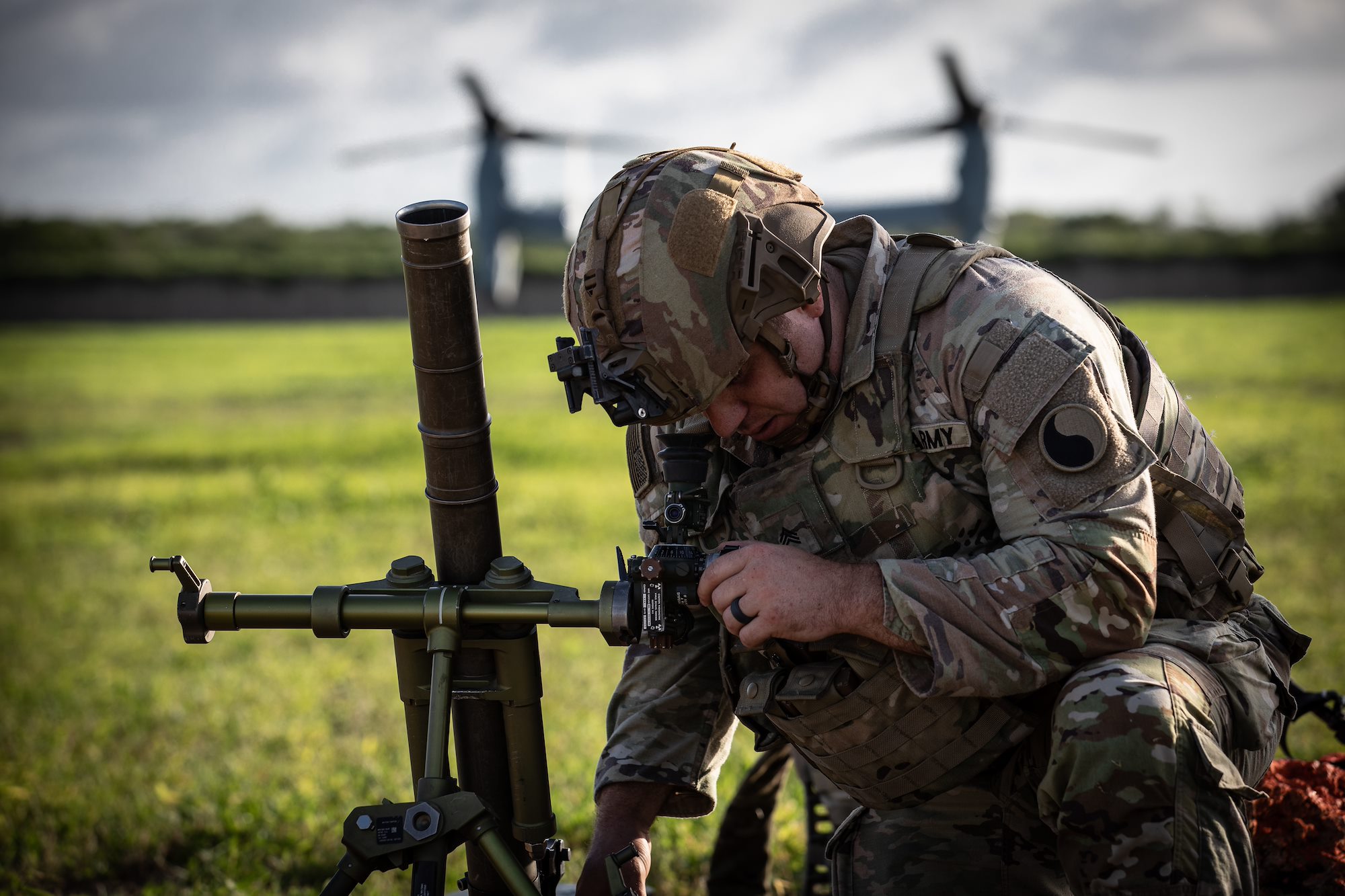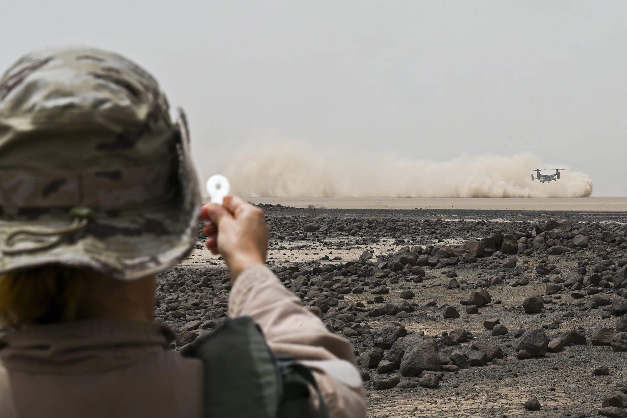 A Spanish Armed Forces soldier signals an MV-22 Osprey during Exercise Bull Shark, Grand Bara, Djibouti, June 21, 2022. Exercise Bull Shark is a personnel recovery exercise involving members of CJTF-HOA and the European Union Naval Force aimed to strengthen interoperability between like-minded partners in the region; members of the Spanish Armed Forces and Djibouti Armed Forces also participated in the exercise this iteration. (U.S. Air Force photo by Senior Airman Blake Wiles)