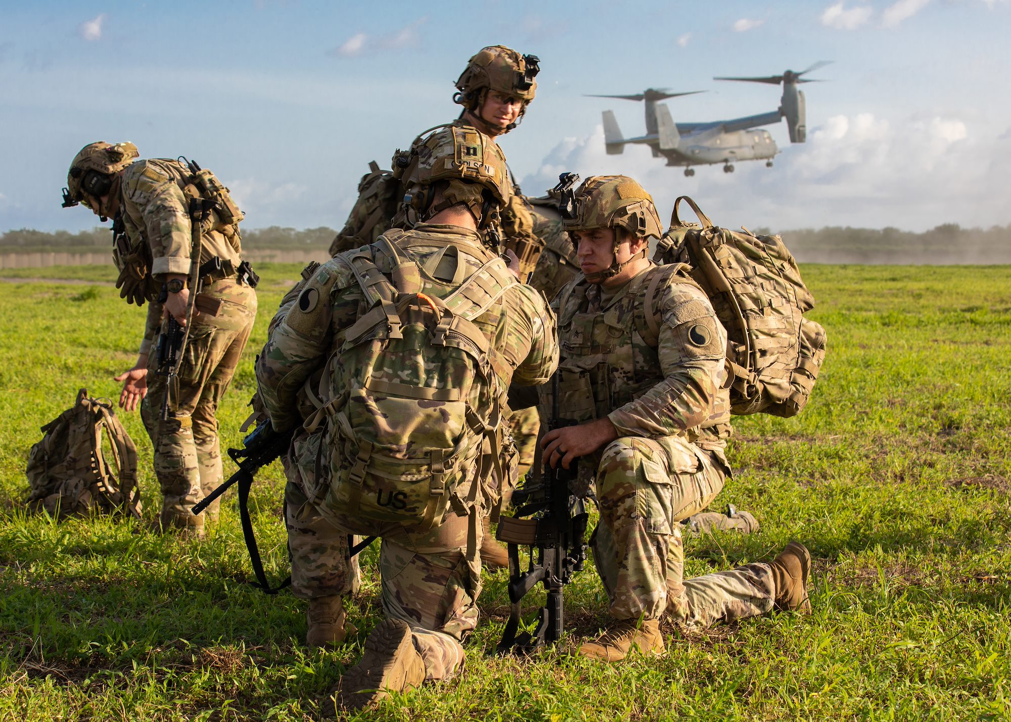 Spanish Armed Forces soldiers and U.S. Air Force Tech. Sgt Matthew Carlino, a Combined Joint Task Force – Horn of Africa (CJTF-HOA) survival, evasion, resistance and escape specialist, signal an MV-22 Osprey during Exercise Bull Shark, Grand Bara, Djibouti, June 21, 2022. Exercise Bull Shark is a personnel recovery exercise involving members of CJTF-HOA and the European Union Naval Force aimed to strengthen interoperability between like-minded partners in the region; members of the Spanish Armed Forces and Djibouti Armed Forces also participated in the exercise this iteration. (U.S. Air Force photo by Senior Airman Blake Wiles)