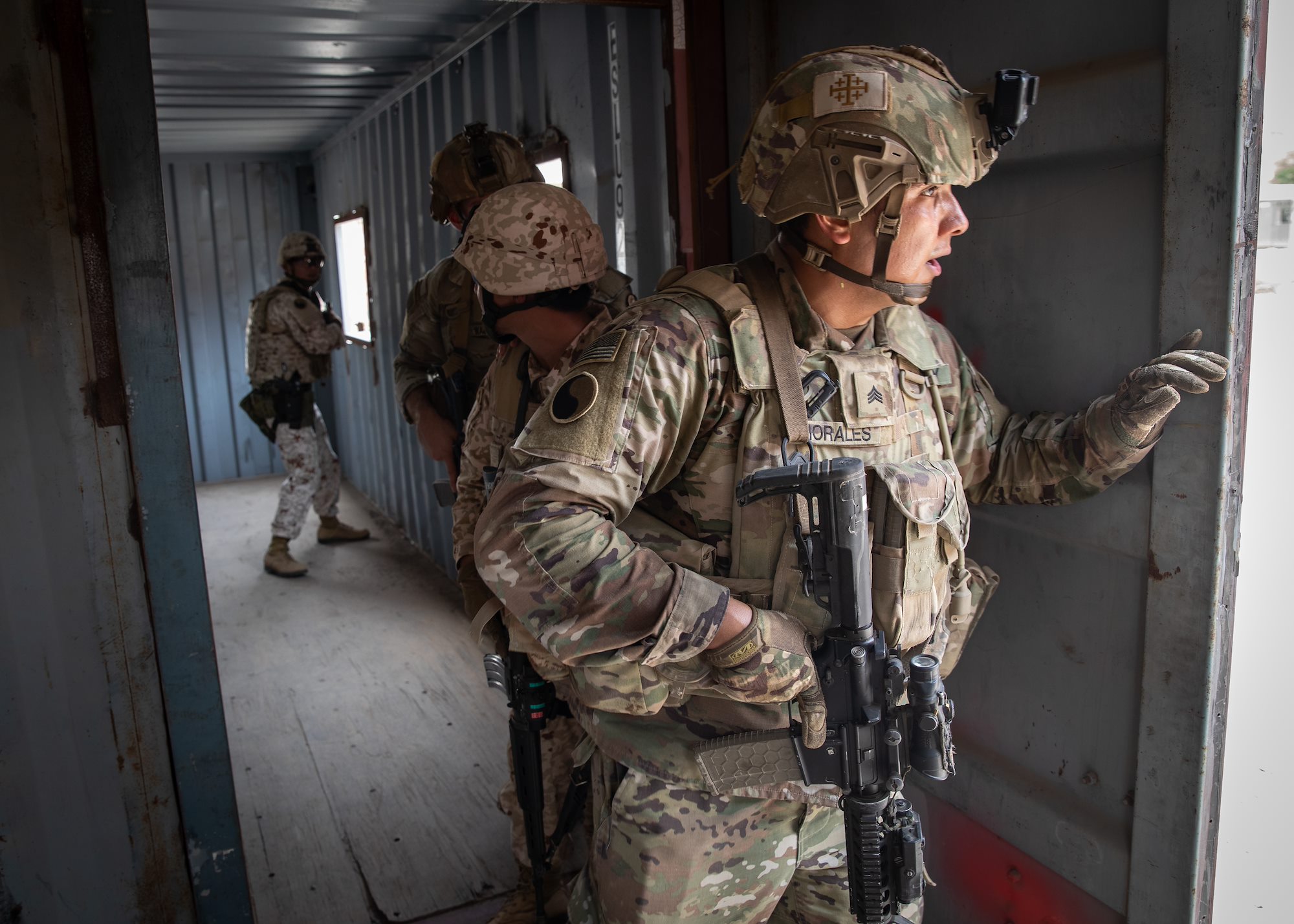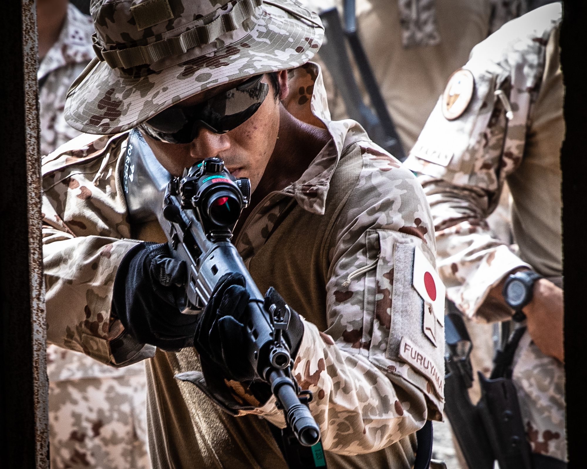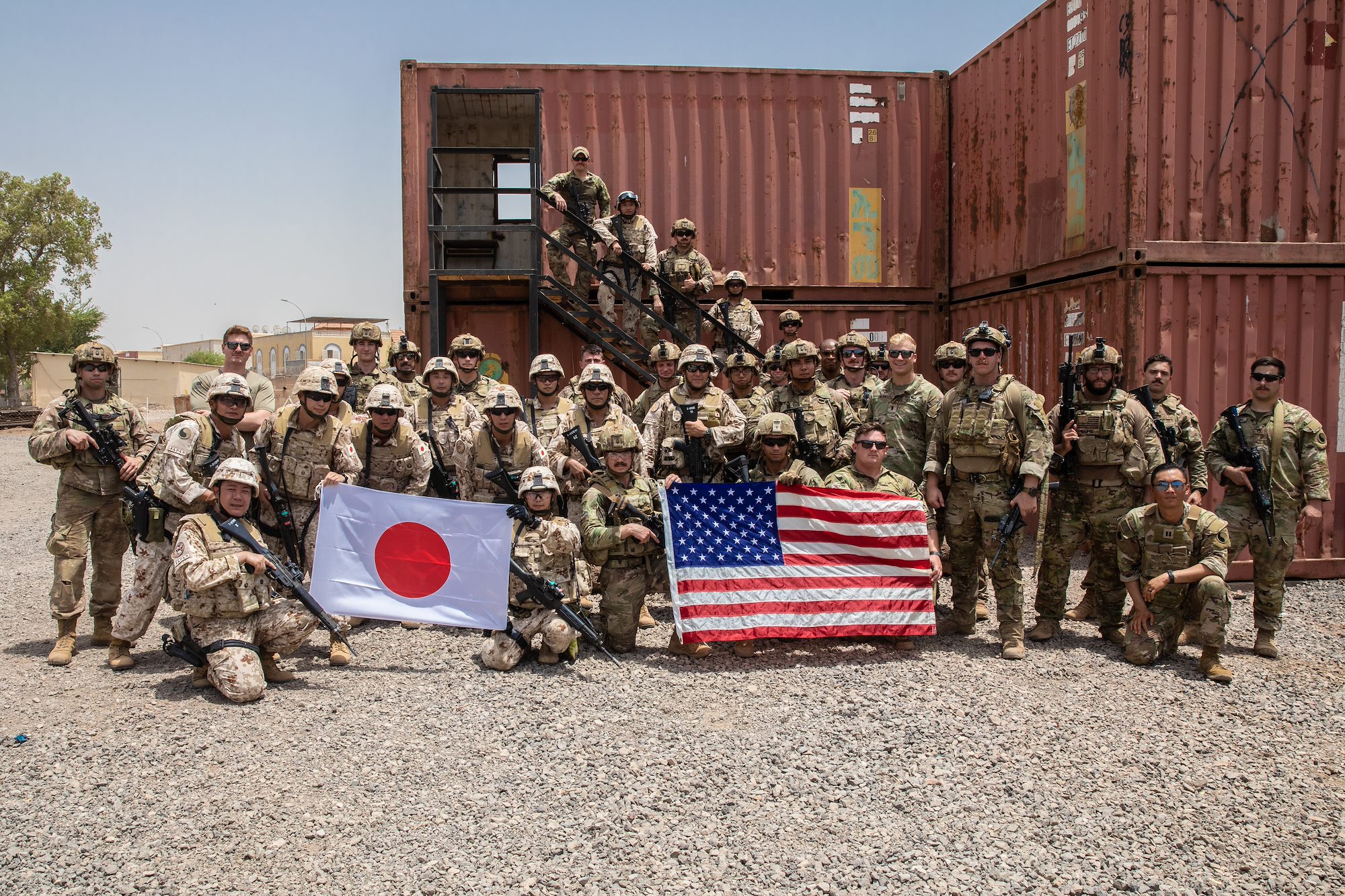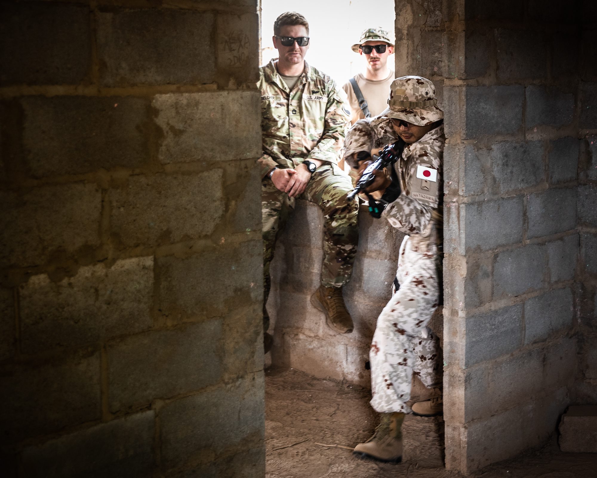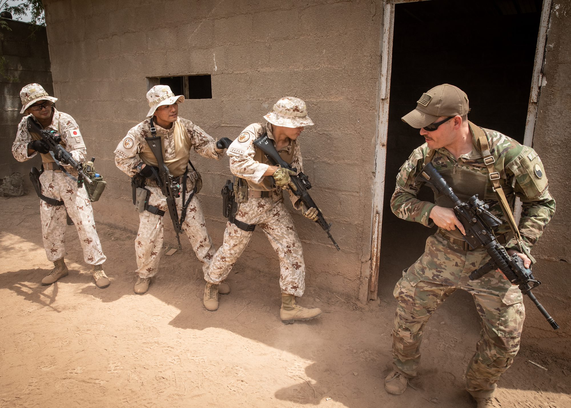 Virginia Army National Guard Soldiers with Task Force Red Dragon, Combined Joint Task Force - Horn of Africa, and members of the Japan Ground Self-Defense Force (JGSDF) exchange knowledge on close-quarters combat at the French 5th Overseas Interarms Regiment base, Djibouti, June 23, 2022. Members of the CJTF-HOA regularly train and work alongside allies, partners, and government organizations to achieve a unified effort to improve safety, security and prosperity in East Africa. (U.S. Army National Guard photo by Staff Sgt. Jeff Clements)