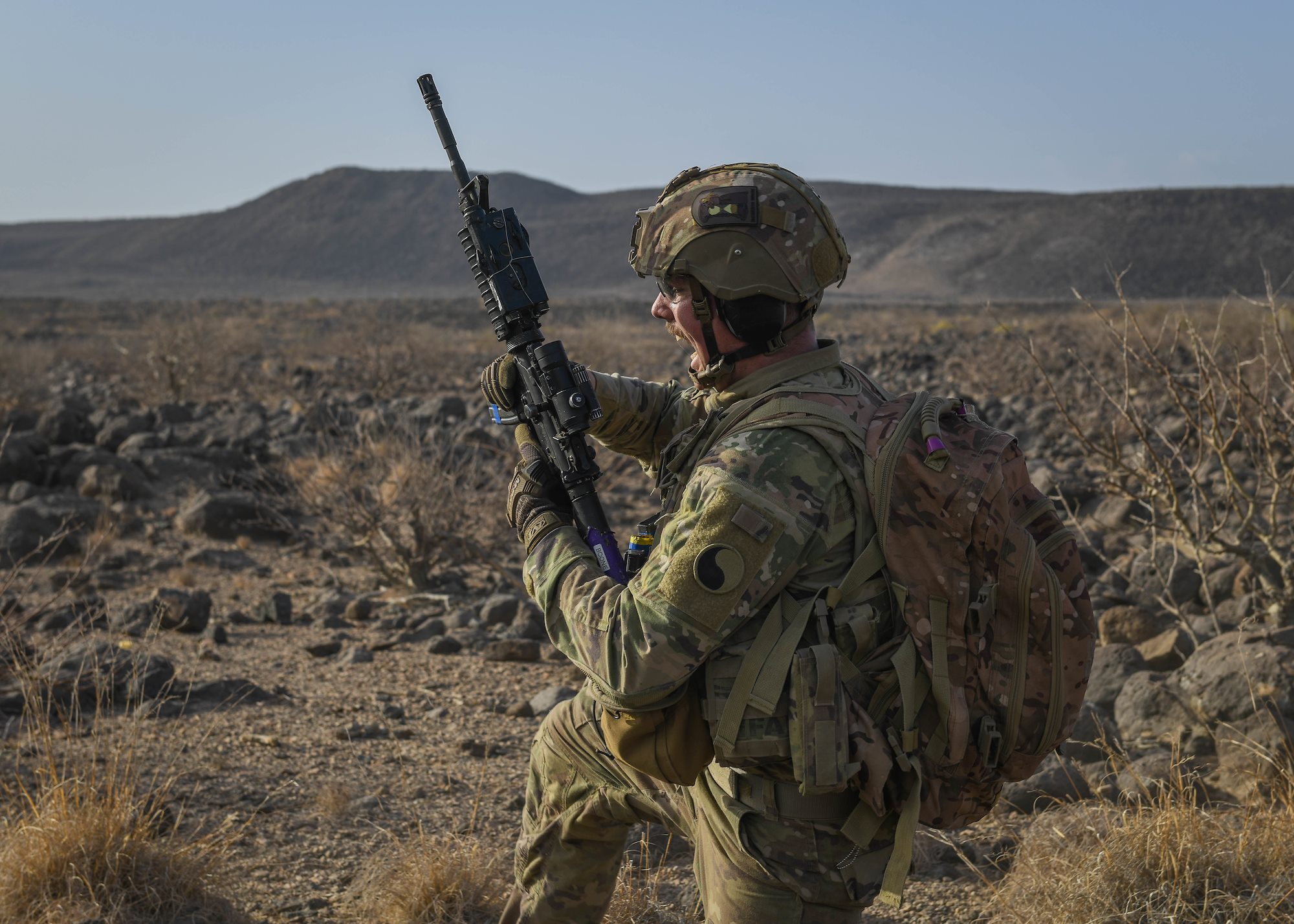 Kentucky Army National Guard Sgt. 1st Class Corey Stawser with Task Force Red Dragon, Combined Joint Task Force - Horn of Africa (CJTF-HOA), conducts a squad live-fire exercise in Djibouti at Arta range complex, Djibouti, June 8, 2022. CJTF-HOA, operating from Camp Lemonnier, Djibouti, is a dynamic operational headquarters, supporting missions to counter violent extremist organizations, responding to crises and enhancing stability in East Africa. (U.S. Army photo by Spc. Kiersten Breunig)