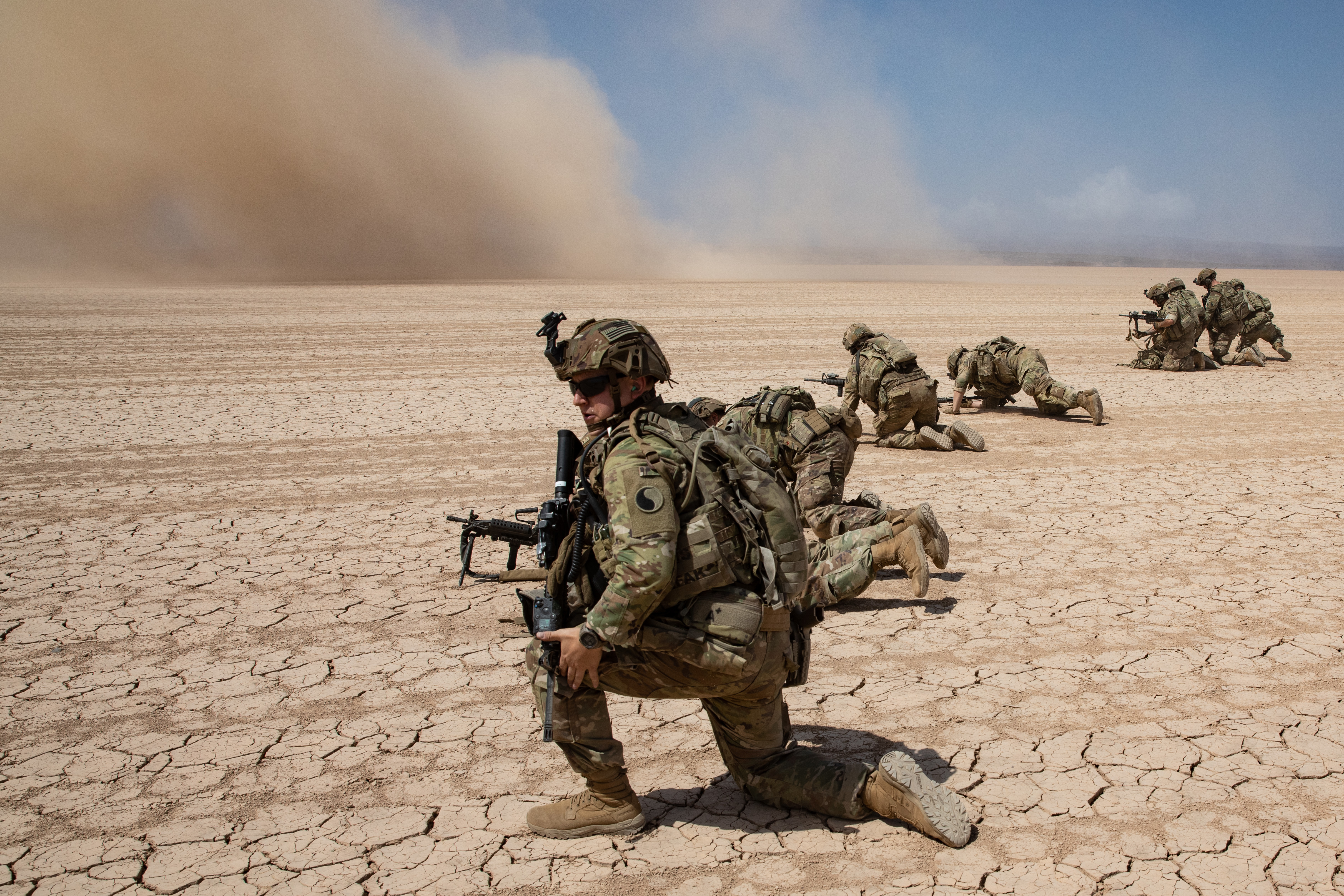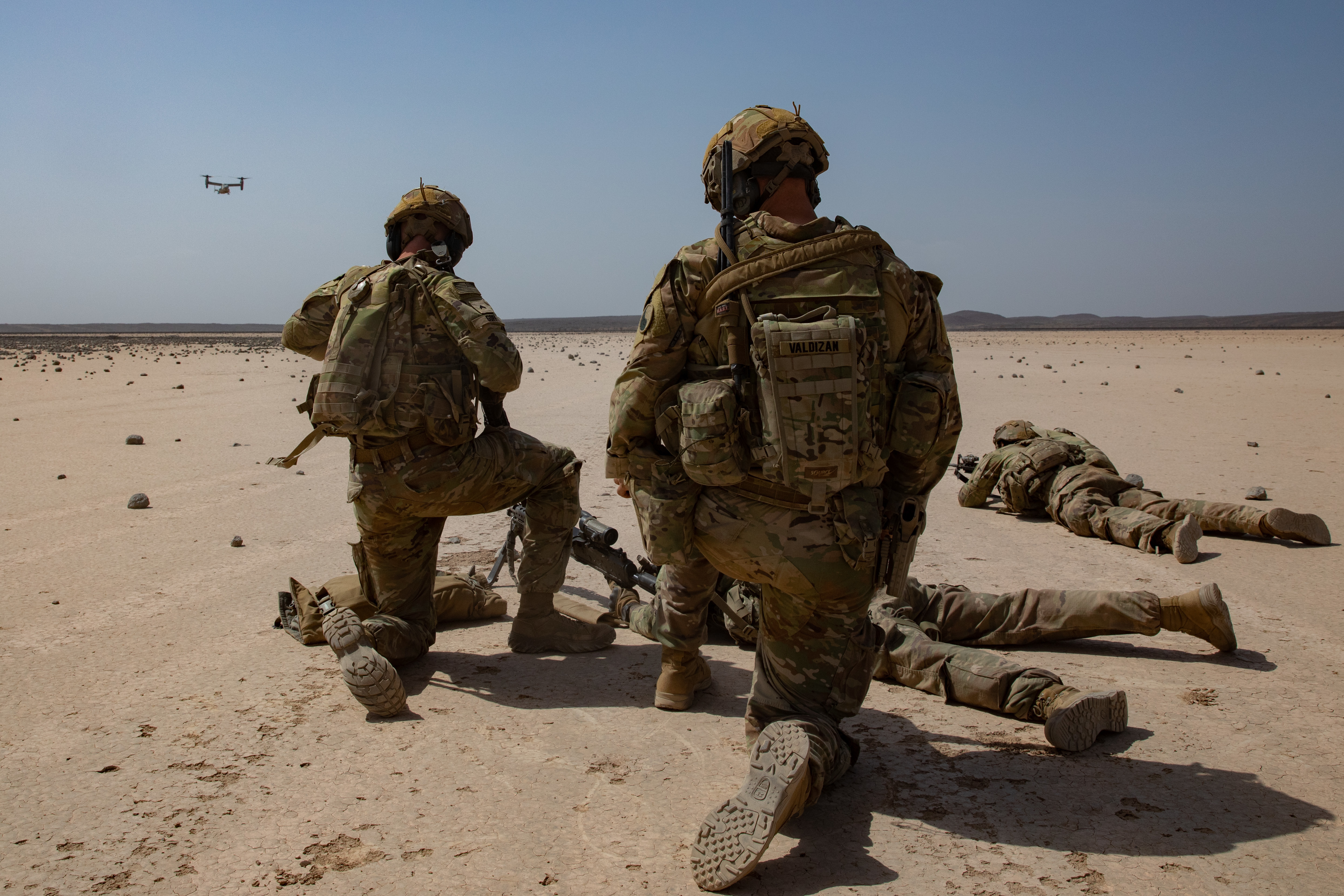 (CJTF-HOA), set security positions during an air assault with the U.S. Marine Corps Marine Medium Tiltrotor Squadron-161 (VMM-161) in the Grand Bara Desert, Feb. 8, 2022. The EARF is postured to