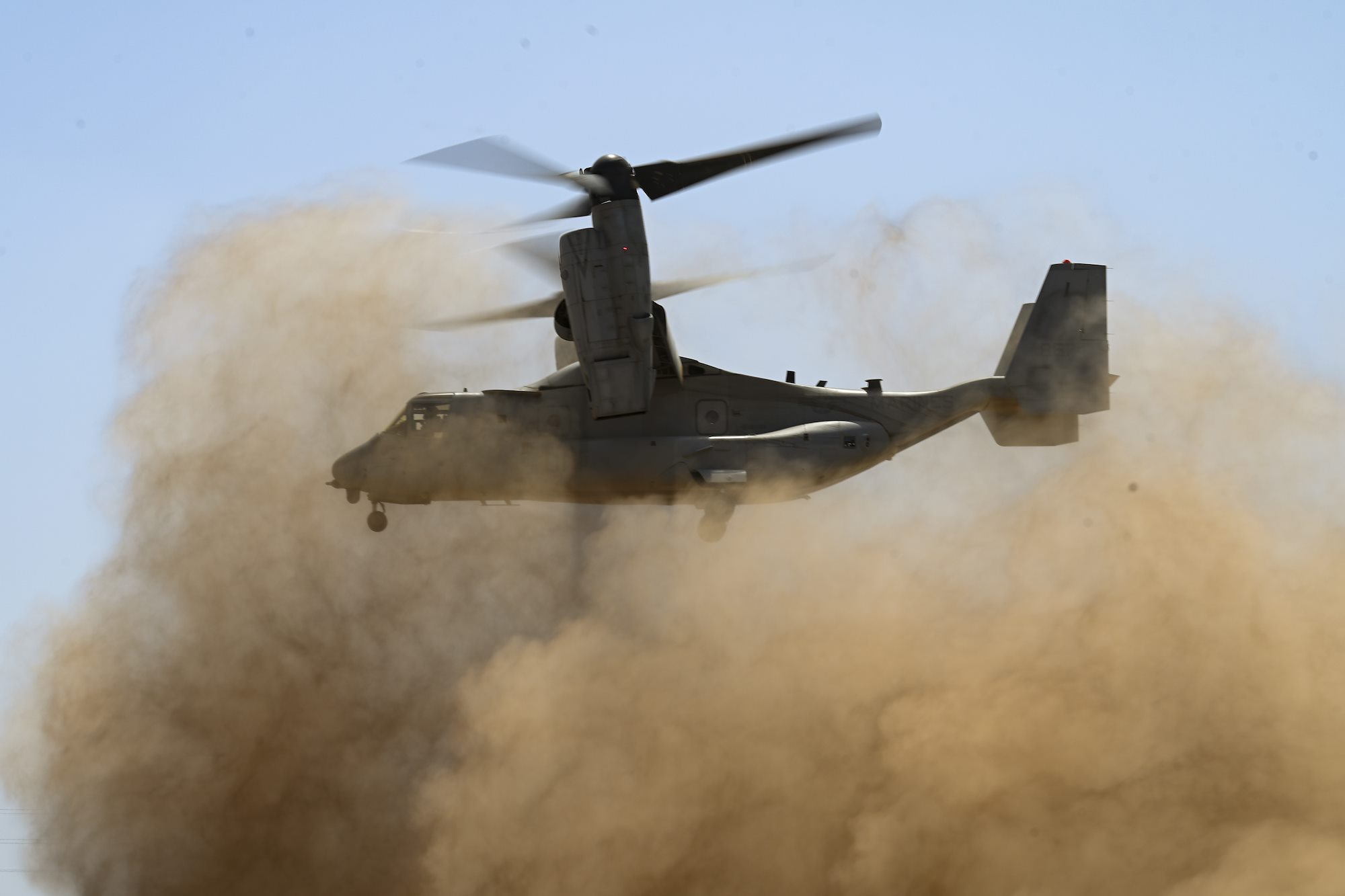 An MV-22B Opsrey tiltrotor aircraft assigned to Marine Medium Tiltrotor Squadron 161 (VMM-161) takes off at Quaid Range, Djibouti, Feb. 9, 2022. The Ospreys support the Combined Joint Task Force - Horn of Africa (CJTF-HOA) by providing personnel recovery and casualty evacuation of U.S. Forces throughout East Africa. (U.S. Air Force photo by Senior Airman Blake Wiles)
