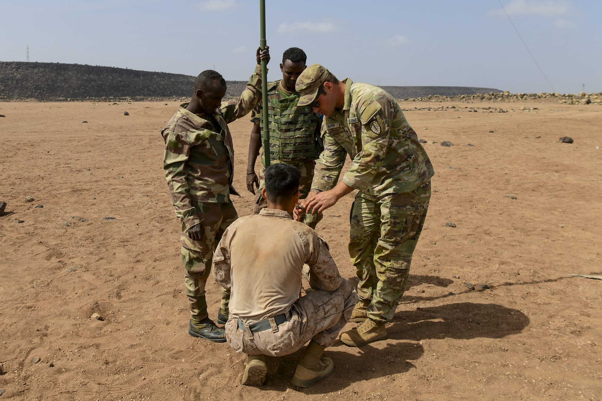 U.S. service members work with Djiboutian Bataillon d'intervention rapide (BIR) to construct a high frequency signal antenna during a joint command and control exercise at Quaid Range, Djibouti, Feb. 9, 2022. The members of the BIR used this exercise as an opportunity to demonstrate their effectiveness in a field environment and establish standard operating procedures for future use. The multi-day exercise demonstrated the Marine Air Control Group Detachment East Africa Air Combat Element’s ability to rapidly conduct command and control operations in a forward deployed location. (U.S. Air Force photo by Senior Airman Blake Wiles)