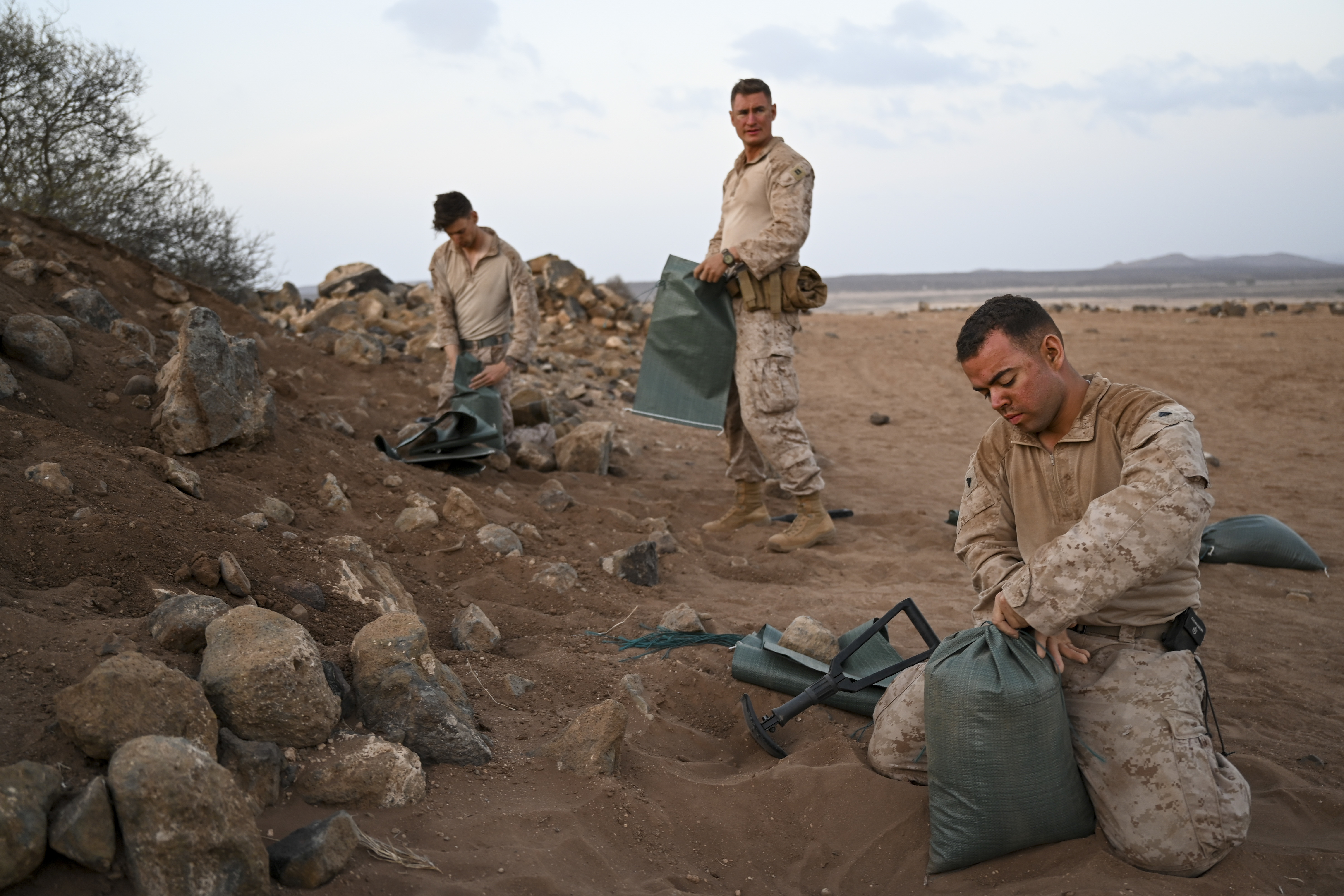 U.S. Marines with the Marine Air Control Group Detachment East Africa Air Combat Element, fill sandbags during a joint command and control exercise at Quaid Range, Djibouti, Feb. 8, 2022. The multi-day exercise demonstrated the MACG’s ability to rapidly conduct command and control operations in a forward deployed location. (U.S. Air Force photo by Senior Airman Blake Wiles)