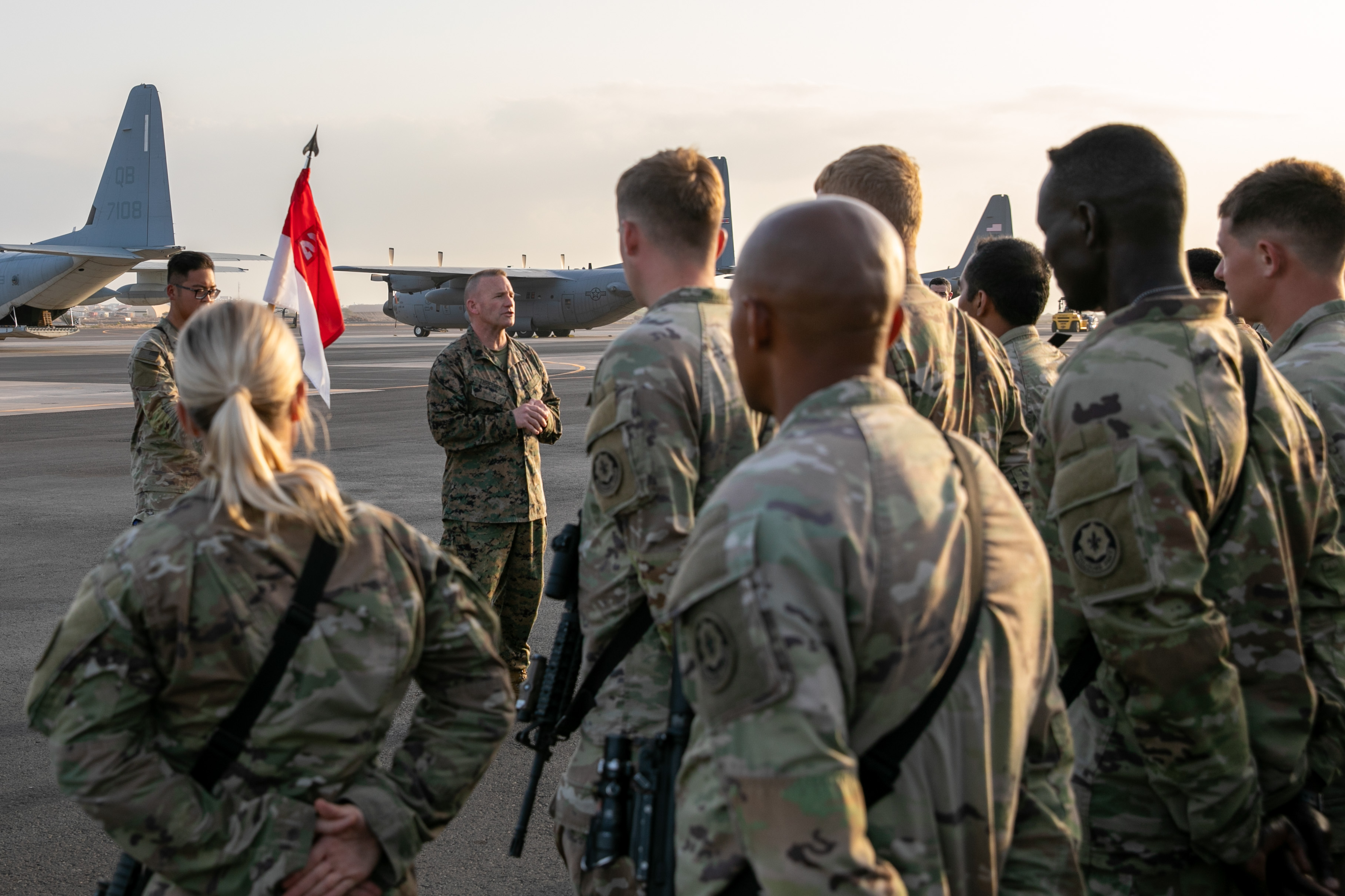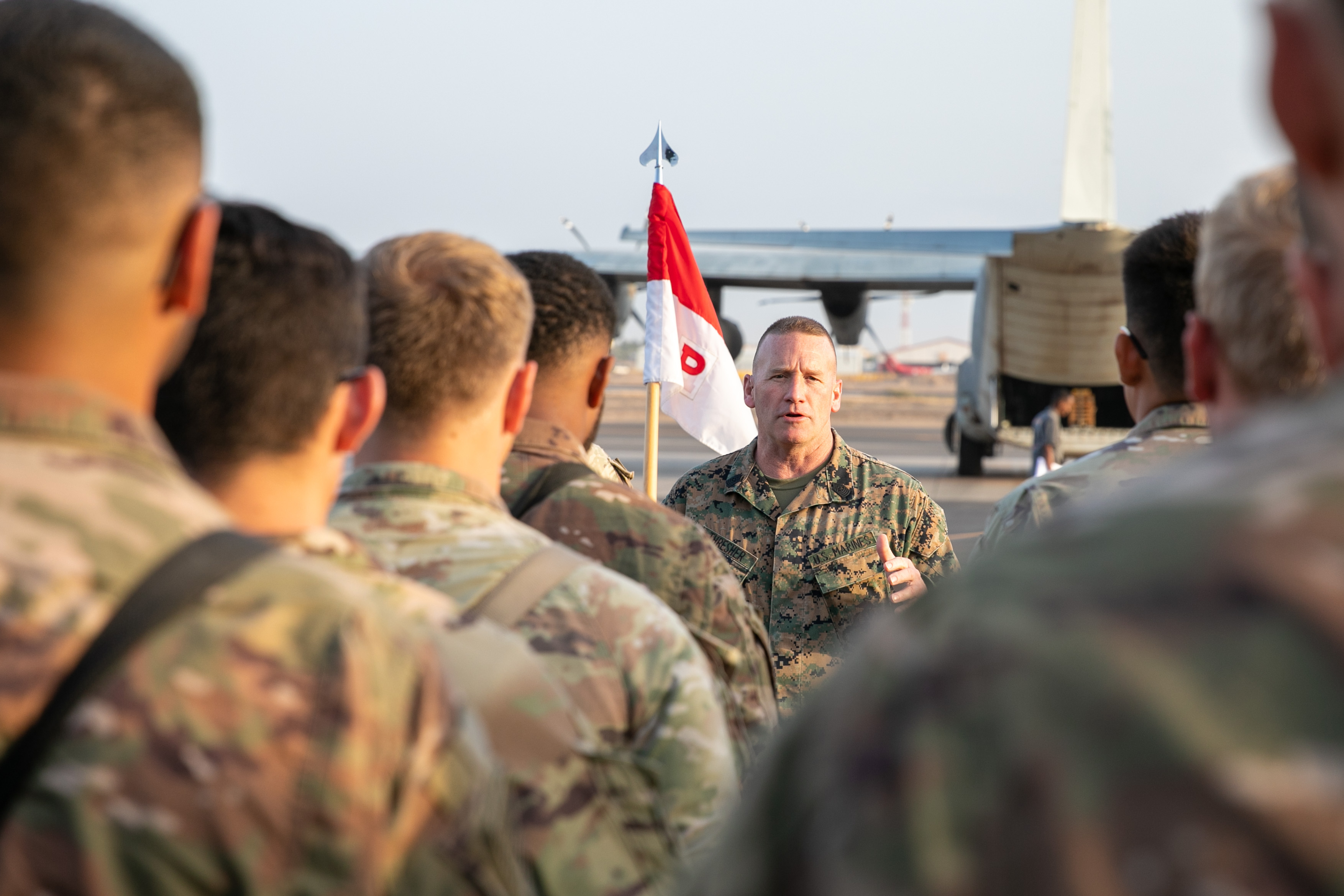 U.S. Marine Corps Sgt. Maj. Richard Thresher, U.S. Africa Command (AFRICOM) command senior enlisted leader, talks with soldiers assigned to the 2nd Cavalry Regiment (2CR) at Camp Lemonnier, Djibouti, Feb. 17, 2022. Thresher and U.S. Army Gen. Stephen Townsend, U.S. AFRICOM commander, greeted the Soldiers as the leaders concluded their multi-country trip to East Africa. The 2CR traveled through Djibouti after finishing a rotation as the security forces at Camp Simba, Kenya. (U.S. Army National Guard photo by Spc. Gauret Stearns)