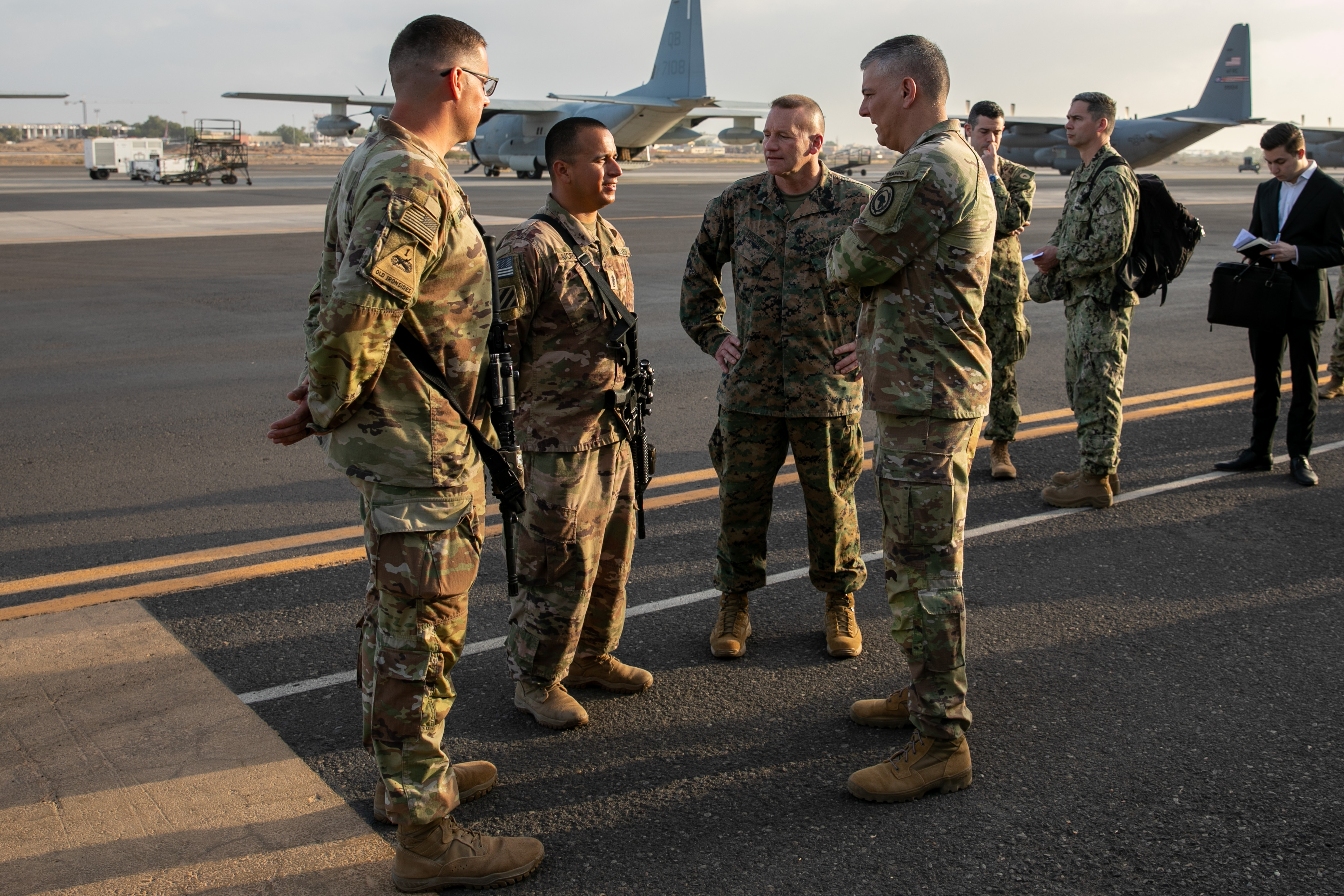 U.S. Army Gen. Stephen Townsend, U.S. Africa Command (AFRICOM) commander, and U.S. Marine Corps Sgt. Maj. Richard Thresher, U.S. AFRICOM command senior enlisted leader, meet soldiers assigned to the 2nd Cavalry Regiment (2CR) at Camp Lemonnier, Djibouti, Feb. 17, 2022. Townsend and Thresher greeted the Soldiers as the leaders concluded their multi-country trip to East Africa. The 2CR traveled through Djibouti after finishing a rotation as the security forces at Camp Simba, Kenya. (U.S. Army National Guard photo by Spc. Gauret Stearns)