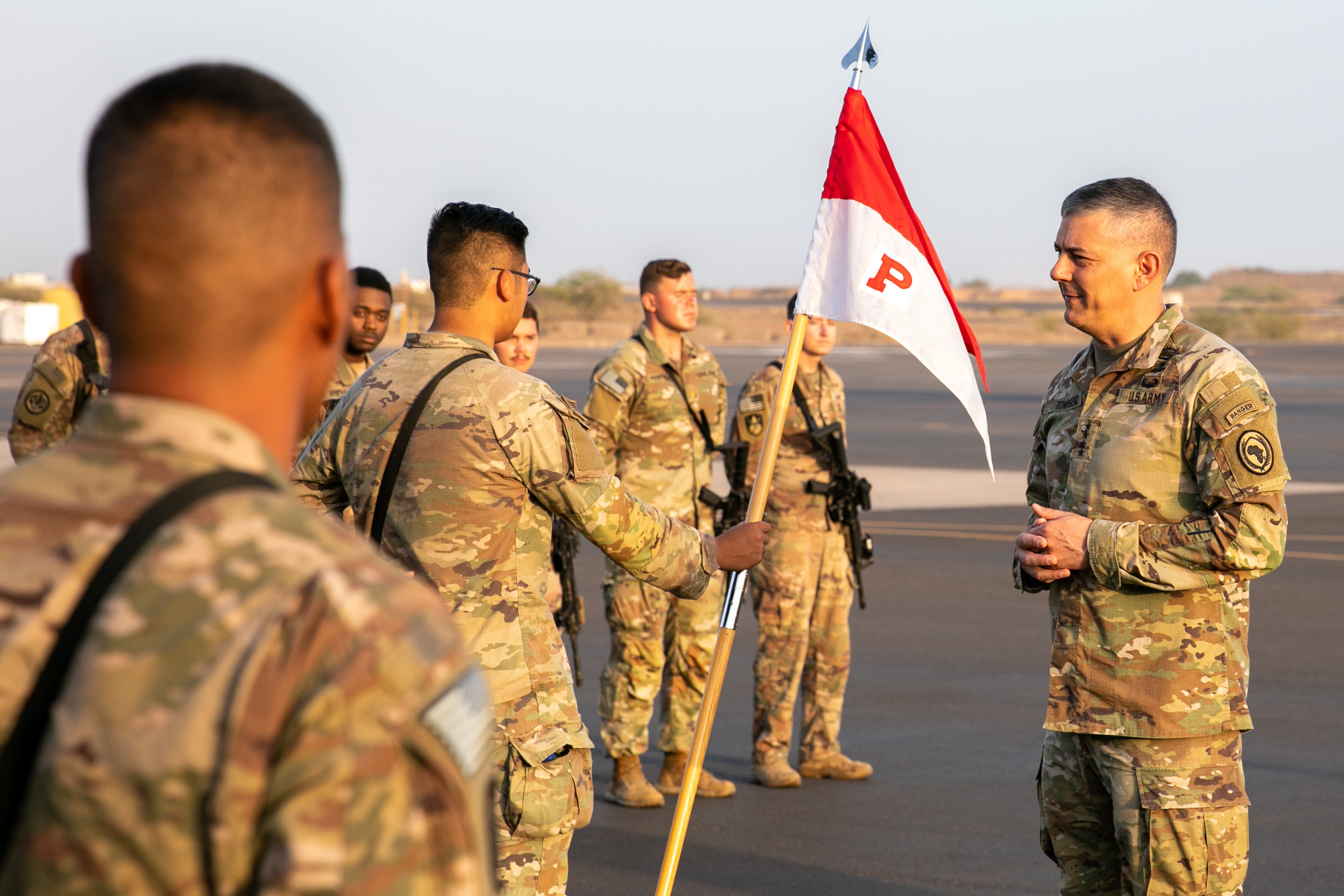U.S. Army Gen. Stephen Townsend, U.S. Africa Command (AFRICOM) commander, greets soldiers assigned to the 2nd Cavalry Regiment (2CR) at Camp Lemonnier, Djibouti, Feb. 17, 2022. Townsend greeted the Soldiers as he concluded his multi-country trip to East Africa. The 2CR traveled through Djibouti after finishing a rotation as the security forces at Camp Simba, Kenya. (U.S. Army National Guard photo by Spc. Gauret Stearns)