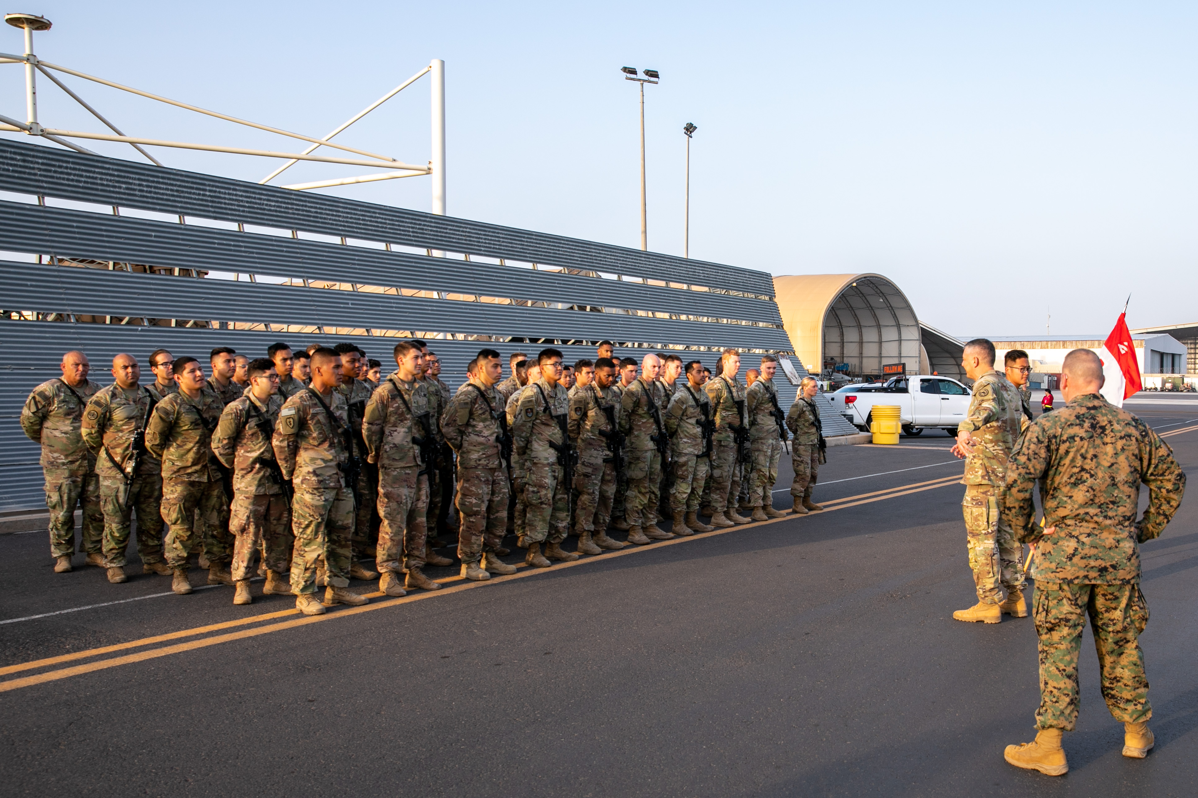 U.S. Army Maj. Gen. William L. Zana, commanding general of Combined Joint Task Force - Horn of Africa (CJTF-HOA), thanks his outgoing and welcomes his incoming Soldiers during a transfer of authority ceremony at Camp Lemonnier, Djibouti, Feb. 26, 2022. Soldiers from the Nebraska Army National Guard’s 67th Maneuver Enhancement Brigade (MEB) transferred authority of the CJTF-HOA mission over to the Illinois Army National Guard’s 404th MEB. (U.S. Air Force photo by Senior Airman Blake Wiles)