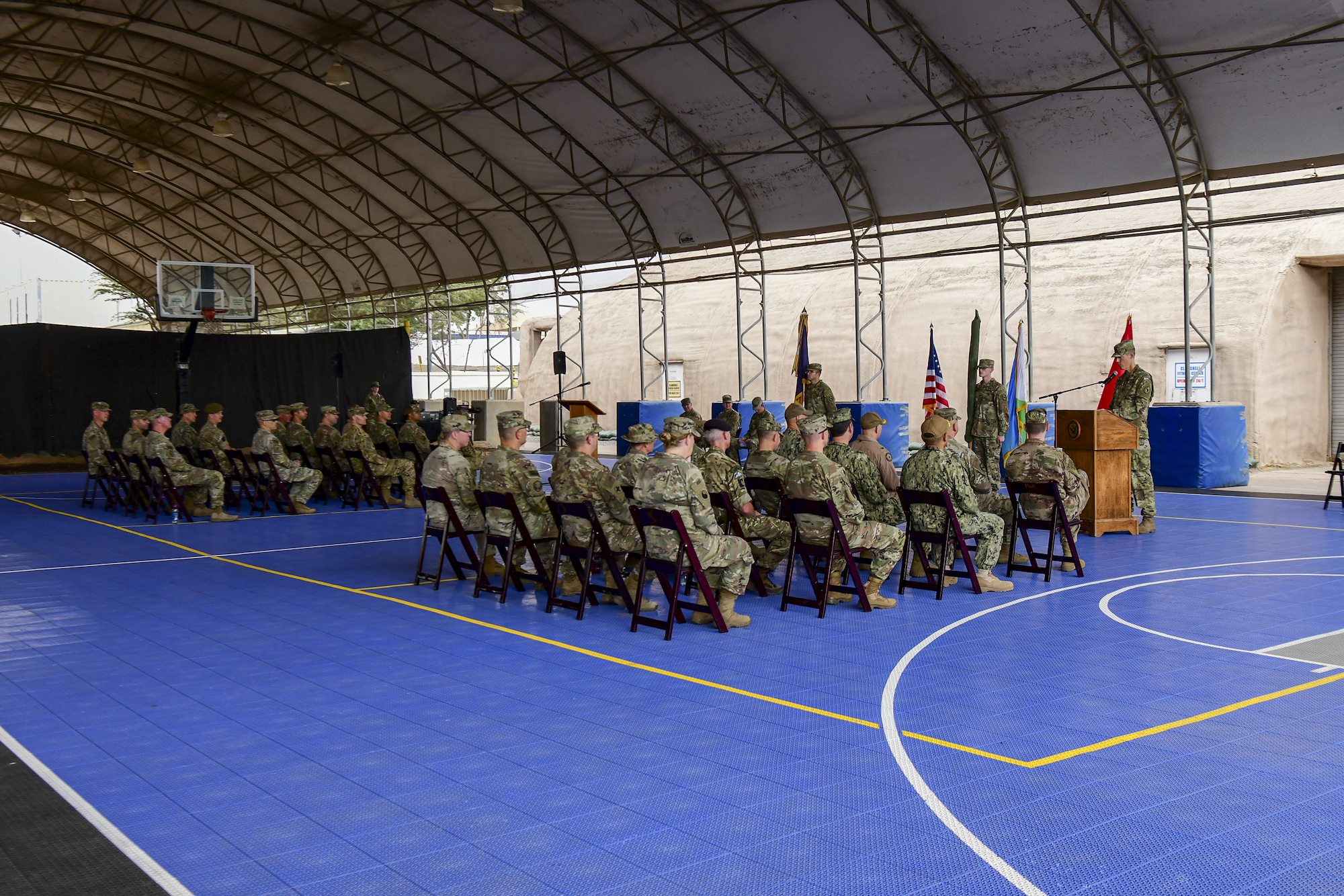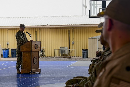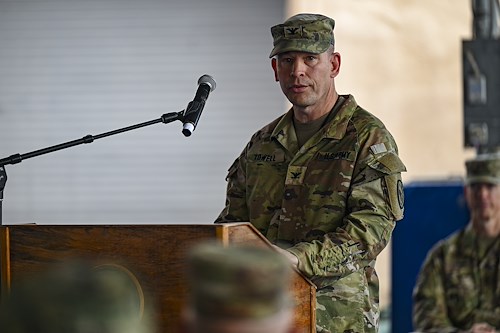 U.S. Army Col. Justin Towell, incoming chief of staff of Combined Joint Task Force – Horn of Africa, provides remarks during a transfer of authority ceremony at Camp Lemonnier, Djibouti, Feb. 26, 2022. As chief of staff, Towell will lead the 404th Maneuver Enhancement Brigade to improve relationships with partner nations through supporting security, mobility and functional operations of forces throughout the Horn of Africa. (U.S. Air Force photo by Senior Airman Blake Wiles)
