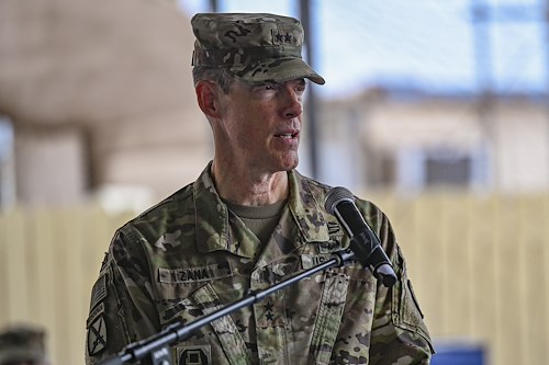 U.S. Army Maj. Gen. William L. Zana, commanding general of Combined Joint Task Force - Horn of Africa (CJTF-HOA), provides remarks during a transfer of authority ceremony at Camp Lemonnier, Djibouti, Feb. 26, 2022. Soldiers from the Nebraska Army National Guard’s 67th Maneuver Enhancement Brigade (MEB) transferred authority of the CJTF-HOA mission over to the Illinois Army National Guard’s 404th MEB. (U.S. Air Force photo by Senior Airman Blake Wiles)